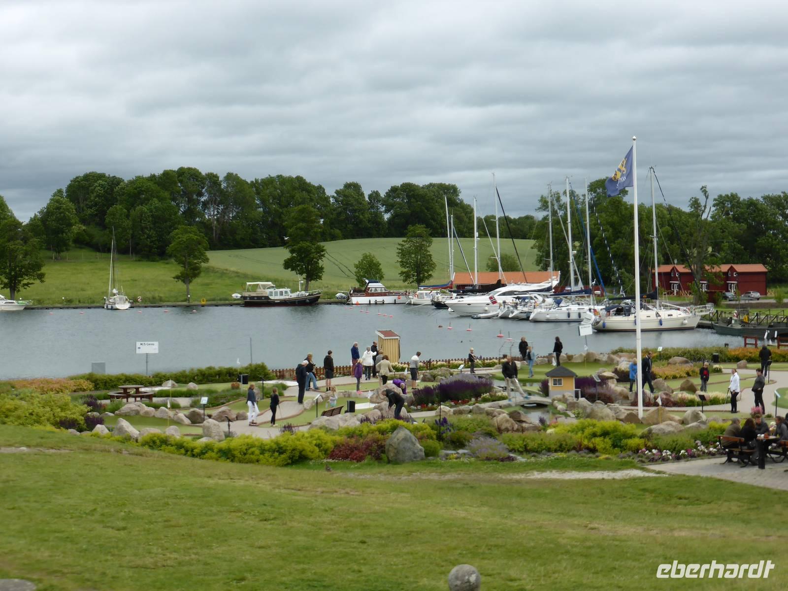 Am nächsten Morgen fuhren wir durch den Schärengürtel in den Hafen von Göteborg ein. Nach der Ankunft und dem Verlassen des Schiffes ging es in Richtung Boras und schwedische Seenplatte. Unsere Mittagspause legten wir am Rasthof Brahehus ein. Hier konnte man die berühmten rot-weißen Zuckerstangen aus Gränna kaufen und hatte von der romantischen Schlossruine aus einen fantastischen Blick auf den Vätternsee. Im Anschluss fuhren wir zum Runenstein von Röck und von dort nach Berg zur Schleusentreppe des Göta-Kanals. Hier sahen wir, wie die Schiffe in mehreren Schleusen einen Höhenunterschied von 10 - 15 Metern überwanden. Wir hatten gutes Wetter und genossen den Aufenthalt inmitten der schönen Seenlandschaft. Danach ging es zu unserem Hotel „Scandic Talk" am Stockholmer Messegelände. Zum Abendessen trafen wir Frank, den Busfahrer unserer Rundreise. Er löste Renè ab, der uns die ersten beiden Tage bis Stockholm gefahren hatte und von dem wir uns am nächsten Tag verabschiedeten.