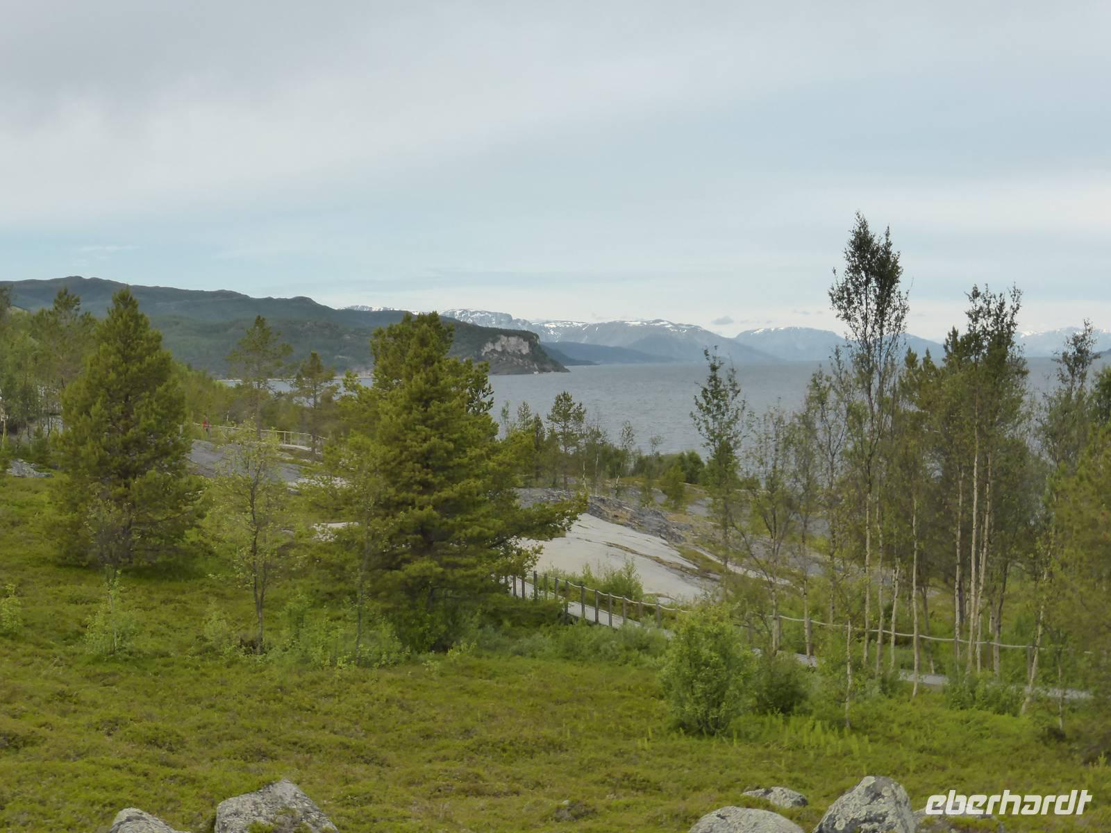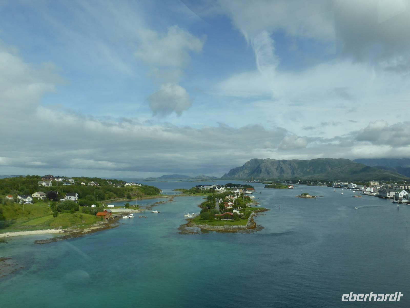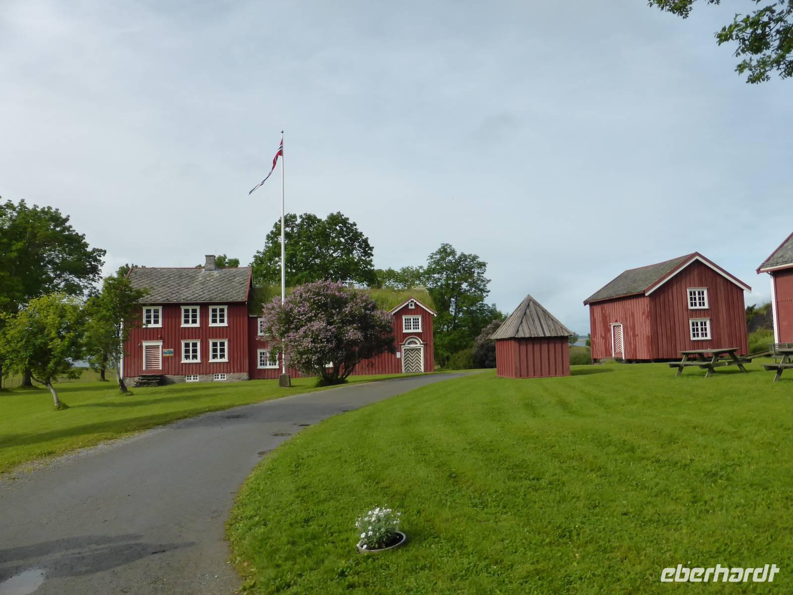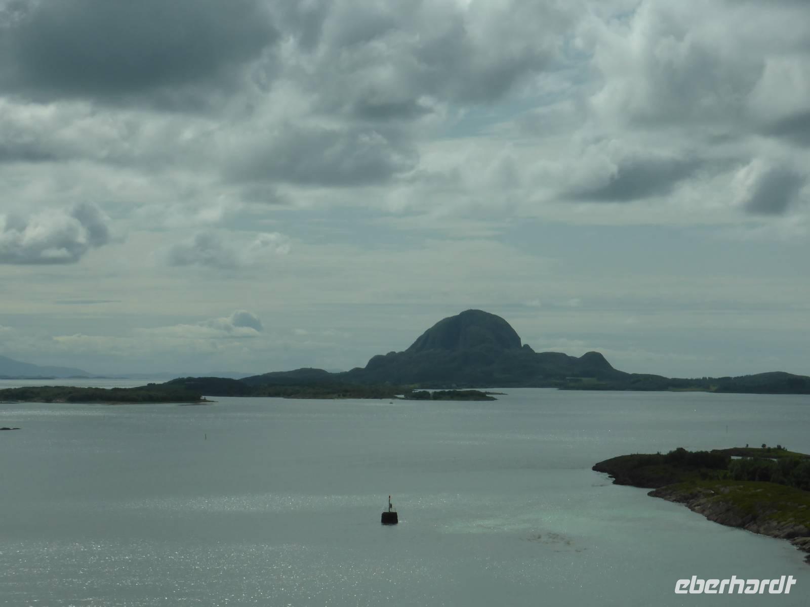 Am Morgen fuhren wir von Mo i Rana zunächst in südliche Richtung und später durch den fast 11 Kilometer langen Toventunnel nach Sandnessjoen. Dort gab es mit der weißen Helgelandbrücke, die sogar einmal zu Norwegens beliebtester Brücke gewählt worden war, eine architektonische Meisterleistung zu bewundern. Nach diesem Fotostopp fuhren wir an der Bergkette der „Sieben Schwestern" vorbei, von denen die Bergspitzen leider hinter Wolken verborgen blieben, und hielten am „Petter-Dass-Museum", nahe der Ortschaft Alstahaug. Sehenswert sind in diesem schönen Gelände die romanische Steinkirche aus dem 12.Jahrhundert, die alten Pfarrhäuser und das moderne „Petter Dass-Museum". Der Priester Petter Dass war vielleicht der bedeutendste norwegische Dichter Ende des 17. und Anfang des 18. Jahrhunderts. Von Alstahaug aus fuhren wir zu unserem Fährhafen nach Tjotta. Die einstündige Fahrt von Tjoetta nach Forvik war sehr angenehm und es boten sich viele schöne Fotomotive. Von unserem Ankunftshafen in Forvik ging es weiter zum nächsten Fährhafen nach Andalsvagen. Die zweite Fährpassage dauerte nur 20 Minuten. In Horn angekommen, machten wir einen Abstecher zum Berg „Torghatten", an dem wir auch unsere Mittagspause einlegten. Die Legende sagt, dass einst der König von Sömna seinen schützenden Hut vor das hübsche Mädchen Lekamoya warf, um es vor dem Pfeil des Hestmannes zu schützen. Der Pfeil durchbohrte genau in dem Moment den Hut, in dem die Sonne aufging und alles zu Stein erstarren ließ. Die Hutform des Torghatten ist heute noch gut zu erkennen und zu dem Loch im Fels kann man hinauf laufen.Die dritte und letzte Fähre brachte uns dann von Vennesund nach Holm. Bei unserer Weiterfahrt zu unserem Übernachtungsort in Steinkjer hielten wir anschließend am Namsen-Lachsaquarium. Leider hatte es bereits geschlossen, aber wir nutzten die Gelegenheit, um fantastische Aufnahmen vom Namsen-Fluss und vom Staudamm zu machen. Eine weitere Pause legten wir auf einem kleinen Parkplatz oberhalb des Flusses ein. Nach diesem erlebnisreichen Tag kamen wir am Abend in unserem Hotel Tingvold in Steinkjer an.