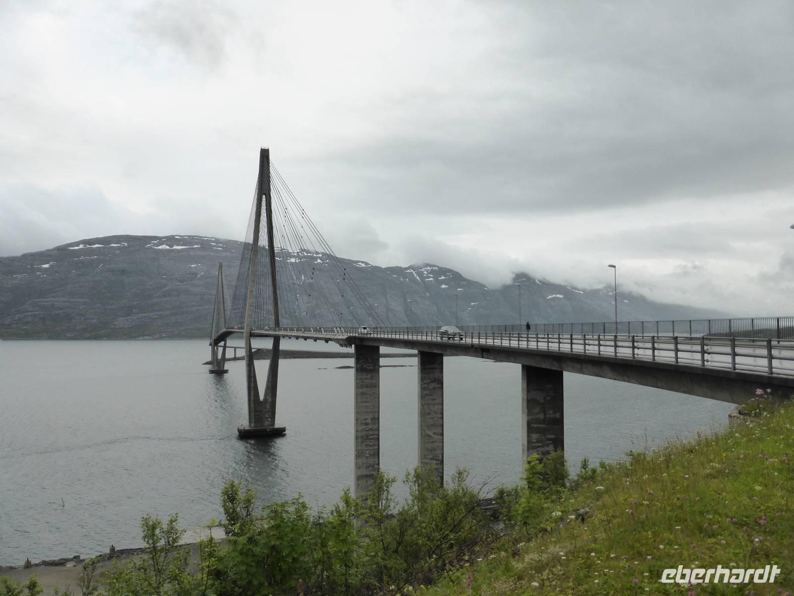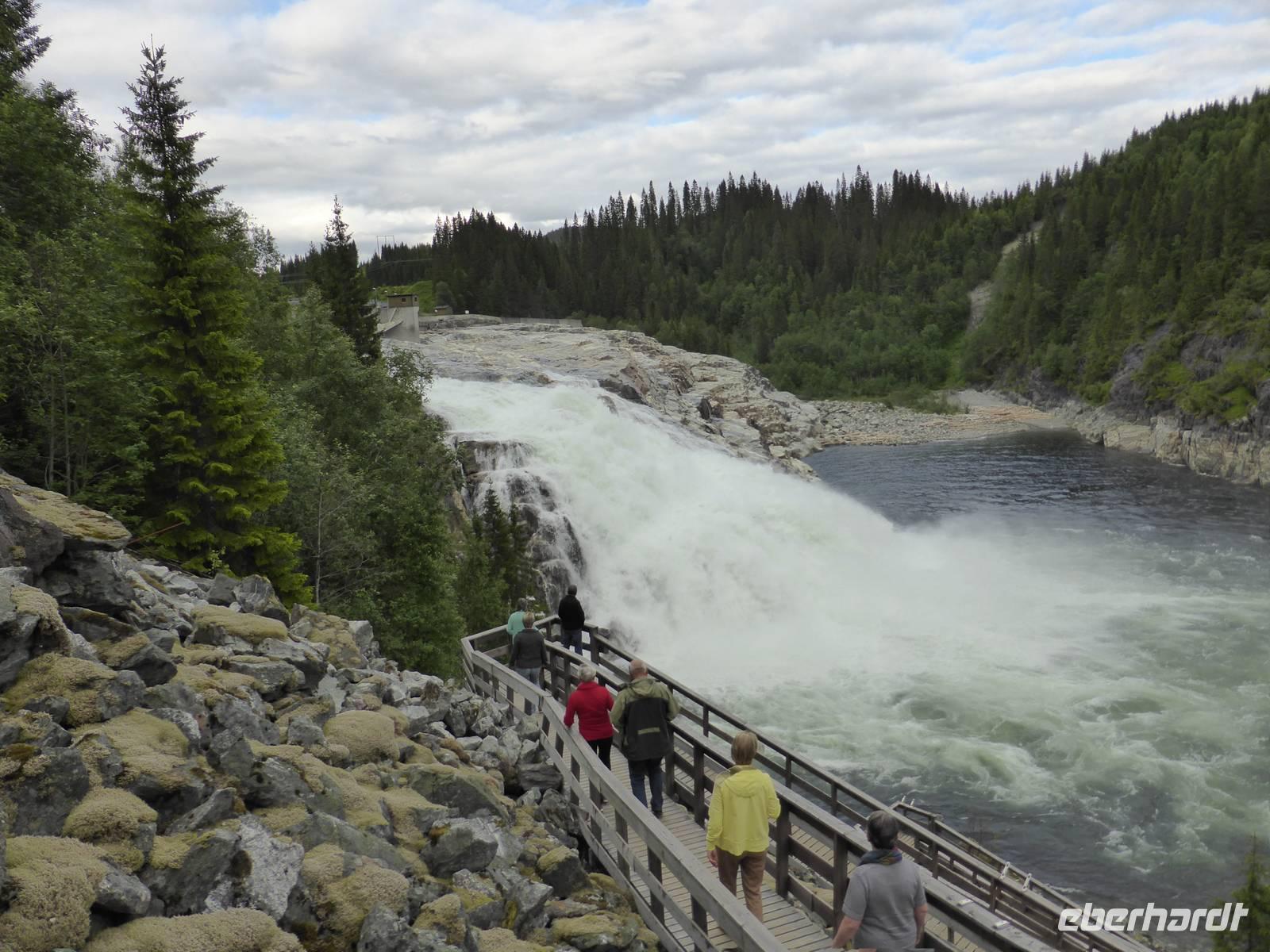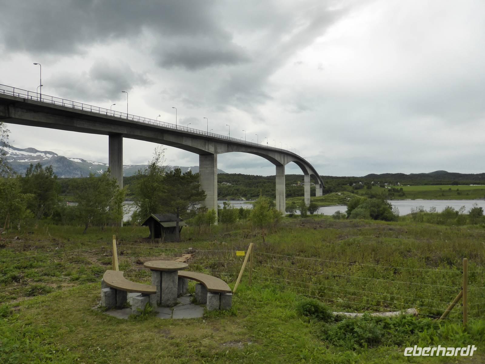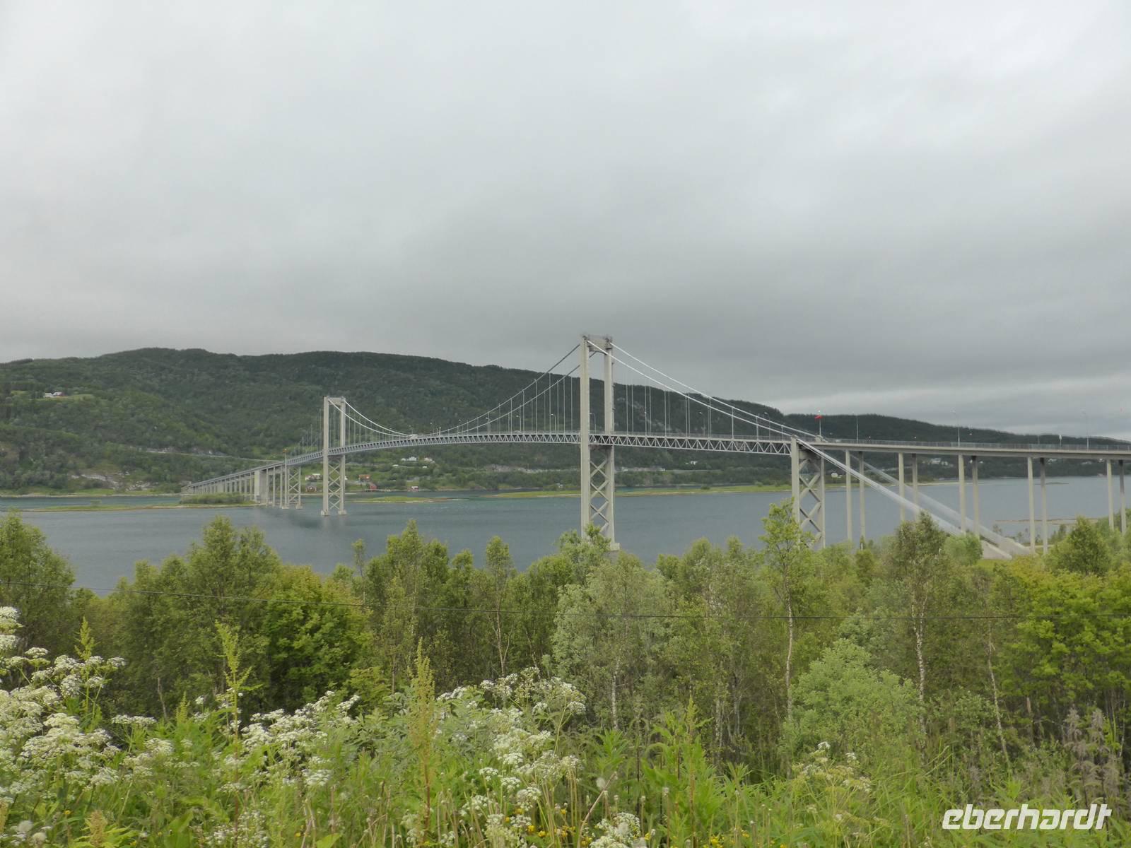 Am Morgen fuhren wir von Mo i Rana zunächst in südliche Richtung und später durch den fast 11 Kilometer langen Toventunnel nach Sandnessjoen. Dort gab es mit der weißen Helgelandbrücke, die sogar einmal zu Norwegens beliebtester Brücke gewählt worden war, eine architektonische Meisterleistung zu bewundern. Nach diesem Fotostopp fuhren wir an der Bergkette der „Sieben Schwestern" vorbei, von denen die Bergspitzen leider hinter Wolken verborgen blieben, und hielten am „Petter-Dass-Museum", nahe der Ortschaft Alstahaug. Sehenswert sind in diesem schönen Gelände die romanische Steinkirche aus dem 12.Jahrhundert, die alten Pfarrhäuser und das moderne „Petter Dass-Museum". Der Priester Petter Dass war vielleicht der bedeutendste norwegische Dichter Ende des 17. und Anfang des 18. Jahrhunderts. Von Alstahaug aus fuhren wir zu unserem Fährhafen nach Tjotta. Die einstündige Fahrt von Tjoetta nach Forvik war sehr angenehm und es boten sich viele schöne Fotomotive. Von unserem Ankunftshafen in Forvik ging es weiter zum nächsten Fährhafen nach Andalsvagen. Die zweite Fährpassage dauerte nur 20 Minuten. In Horn angekommen, machten wir einen Abstecher zum Berg „Torghatten", an dem wir auch unsere Mittagspause einlegten. Die Legende sagt, dass einst der König von Sömna seinen schützenden Hut vor das hübsche Mädchen Lekamoya warf, um es vor dem Pfeil des Hestmannes zu schützen. Der Pfeil durchbohrte genau in dem Moment den Hut, in dem die Sonne aufging und alles zu Stein erstarren ließ. Die Hutform des Torghatten ist heute noch gut zu erkennen und zu dem Loch im Fels kann man hinauf laufen.Die dritte und letzte Fähre brachte uns dann von Vennesund nach Holm. Bei unserer Weiterfahrt zu unserem Übernachtungsort in Steinkjer hielten wir anschließend am Namsen-Lachsaquarium. Leider hatte es bereits geschlossen, aber wir nutzten die Gelegenheit, um fantastische Aufnahmen vom Namsen-Fluss und vom Staudamm zu machen. Eine weitere Pause legten wir auf einem kleinen Parkplatz oberhalb des Flusses ein. Nach diesem erlebnisreichen Tag kamen wir am Abend in unserem Hotel Tingvold in Steinkjer an.
