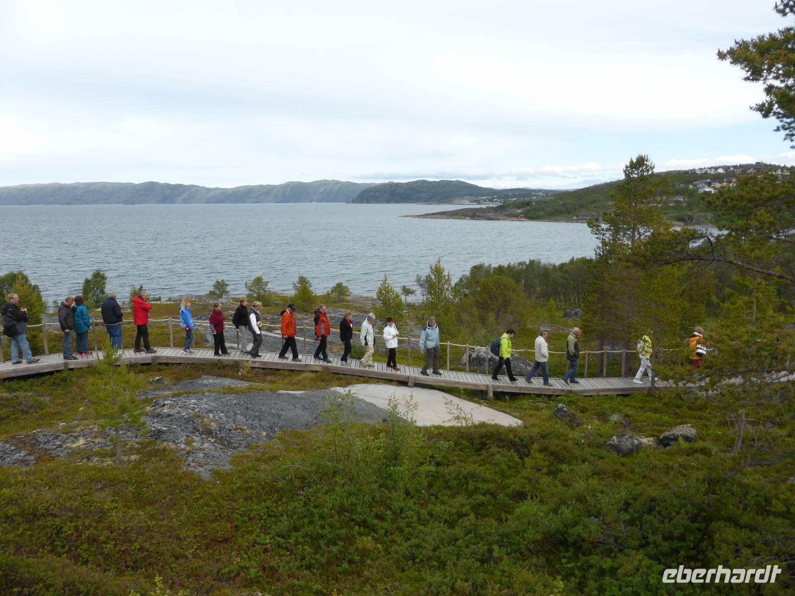 Nach einer verkürzten Nachtruhe in Honningsvag fuhren wir durch den Nordkaptunnel aufs Festland zurück. Die erste Pause legten wir wieder am Olderfjord ein und von dort ging es durch die Finnmarks-Vidda über eine fast baumlose, jedoch bezaubernde Landschaft mit vielen Bergen, Sträuchern, Mooren und Seen, welche Sennalandet genannt wird. Nach dieser Fahrt kam der Alta-Fjord in Sicht. Alta ist die größte Stadt in der Provinz Finnmark. Dass die Stadt in ihren Ausmaßen wächst, sieht man an den vielen neuen Gebäuden, den farbenfrohen Häusern und am kleinen Flughafen. Zur Mittagszeit hielten wir am Hjemmeluft-Museum mit den berühmten Felszeichnungen von Alta, die auf der Liste des Weltkulturerbes stehen. Danach begann unsere Führung mit Jennifer durch das Außengelände des Museums. Durch sie lernten wir die Entstehung und Bedeutung der in den Fels geritzten Bilder kennen und erfuhren so auch viel über die kunstvollen Variationen sowie über die stilistischen Ausführungen der Motive. Vom Alta-Museum aus fuhren wir zum Kvaenenfjord, wo wir von einem hoch gelegenen Aussichtspunkt fantastische Aufnahmen vom Fjord und die in ihm liegenden Schären machen konnten. Viele von uns kehrten hier zur Kaffeepause ins urige Cafe „Dildetun" ein. Nach einem weiteren Stopp am Kafjord kamen wir an unserem Hotel „Welcome Inn Lyngskroa" in Oteren an.