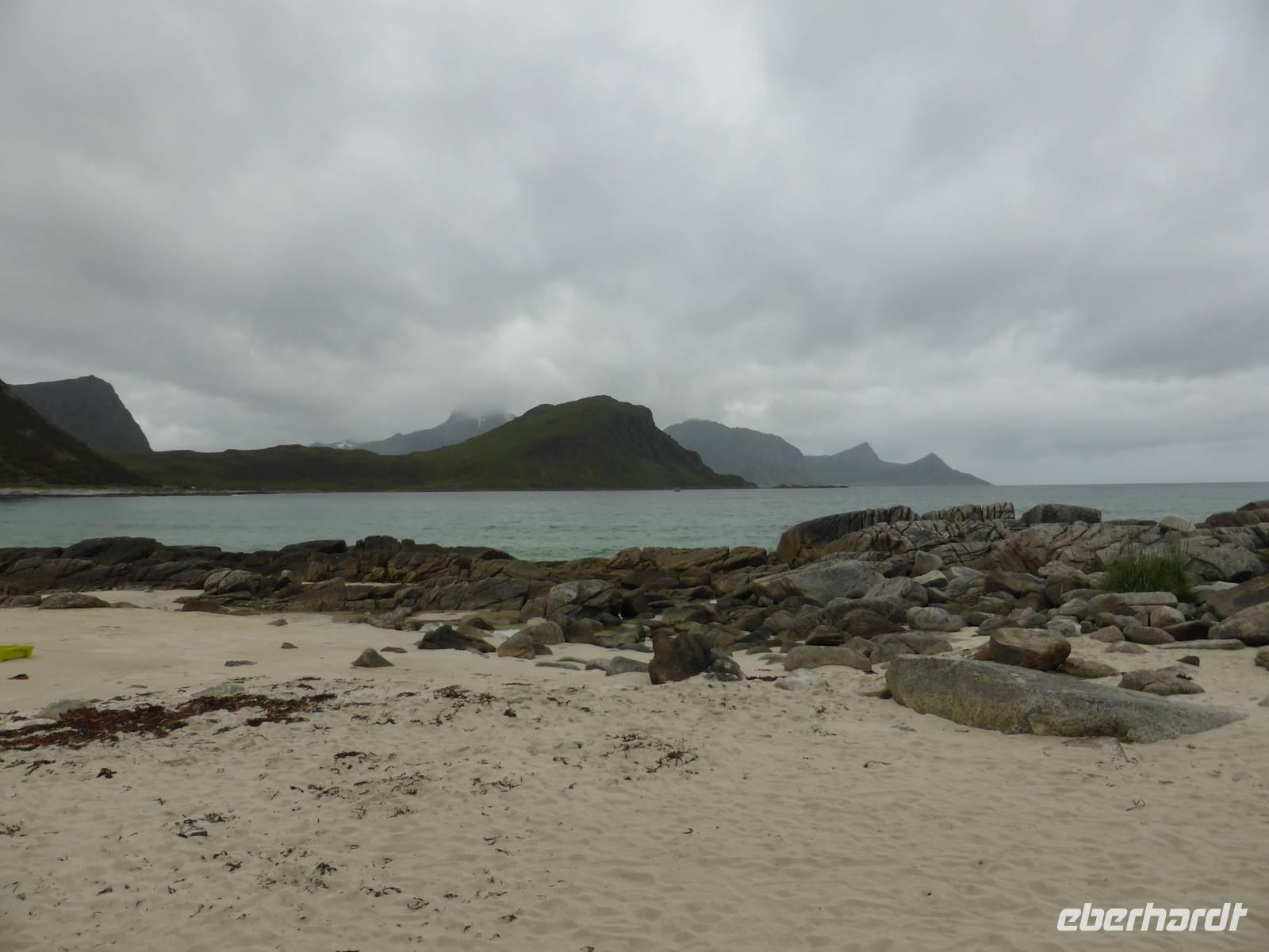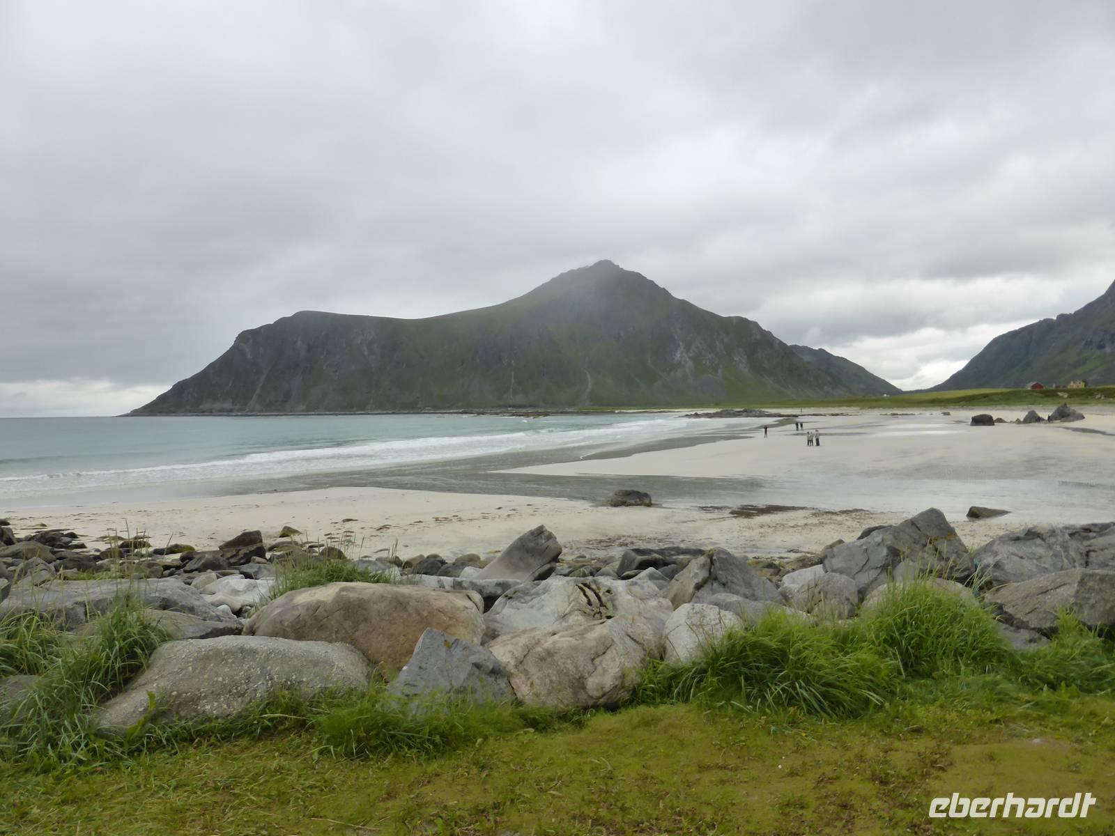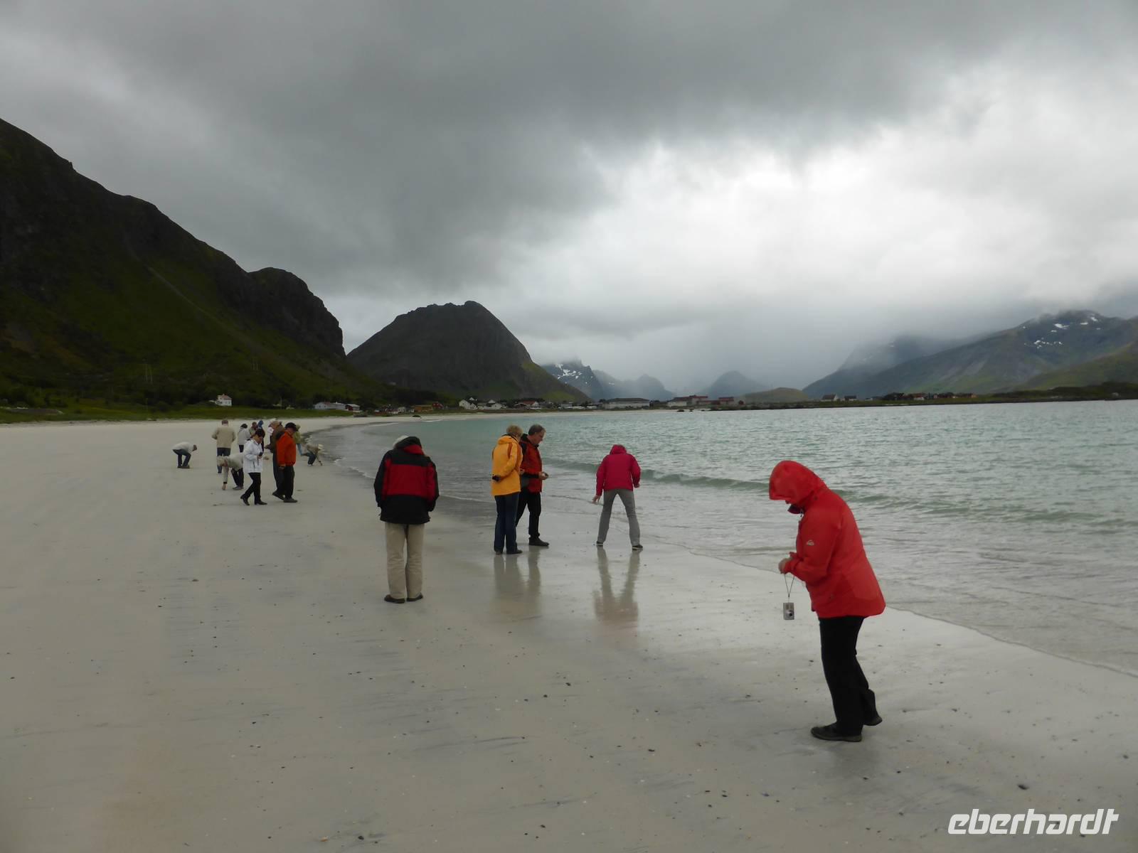 Mit Ausblick auf die fantastische Schärenlandschaft vor Mortsund begannen wir nach dem Frühstück unsere Rundfahrt auf den Lofoten. Zuerst fuhren wir in Richtung Insel Flakstadoya und hielten am traumhaften Strand von Ramberg. Hier hatten wir Zeit für einen kleinen Spaziergang am Wasser. Anschließend hielten wir am Strand von Flakstad.