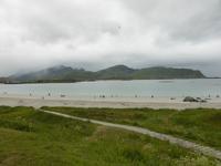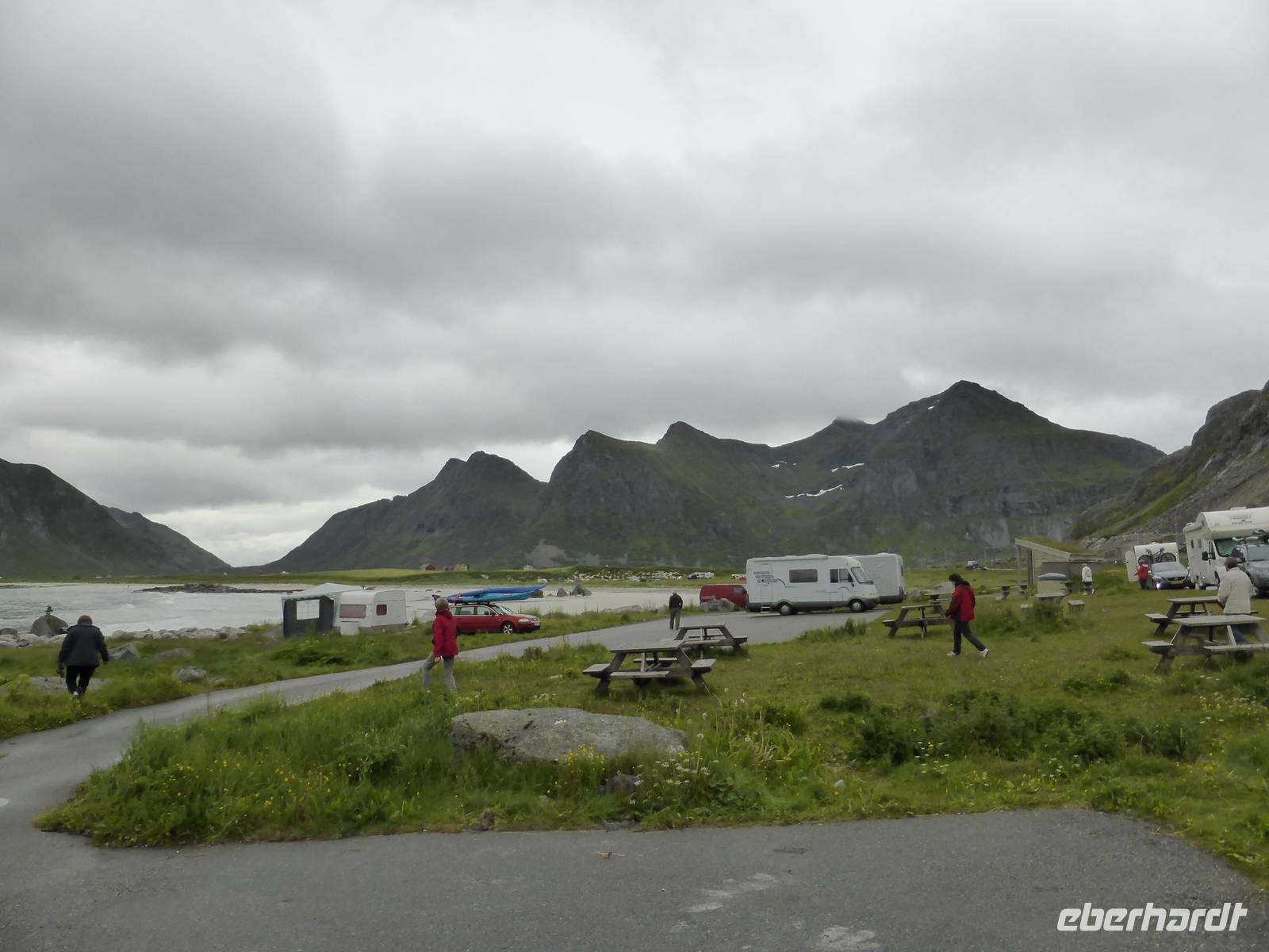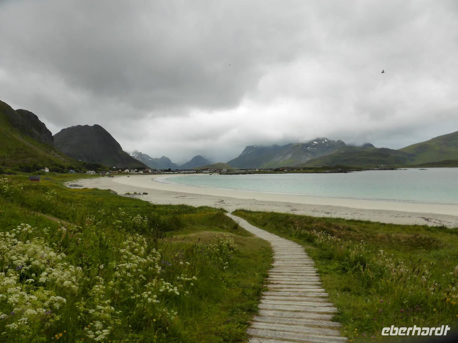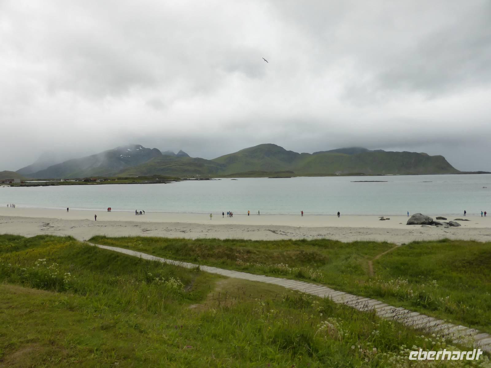 Mit Ausblick auf die fantastische Schärenlandschaft vor Mortsund begannen wir nach dem Frühstück unsere Rundfahrt auf den Lofoten. Zuerst fuhren wir in Richtung Insel Flakstadoya und hielten am traumhaften Strand von Ramberg. Hier hatten wir Zeit für einen kleinen Spaziergang am Wasser. Anschließend hielten wir am Strand von Flakstad.