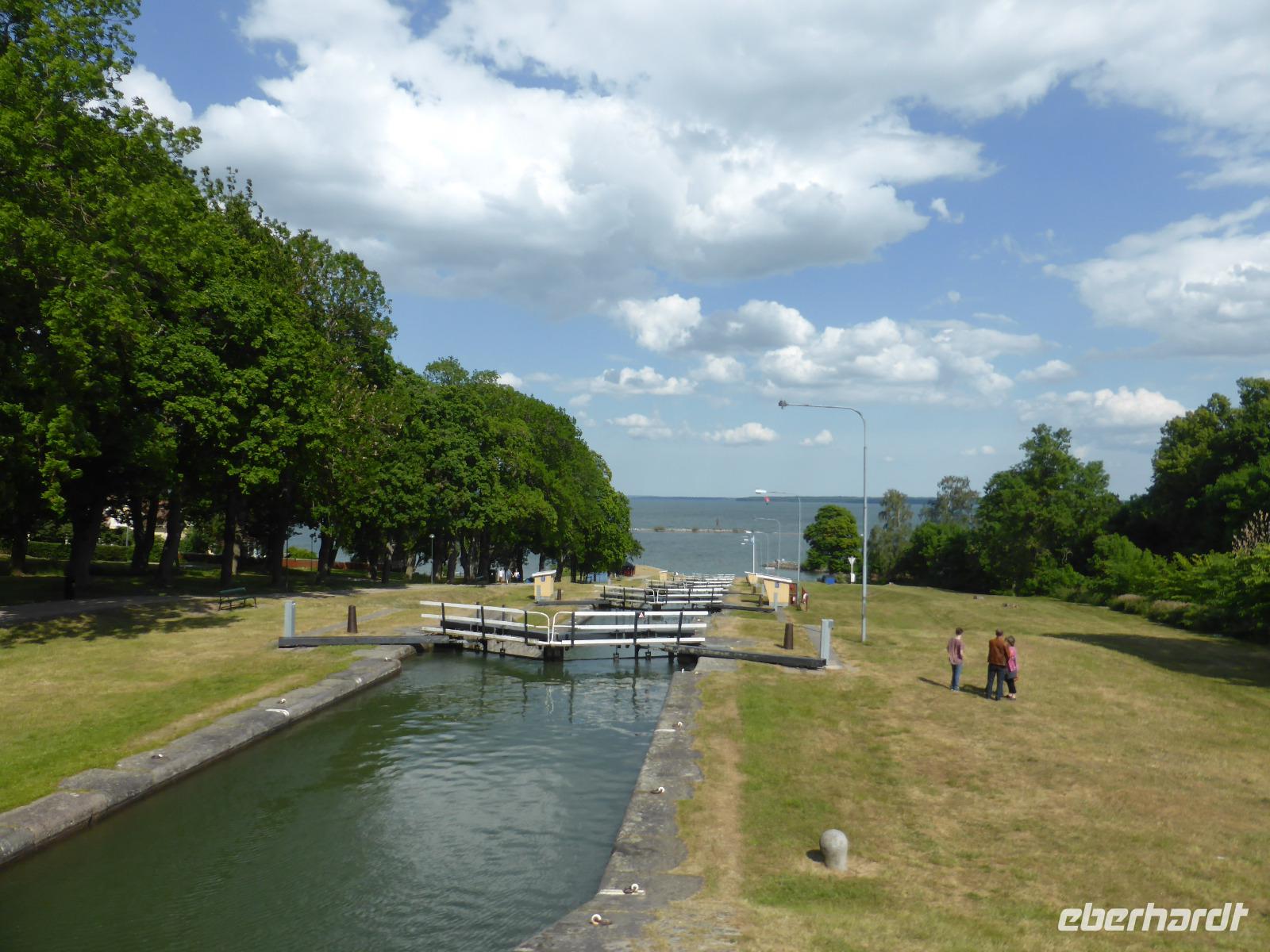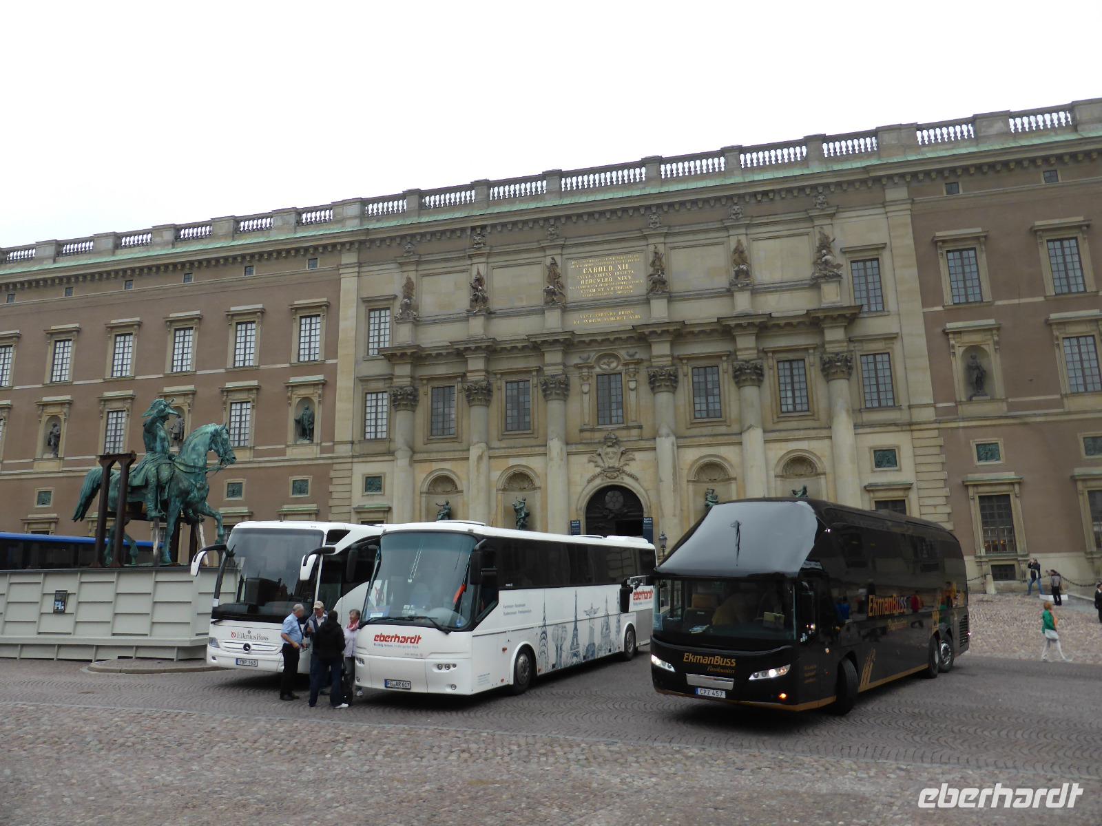 Am nächsten Morgen liefen wir durch den Schärengürtel in den Hafen von Göteborg ein. Nach der Ankunft fuhren wir zum Aussichtsberg „Keillers Park" und hatten von dort einen fantastischen Blick auf den Hafenbereich und das Stadtzentrum von Göteborg. Anschießend ging es zum zweitgrößten See Schwedens, dem Vätternsee. Unsere Mittagspause legten wir am Rasthof Brahehus ein. Hier konnten wir die berühmten rot-weißen Zuckerstangen aus Gränna kaufen und hatten von der romantischen Schlossruine aus einen fantastischen Blick auf den See und die Insel Visingsö. Im Anschluss fuhren wir zum Runenstein von Rök und von dort nach Berg zur Schleusentreppe des Göta-Kanals. Hier sahen wir, wie die Schiffe in mehreren Schleusen einen Höhenunterschied von 10 - 15 Metern überwanden. Wir hatten gutes Wetter und genossen den Aufenthalt inmitten der schönen Seenlandschaft. Danach ging es zu unserem Hotel „Scandic Talk" am Stockholmer Messegelände. Hier erwartete uns bereits Peter, der Fahrer unserer Rundreise. Er löste am nächsten Tag seine Tochter Kristin ab, die uns die ersten beiden Tage bis Stockholm gefahren hatte und von der wir uns herzlich verabschiedeten.