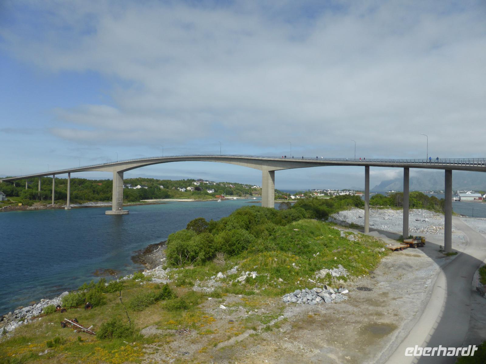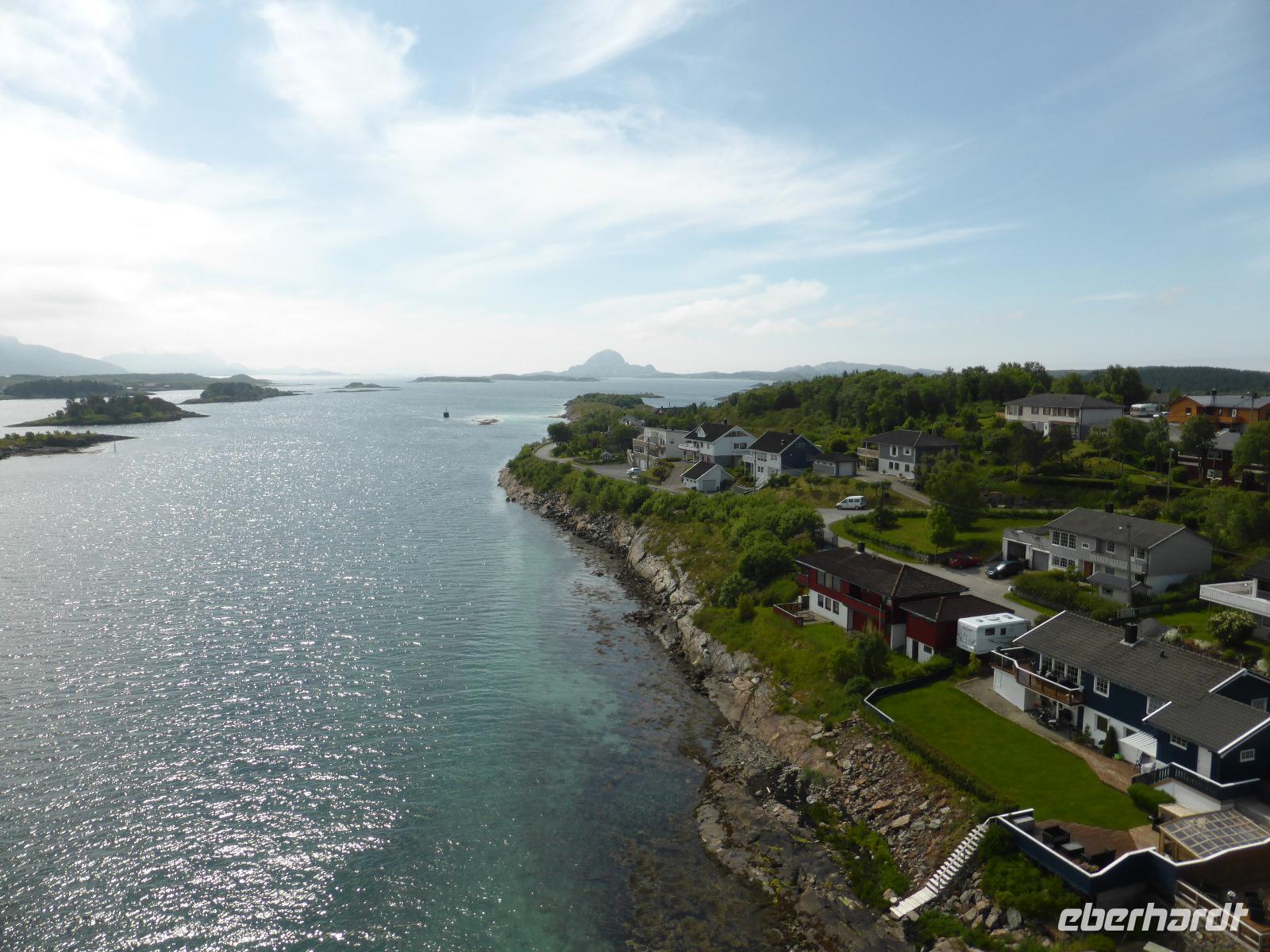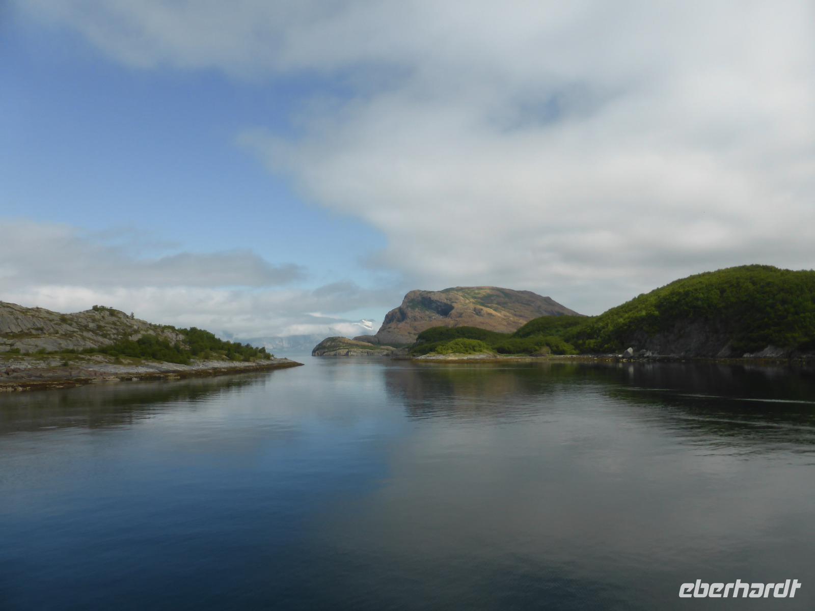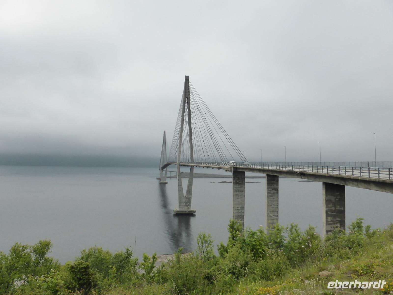 Am Morgen fuhren wir von Mo i Rana zunächst in südliche Richtung und später durch den fast 11 Kilometer langen Toventunnel nach Sandnessjoen. Dort gab es mit der weißen Helgelandbrücke, die sogar einmal zu Norwegens beliebtester Brücke gewählt worden war, eine architektonische Meisterleistung zu bewundern. Nach diesem Fotostopp ging es an der Bergkette der „Sieben Schwestern" vorbei, von denen die Bergspitzen leider hinter Wolken verborgen blieben. Die anschließende einstündige Fahrt mit der Fähre von Tjoetta nach Forvik war sehr angenehm und es boten sich viele schöne Fotomotive. Die zweite Fährpassage von Andalsvagen nach Horn dauerte nur 20 Minuten. Dort angekommen, machten wir einen Abstecher zur Brücke von Brønøysund, über welche wir spazierten und von der aus wir fantastische Aufnahmen vom Ort Brønøysund und vom Berg „Torghatten" machen konnten. Die Legende sagt, dass einst der König von Sömna seinen schützenden Hut vor das hübsche Mädchen Lekamoya warf, um es vor dem Pfeil des Hestmannes zu schützen. Der Pfeil durchbohrte genau in dem Moment den Hut, in dem die Sonne aufging und alles zu Stein erstarren ließ. Die Hutform des Torghatten ist heute noch gut zu erkennen, nur das Loch im Felsen kann man schwer finden. Die dritte und letzte Fähre brachte uns dann von Vennesund nach Holm. Nach einem Fotostopp am Parkplatz Heilhornet und einer weiteren Pause kamen wir am Abend im Hotel Tingvold in Steinkjer an.