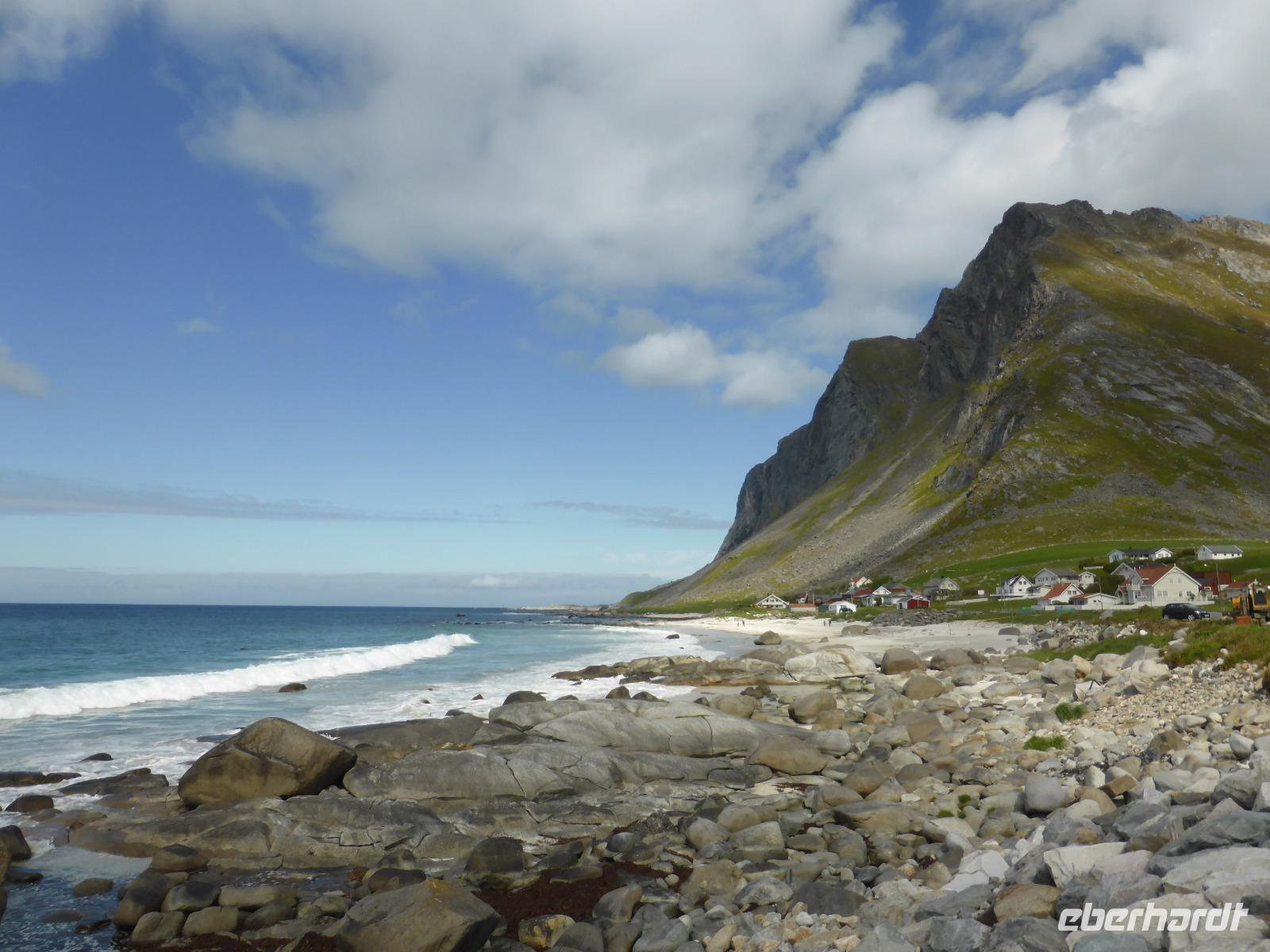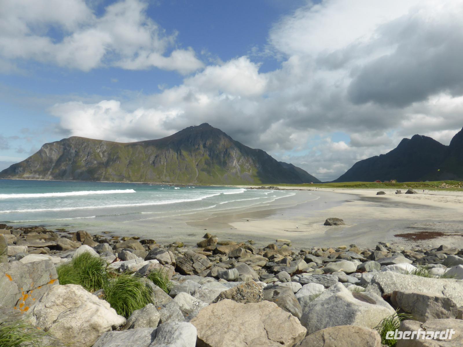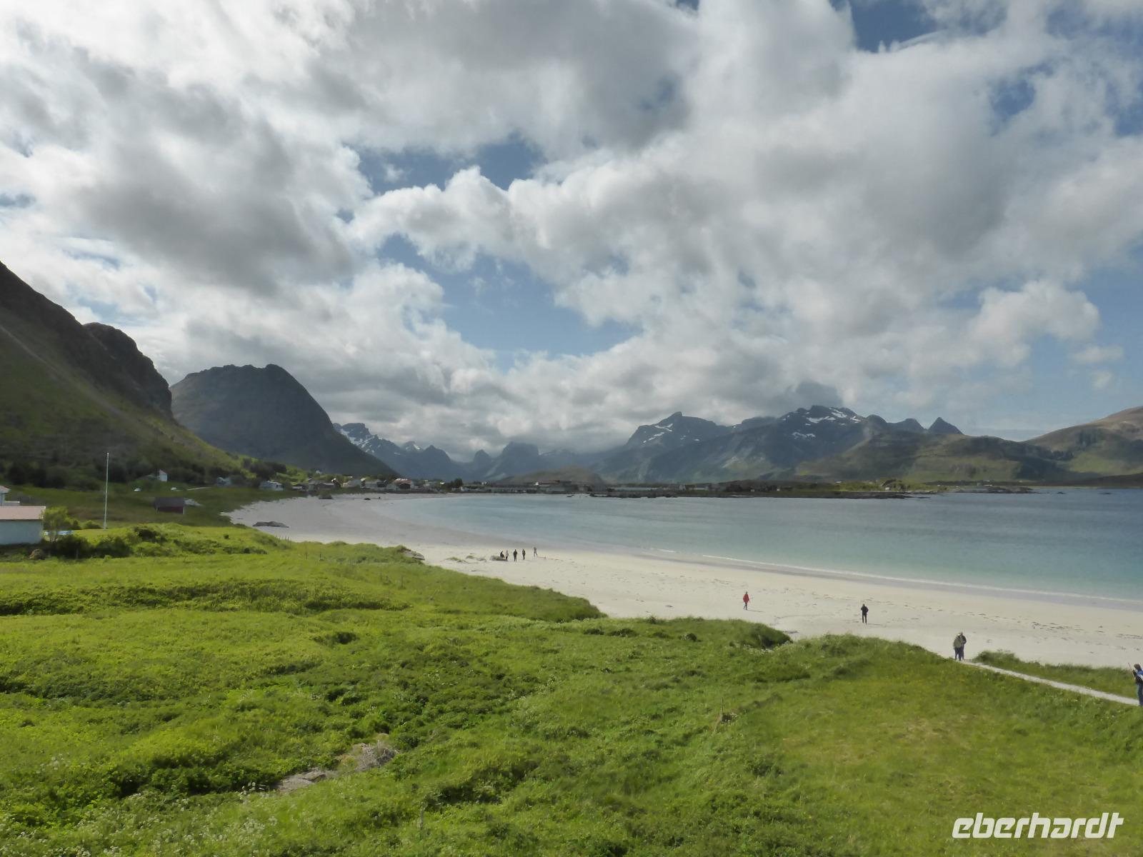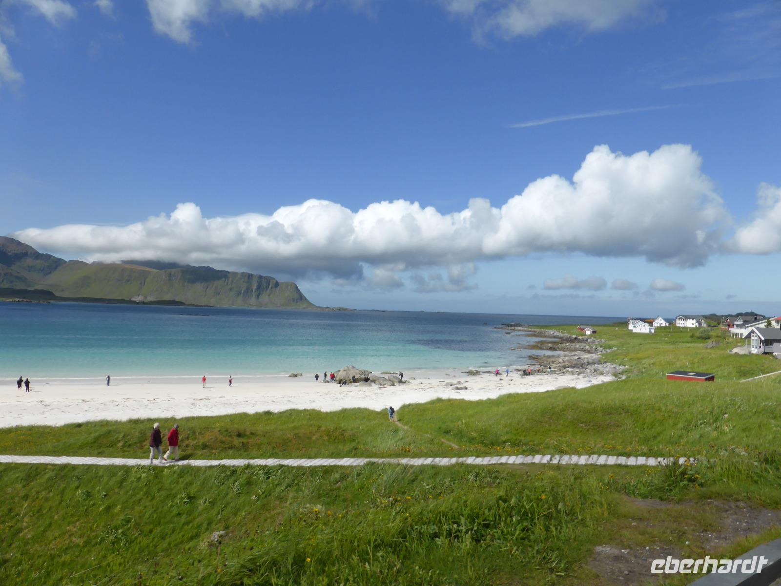 Nach dem Frühstück begannen wir unsere Rundfahrt auf den Lofoten. Zuerst fuhren wir auf die Insel Vestvagoy und danach zur Insel Flakstadoya. Hier hielten wir oberhalb des Fischerortes Napp und anschließend an den traumhaften Stränden von Flakstad und Ramberg. Von dort ging es zum Künstlerdorf Vikten sowie zum Wikingermuseum von Borg.