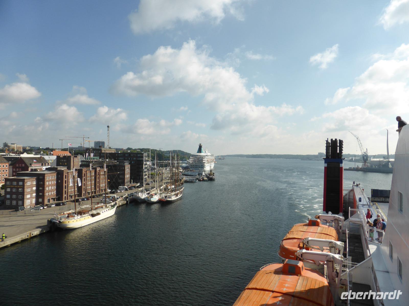 Unsere Reise begann am Flughafen Dresden und entlang der Autobahn folgten weitere Zustiege. Unsere Fahrtroute verlief über die A9 in Richtung Berlin und über die A24 in Richtung Hamburg nach Kiel. Gegen 15.20 Uhr kamen wir am Terminal der Stena Line in Kiel an und bis zum Bezug unserer Kabinen auf der „Stena Scandinavica" hatten wir noch etwas Freizeit für den Besuch der Kieler Innenstadt. Gegen 18.45 Uhr legte unser Schiff ab. Während es langsam durch die Kieler Förde hinaus in die Ostsee fuhr, genossen wir das skandinavische Buffet im Panorama-Restaurant.