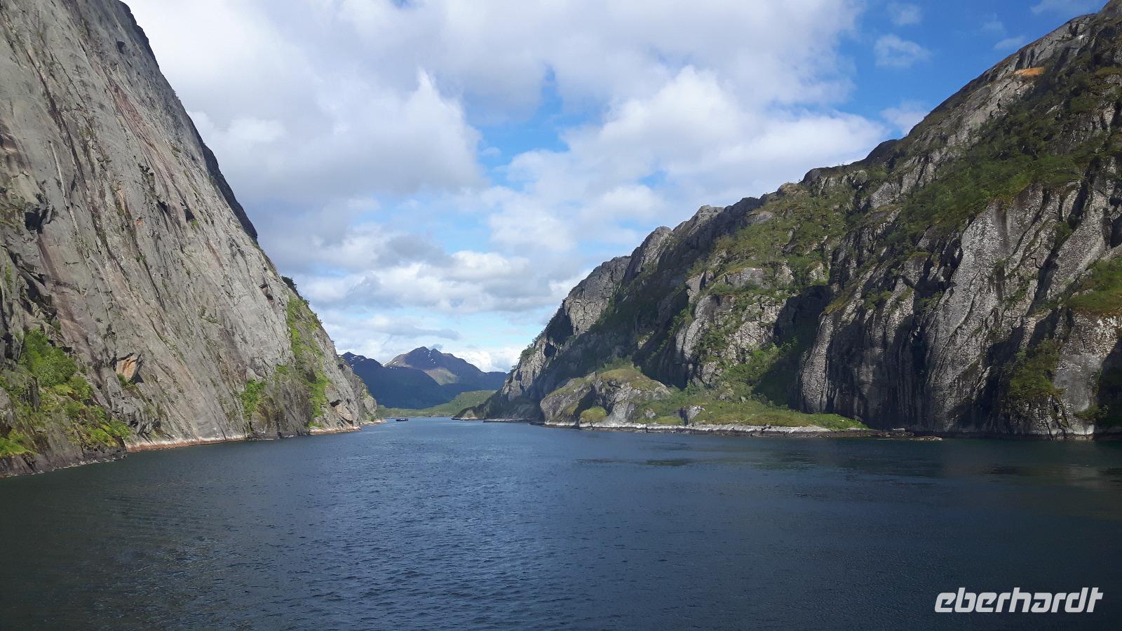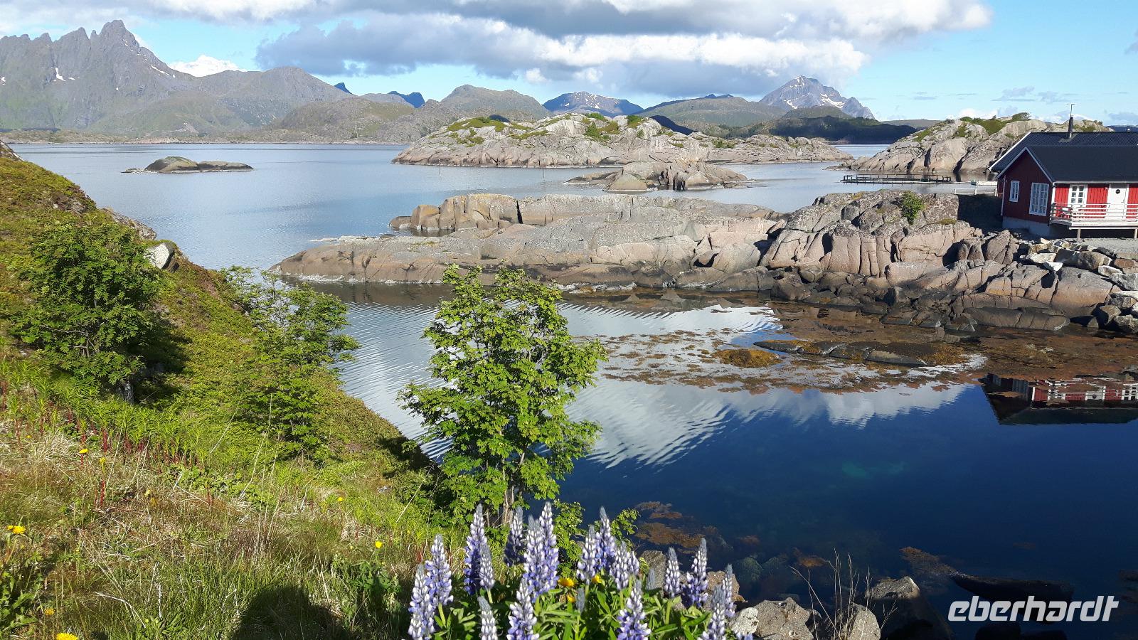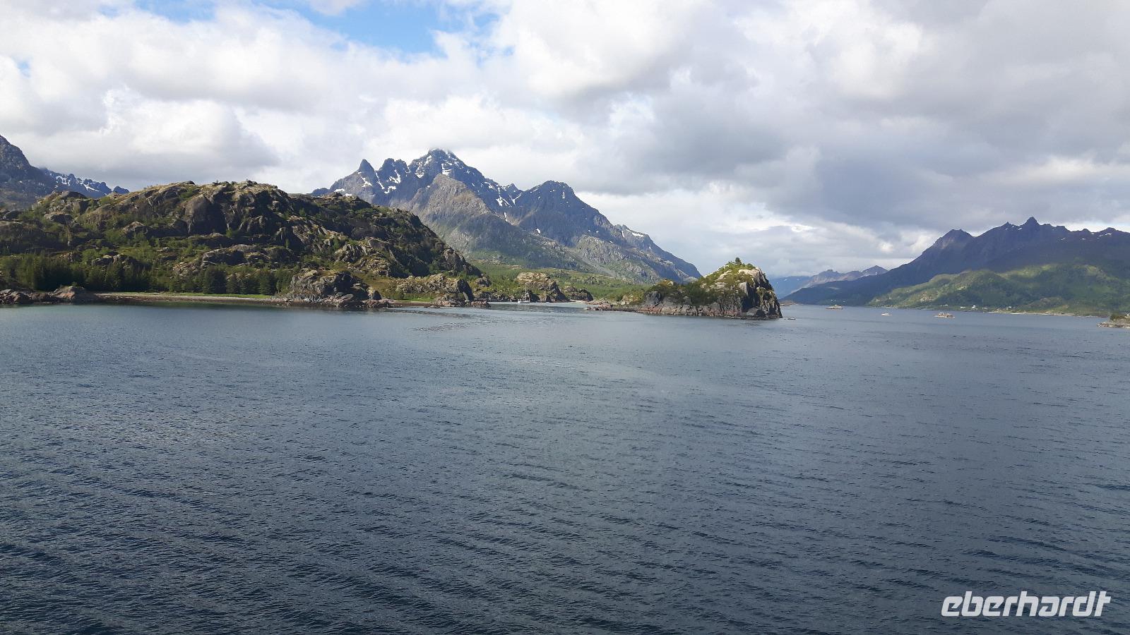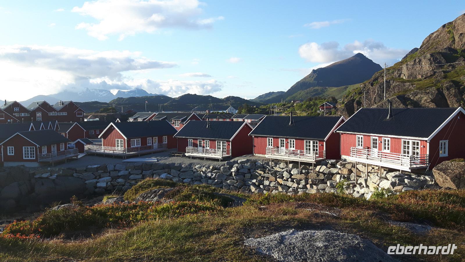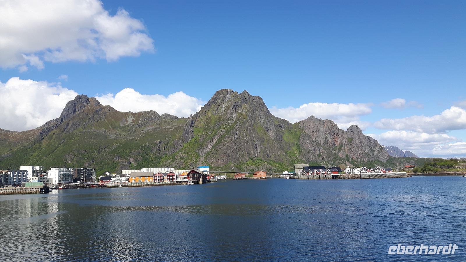 Am Morgen regente es leider wieder und leider hatten wir keine Sicht auf die grandiose Bergwelt! Es konnte nur besser werden...! Wir fuhren am Balsfjord vorbei, dann weiter durch die Berge und über die Fjelle von Troms... und gegenüber von Narvik am Ofotfjord entlang. Nach der Überquerung der Tjeldsundbrücke kamen wir auf den Vesterålen, einer überaus facettenreichen Inselgruppe, an. Die Landschaftsvielfalt reicht hier von ruhigen, friedlichen Stränden, Wiesen und Weiden bis zu zerklüfteten alpinen Höhenzügen, dramatischen Fjorden und uriger Wildnis. Unser Bus brachte uns zum Hurtigruten-Kai in Stokmarknes, dem Ausgangspunkt unserer Mini-Kreuzfahrt auf einem der Postschiffe! In diesem idyllischen Dorf gründete Richard With übrigens vor mehr als 120 Jahren die erste Hurtigruten-Reederei! Unser Schiff, die MS „Richard With", fährt seit 1993 in der Hurtigruten-Flotte. Wer Norwegen hautnah erleben will, der sollte unbedingt die Hurtigruten kennenlernen. Es handelt sich dabei um die traditionelle norwegische Postschifflinie, über die seit Ende des 19. Jahrhunderts die Ortschaften der westlichen Küste Norwegens, die etwa 2.700 Kilometer umfasst, miteinander verbunden werden. Zwischen Bergen und Kirkenes kreuzen hier Passagier-, Fracht- und Kreuzfahrtschiffe. Diese Strecke bietet somit eine einmalige Gelegenheit, die gesamte Westküste Norwegens mit all ihren Naturschönheiten kennenzulernen. Fjorde, raue und liebliche Landschaften und die Gastfreundschaft der Menschen machen Hurtigruten heute zu einer echten Touristenattraktion und was einst aus der Not heraus geboren wurde, nämlich auch abgelegene nördliche Landesteile mit dem klimatisch begünstigten Süden zu verbinden, ist inzwischen eine Sehenswürdigkeit. Natürlich erlebten wir auf unserer knapp 4-stündigen Fahrt nur eine kleine Etappe dieser eigentlich 12-tägigen Reise, aber immerhin hat man dadurch einen Eindruck von der sogenannten „Schönsten Seereise der Welt". Der Höhepunkt dieser Hurtigruten-Etappe war die schöne Fahrt durch den Raftsund, hinein in den engen Trollfjord - inzwischen begleitet von herrlichem Sonnenschein! Unser Buschauffeur Roy erwartete uns am frühen Abend in Svolvær, dem Hauptort der Lofoten. Die Lofoten sind ein weiteres und echtes Highlight dieser Reise! Das zeigt sich sofort, als wir in Svolvær wieder in unseren Reisebus steigen und über die Inselgruppe zur Übernachtung zu den Rorbuhütten von Mortsund fahren. Entlang der Küste Nordlands gibt es diese alten wiederhergerichteten ehemaligen Unterkünfte der Fischer zu mieten und eine Übernachtung hier ist etwas ganz Besonderes. Die Hütten dienten den Fischern ursprünglich als Behausung während längerer Fangperioden. Heute werden die gut ausgestatteten und restaurierten Hütten nur noch für Urlaub und Freizeit genutzt. Bei der Restaurierung legt man Wert auf die Erhaltung des ursprünglichen Gebäudes und kombiniert gleichzeitig Tradition mit den Annehmlichkeiten der heutigen Zeit. Das „Statles Rorbu- og Konferansesenter AS" liegt im idyllischen Mortsund, einem kleinen Fischerdorf, und genau hier, mitten im Herzen der Lofoten, verbrachten wir zwei Nächte.