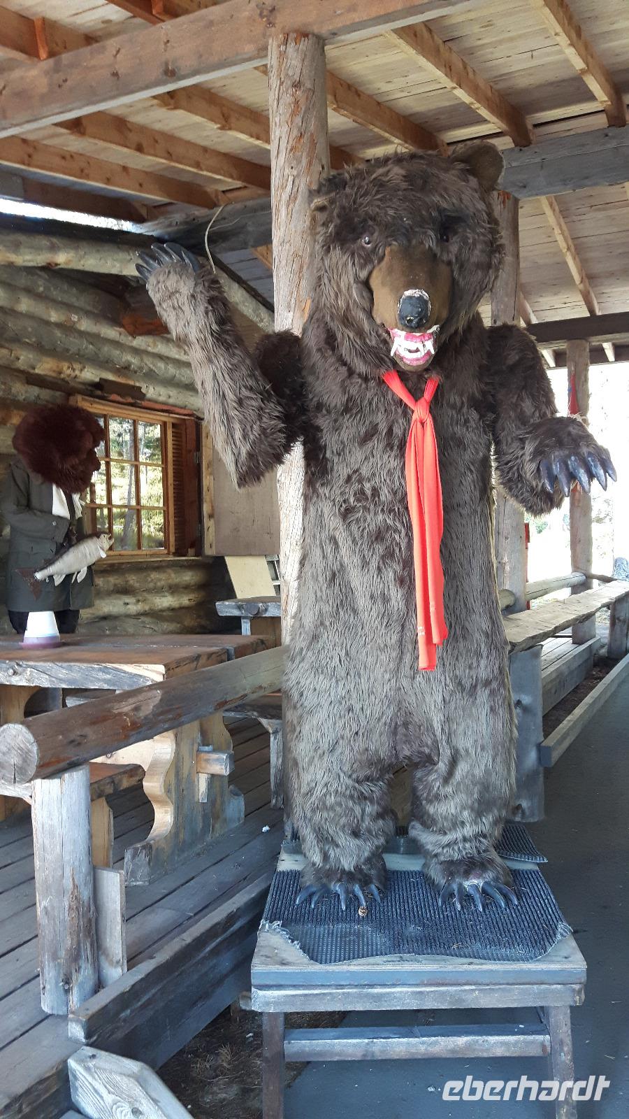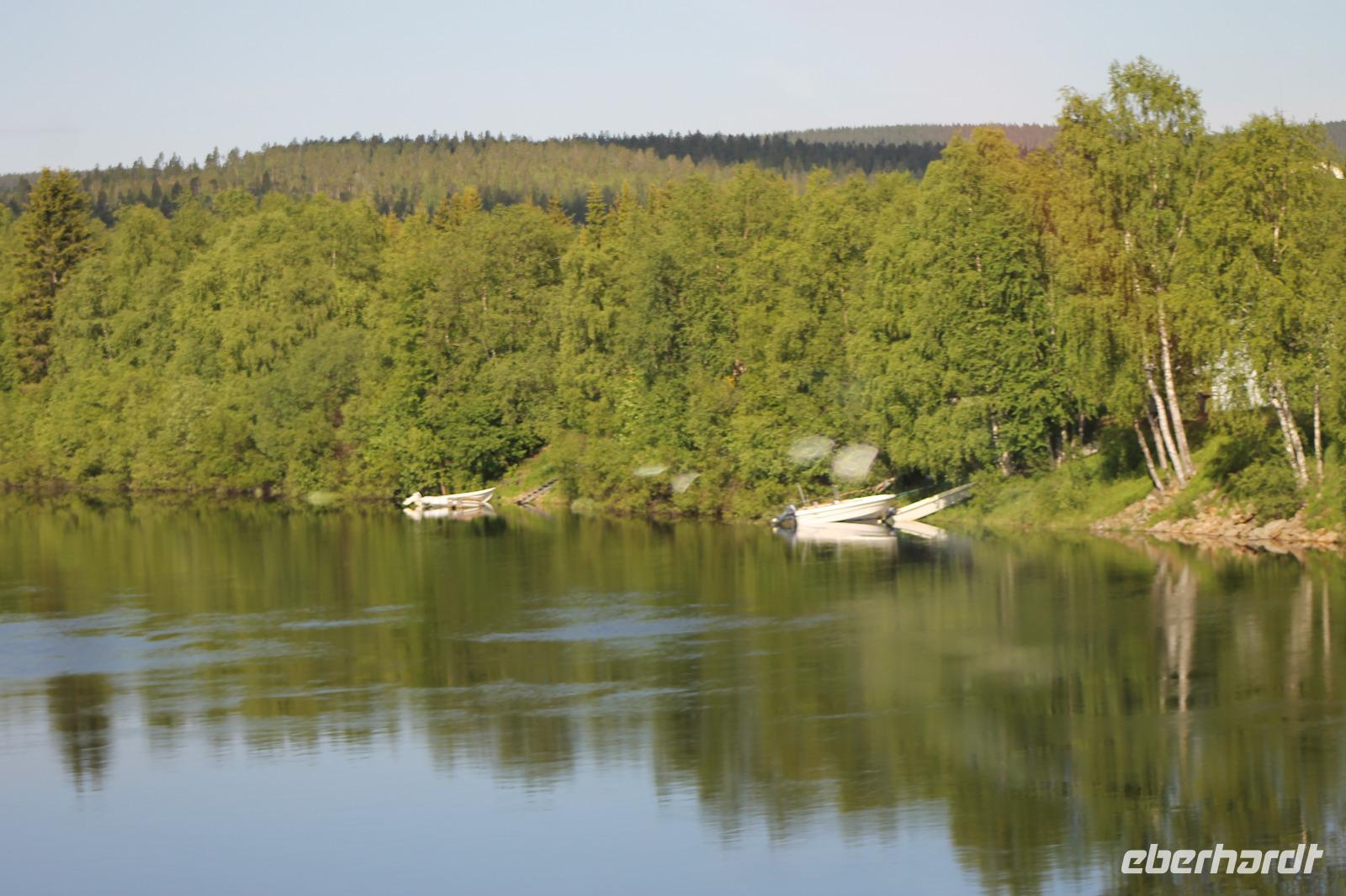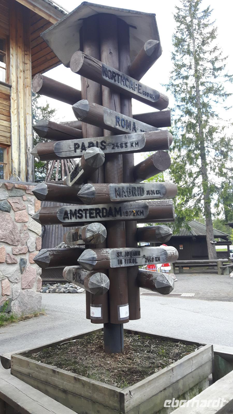 Ein kurzer außerplanmäßiger Abstecher führte uns gleich am Morgen nach Luleá Gammelstad mit seiner Kirche, den 424 Holzhäusern und insgesamt 555 einzelnen Räumen - es ist das größte und am besten bewahrte Beispiel eines Kirchendorfs in Schweden. Kirchendörfer, die es übrigens nur in Nordskandinavien gibt, entstanden aufgrund der enormen Größe der Pfarreien und der schwierigen, geografischen Verhältnisse und Wetterbedingungen - Faktoren, die den Kirchgang zu einer enormen Unternehmung machten. Die Lösung war ganz einfach - man baute ein Dorf um die Kirche, in dem man übernachten, andere Gemeindemitglieder treffen und an den wöchentlichen Messen und Kirchenfeierlichkeiten teilnehmen konnte. Die roten Häuschen wurden in ihrer ursprünglichen Nutzung bis in die 1950er Jahre genutzt. Jetzt ist das auf der UNESCO-Weltkulturerbeliste stehende Dorf eine lebende Gemeinde und ein Freilichtmuseum. Einige der Häuschen dienen nach wie vor bei größeren kirchlichen Feierlichkeiten als Unterkünfte für die Kirchgänger. Bei der weiteren Fahrt durch Wälder mit zahllosen Mooren, Seen und Flüssen genossen wir das tolle Wetter! Bereits am Mittag überschritten wir bei Haparanda die schwedisch-finnischen Grenze und das bedeutete auch, unsere Uhren eine Stunde vor zu stellen! Von hier aus ging es weiter in den Norden hinauf. Schließlich trafen wir bei Rovaniemi auf den Nördlichen Polarkreis und das Weihnachtsmanndorf. Dies war für uns eine willkommene Gelegenheit, um mit einem, von Eberhardt TRAVEL spendierten Glas Schnaps, auf die Polarkreis-Überquerung anzustoßen - na dann Prost...! Außerdem zauberten wir mit Weihnachtsdekoration, -musik, -geschichten bzw. „hauseigenen" Spekulatius-Keksen etwas Weihnachtsstimmung in den Bus - gar nicht so einfach bei sommerlichen Temperaturen um die 20 Grad! Der weiterhin wald- und seenreichen Landschaft folgten wir am Nachmittag weiter bis Saariselkä, wo wir im Lapland-Hotel unser heutiges Nachtlager aufschlugen. Wir hatten bei dieser Fahrt bisher noch kein Rentier gesehen, aber heute liefen sie uns prompt über den Weg!