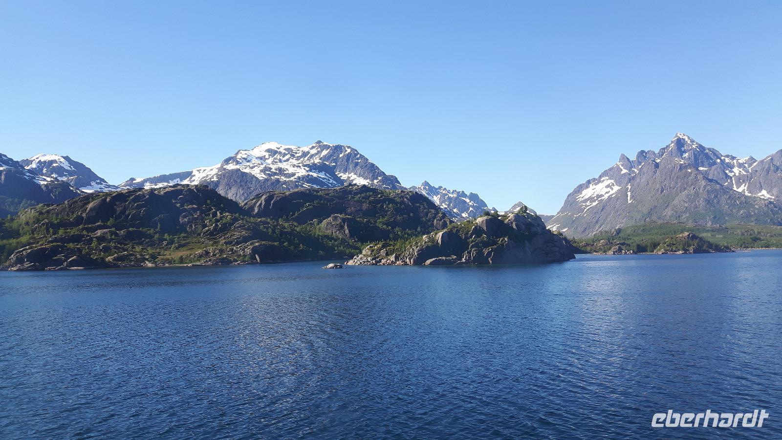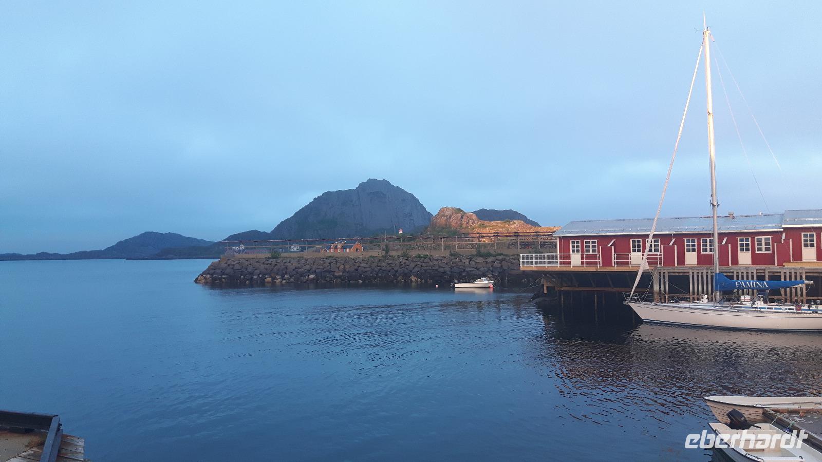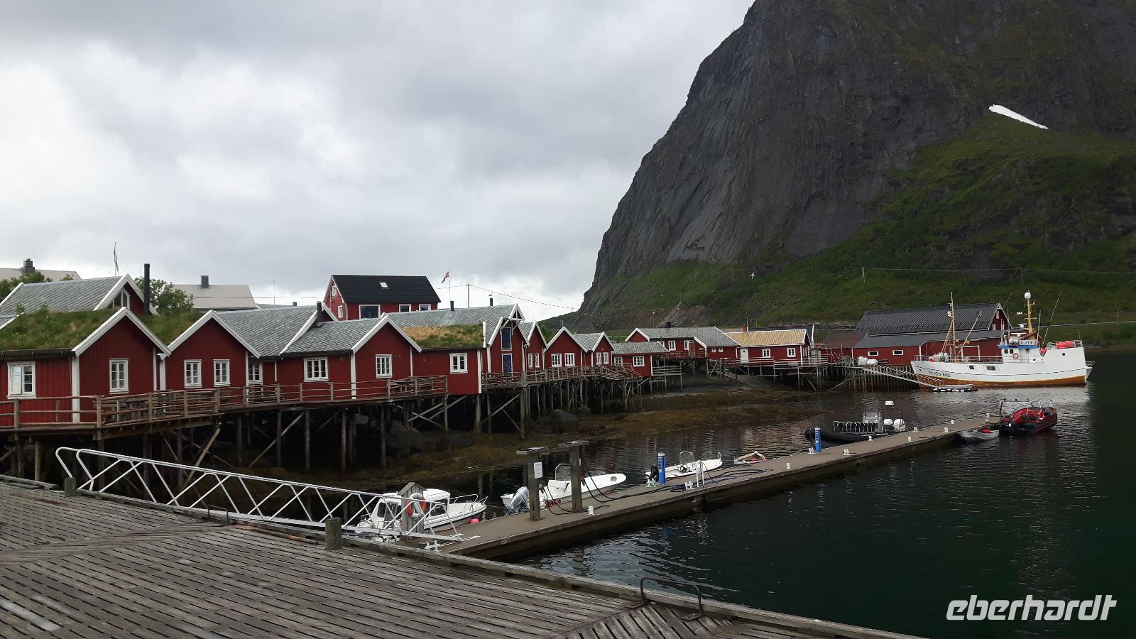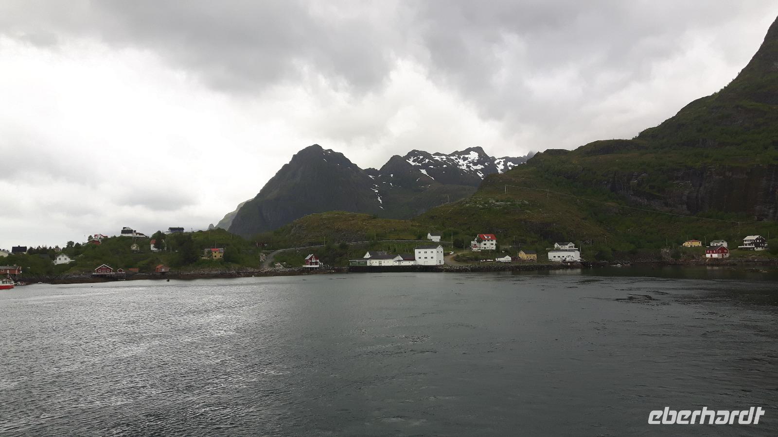 Traumhaft auch der heutige Morgen und in bester Stimmung reisten wir somit weiter. Wir fuhren am Balsfjord vorbei, dann weiter durch die Berge und über die Fjelle von Troms... und gegenüber von Narvik am Ofotfjord entlang. Nach der Überquerung der Tjeldsundbrücke kamen wir auf den Vesterålen, einer überaus facettenreichen Inselgruppe, an. Die Landschaftsvielfalt reicht hier von ruhigen, friedlichen Stränden, Wiesen und Weiden bis zu zerklüfteten alpinen Höhenzügen, dramatischen Fjorden und uriger Wildnis. Unser Bus brachte uns zum Hurtigruten-Kai in Stokmarknes, dem Ausgangspunkt unserer Mini-Kreuzfahrt auf einem der Postschiffe! In diesem idyllischen Dorf gründete Richard With übrigens vor mehr als 120 Jahren die erste Hurtigruten-Reederei! Unser Schiff, die MS „Nordnorge", fährt seit 1997 in der Hurtigruten-Flotte. Wer Norwegen hautnah erleben will, der sollte unbedingt die Hurtigruten kennenlernen. Es handelt sich dabei um die traditionelle norwegische Postschifflinie, über die seit Ende des 19. Jahrhunderts die Ortschaften der westlichen Küste Norwegens, die etwa 2.700 Kilometer umfasst, miteinander verbunden werden. Zwischen Bergen und Kirkenes kreuzen hier Passagier-, Fracht- und Kreuzfahrtschiffe. Diese Strecke bietet somit eine einmalige Gelegenheit, die gesamte Westküste Norwegens mit all ihren Naturschönheiten kennenzulernen. Fjorde, raue und liebliche Landschaften und die Gastfreundschaft der Menschen machen Hurtigruten heute zu einer echten Touristenattraktion und was einst aus der Not heraus geboren wurde, nämlich auch abgelegene nördliche Landesteile mit dem klimatisch begünstigten Süden zu verbinden, ist inzwischen eine Sehenswürdigkeit. Natürlich erlebten wir auf unserer knapp 4-stündigen Fahrt nur eine kleine Etappe dieser eigentlich 12-tägigen Reise, aber immerhin hat man dadurch einen Eindruck von der sogenannten „Schönsten Seereise der Welt". Der Höhepunkt dieser Hurtigruten-Etappe war die schöne Fahrt durch den Raftsund, hinein in den engen Trollfjord - inzwischen begleitet von herrlichem Sonnenschein! Unser Buschauffeur Andreas erwartete uns am frühen Abend in Svolvær, dem Hauptort der Lofoten. Die Lofoten sind ein weiteres und echtes Highlight dieser Reise! Das zeigt sich sofort, als wir in Svolvær wieder in unseren Reisebus steigen und über die Inselgruppe zur Übernachtung zu den Rorbuhütten von Mortsund fahren. Entlang der Küste Nordlands gibt es diese alten wiederhergerichteten ehemaligen Unterkünfte der Fischer zu mieten und eine Übernachtung hier ist etwas ganz Besonderes. Die Hütten dienten den Fischern ursprünglich als Behausung während längerer Fangperioden. Heute werden die gut ausgestatteten und restaurierten Hütten nur noch für Urlaub und Freizeit genutzt. Bei der Restaurierung legt man Wert auf die Erhaltung des ursprünglichen Gebäudes und kombiniert gleichzeitig Tradition mit den Annehmlichkeiten der heutigen Zeit. Das „Statles Rorbu- og Konferansesenter AS" liegt im idyllischen Mortsund, einem kleinen Fischerdorf, und genau hier, mitten im Herzen der Lofoten, verbrachten wir zwei Nächte.