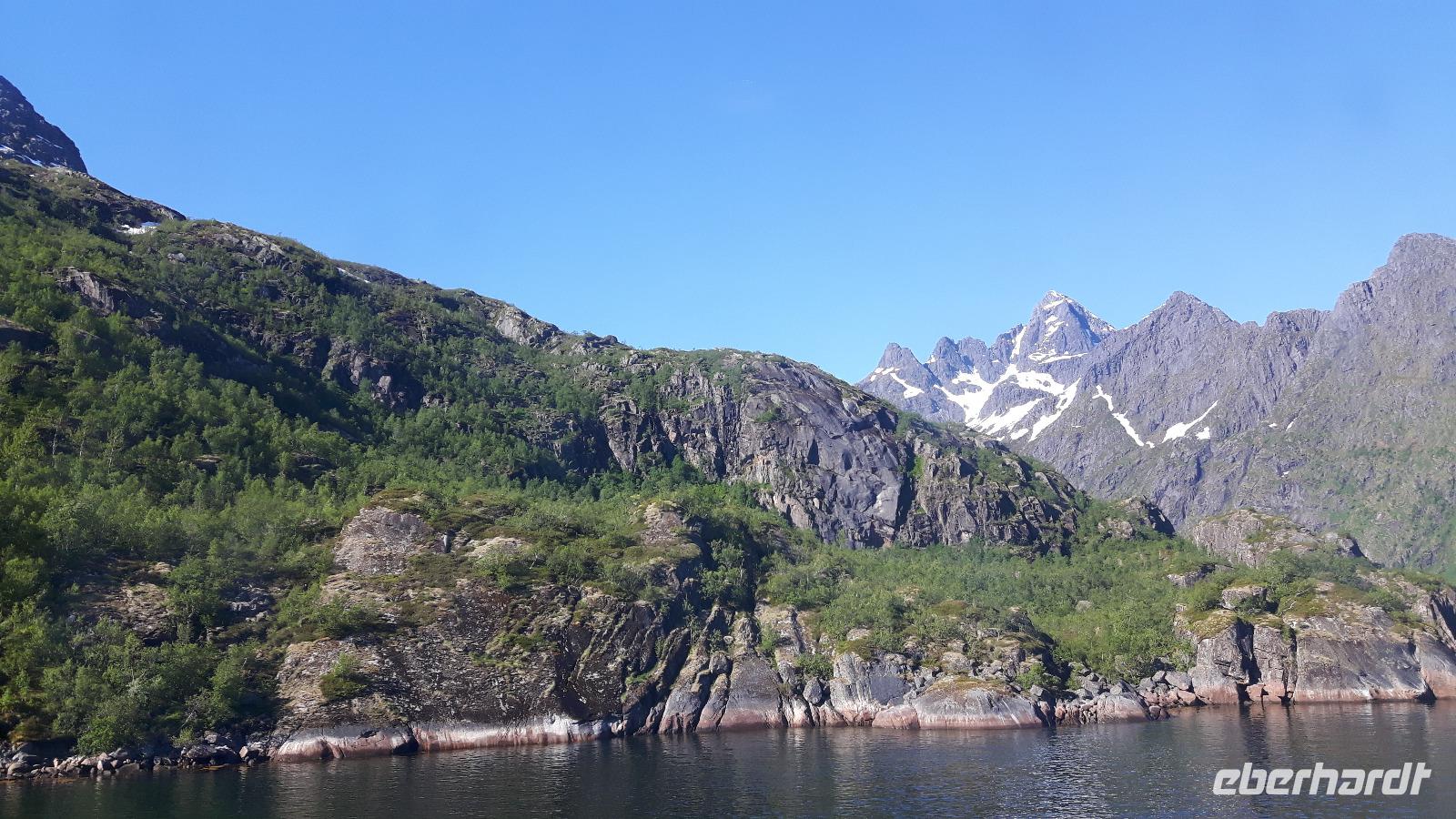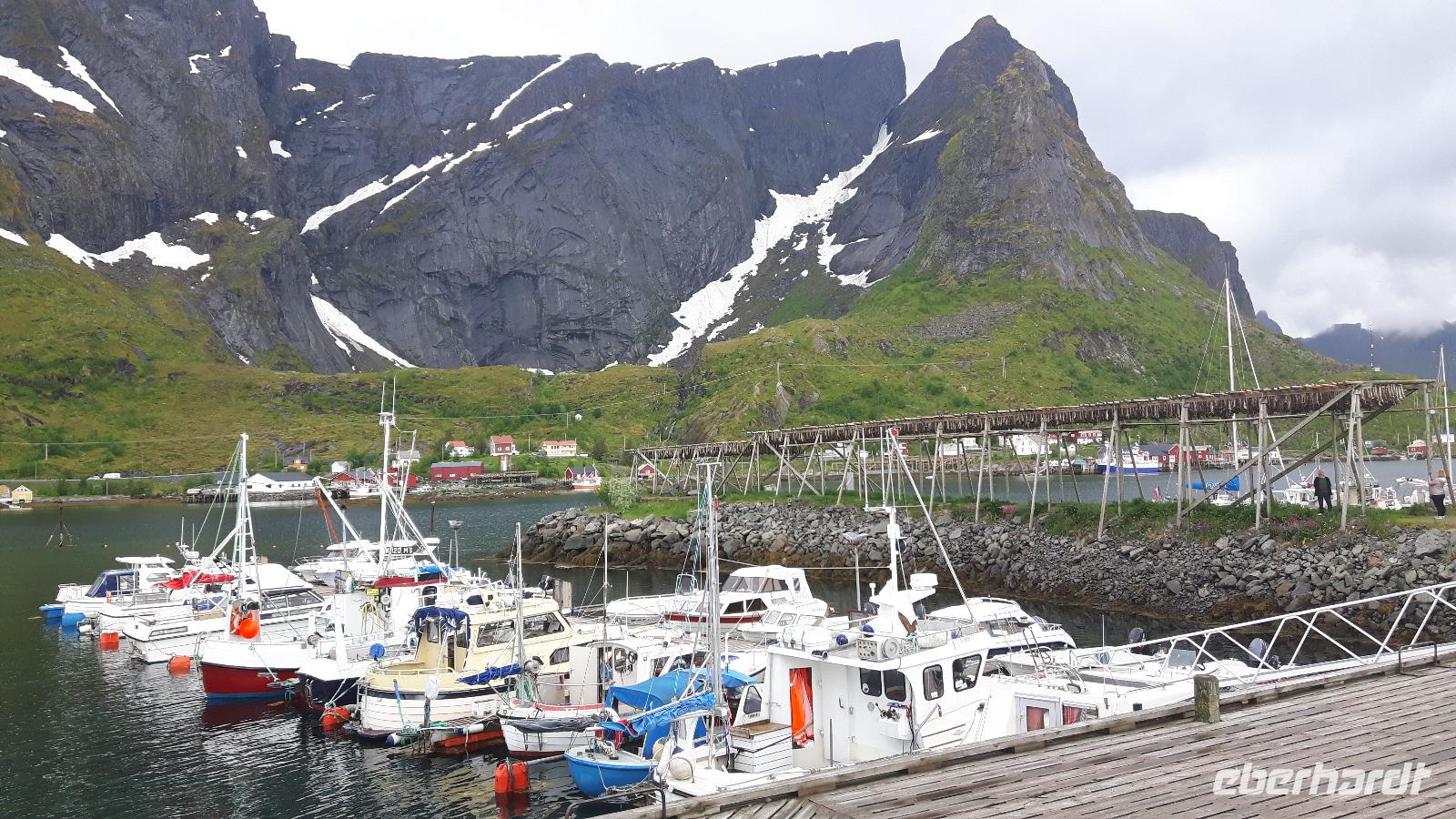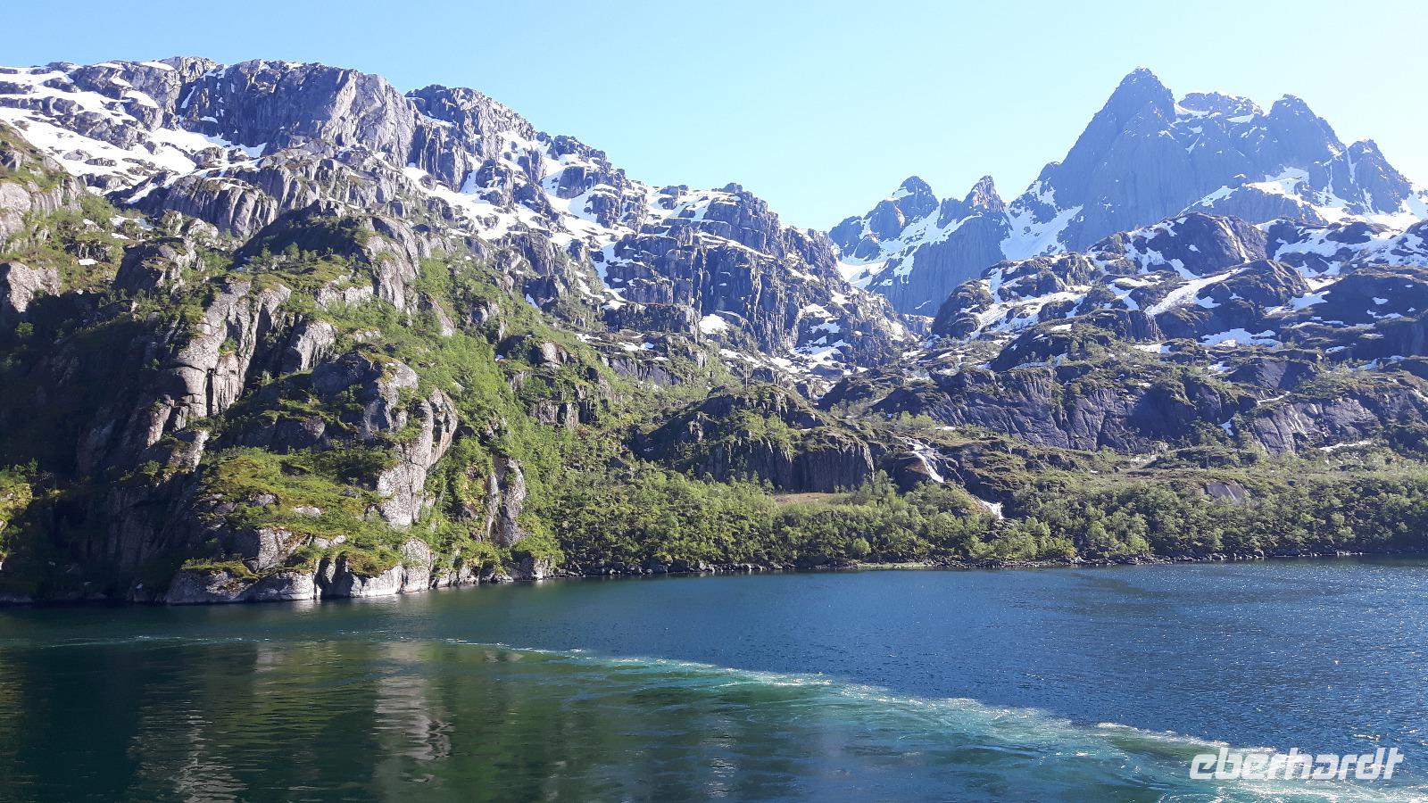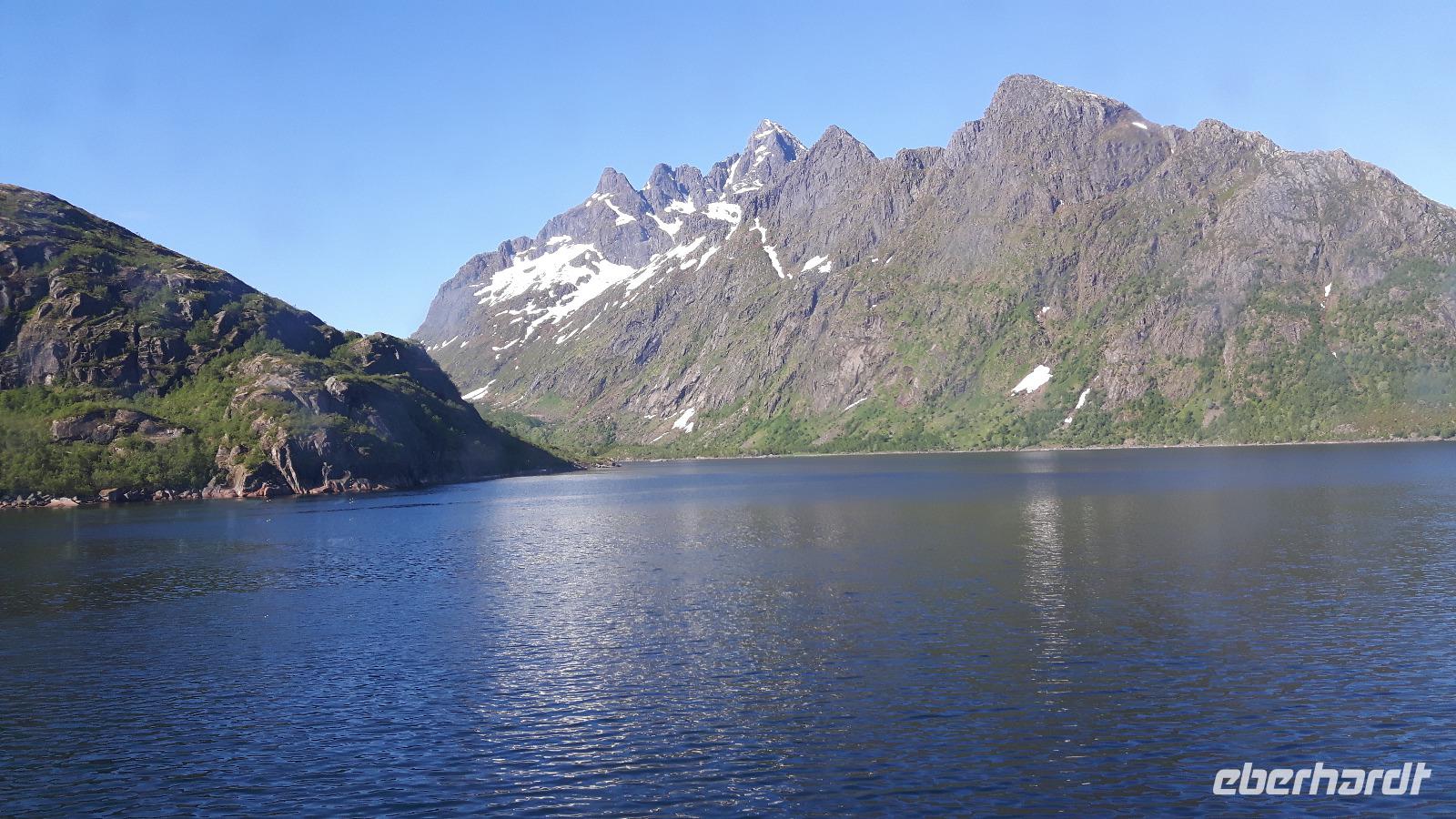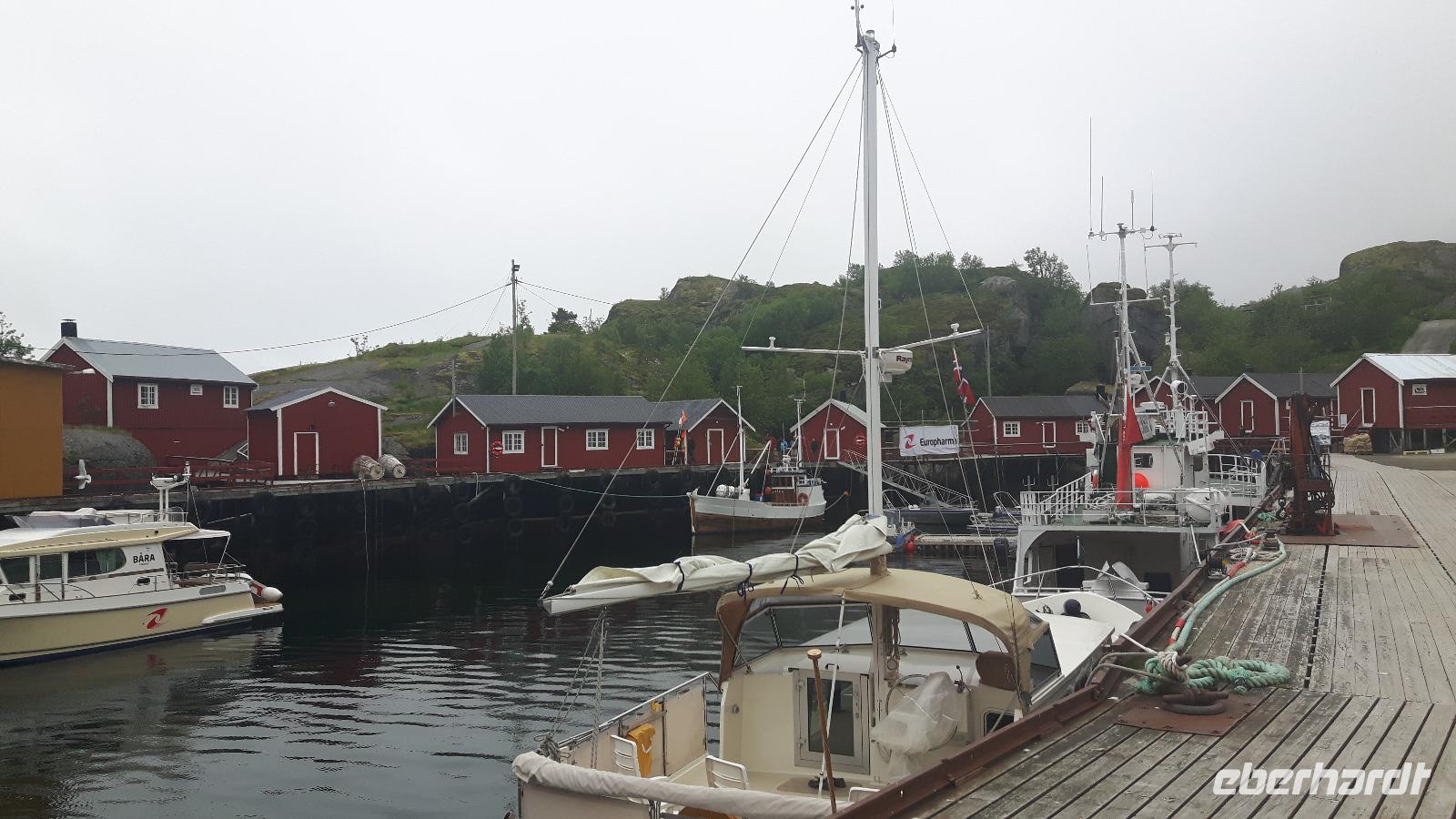 Traumhaft auch der heutige Morgen und in bester Stimmung reisten wir somit weiter. Wir fuhren am Balsfjord vorbei, dann weiter durch die Berge und über die Fjelle von Troms... und gegenüber von Narvik am Ofotfjord entlang. Nach der Überquerung der Tjeldsundbrücke kamen wir auf den Vesterålen, einer überaus facettenreichen Inselgruppe, an. Die Landschaftsvielfalt reicht hier von ruhigen, friedlichen Stränden, Wiesen und Weiden bis zu zerklüfteten alpinen Höhenzügen, dramatischen Fjorden und uriger Wildnis. Unser Bus brachte uns zum Hurtigruten-Kai in Stokmarknes, dem Ausgangspunkt unserer Mini-Kreuzfahrt auf einem der Postschiffe! In diesem idyllischen Dorf gründete Richard With übrigens vor mehr als 120 Jahren die erste Hurtigruten-Reederei! Unser Schiff, die MS „Nordnorge", fährt seit 1997 in der Hurtigruten-Flotte. Wer Norwegen hautnah erleben will, der sollte unbedingt die Hurtigruten kennenlernen. Es handelt sich dabei um die traditionelle norwegische Postschifflinie, über die seit Ende des 19. Jahrhunderts die Ortschaften der westlichen Küste Norwegens, die etwa 2.700 Kilometer umfasst, miteinander verbunden werden. Zwischen Bergen und Kirkenes kreuzen hier Passagier-, Fracht- und Kreuzfahrtschiffe. Diese Strecke bietet somit eine einmalige Gelegenheit, die gesamte Westküste Norwegens mit all ihren Naturschönheiten kennenzulernen. Fjorde, raue und liebliche Landschaften und die Gastfreundschaft der Menschen machen Hurtigruten heute zu einer echten Touristenattraktion und was einst aus der Not heraus geboren wurde, nämlich auch abgelegene nördliche Landesteile mit dem klimatisch begünstigten Süden zu verbinden, ist inzwischen eine Sehenswürdigkeit. Natürlich erlebten wir auf unserer knapp 4-stündigen Fahrt nur eine kleine Etappe dieser eigentlich 12-tägigen Reise, aber immerhin hat man dadurch einen Eindruck von der sogenannten „Schönsten Seereise der Welt". Der Höhepunkt dieser Hurtigruten-Etappe war die schöne Fahrt durch den Raftsund, hinein in den engen Trollfjord - inzwischen begleitet von herrlichem Sonnenschein! Unser Buschauffeur Andreas erwartete uns am frühen Abend in Svolvær, dem Hauptort der Lofoten. Die Lofoten sind ein weiteres und echtes Highlight dieser Reise! Das zeigt sich sofort, als wir in Svolvær wieder in unseren Reisebus steigen und über die Inselgruppe zur Übernachtung zu den Rorbuhütten von Mortsund fahren. Entlang der Küste Nordlands gibt es diese alten wiederhergerichteten ehemaligen Unterkünfte der Fischer zu mieten und eine Übernachtung hier ist etwas ganz Besonderes. Die Hütten dienten den Fischern ursprünglich als Behausung während längerer Fangperioden. Heute werden die gut ausgestatteten und restaurierten Hütten nur noch für Urlaub und Freizeit genutzt. Bei der Restaurierung legt man Wert auf die Erhaltung des ursprünglichen Gebäudes und kombiniert gleichzeitig Tradition mit den Annehmlichkeiten der heutigen Zeit. Das „Statles Rorbu- og Konferansesenter AS" liegt im idyllischen Mortsund, einem kleinen Fischerdorf, und genau hier, mitten im Herzen der Lofoten, verbrachten wir zwei Nächte.