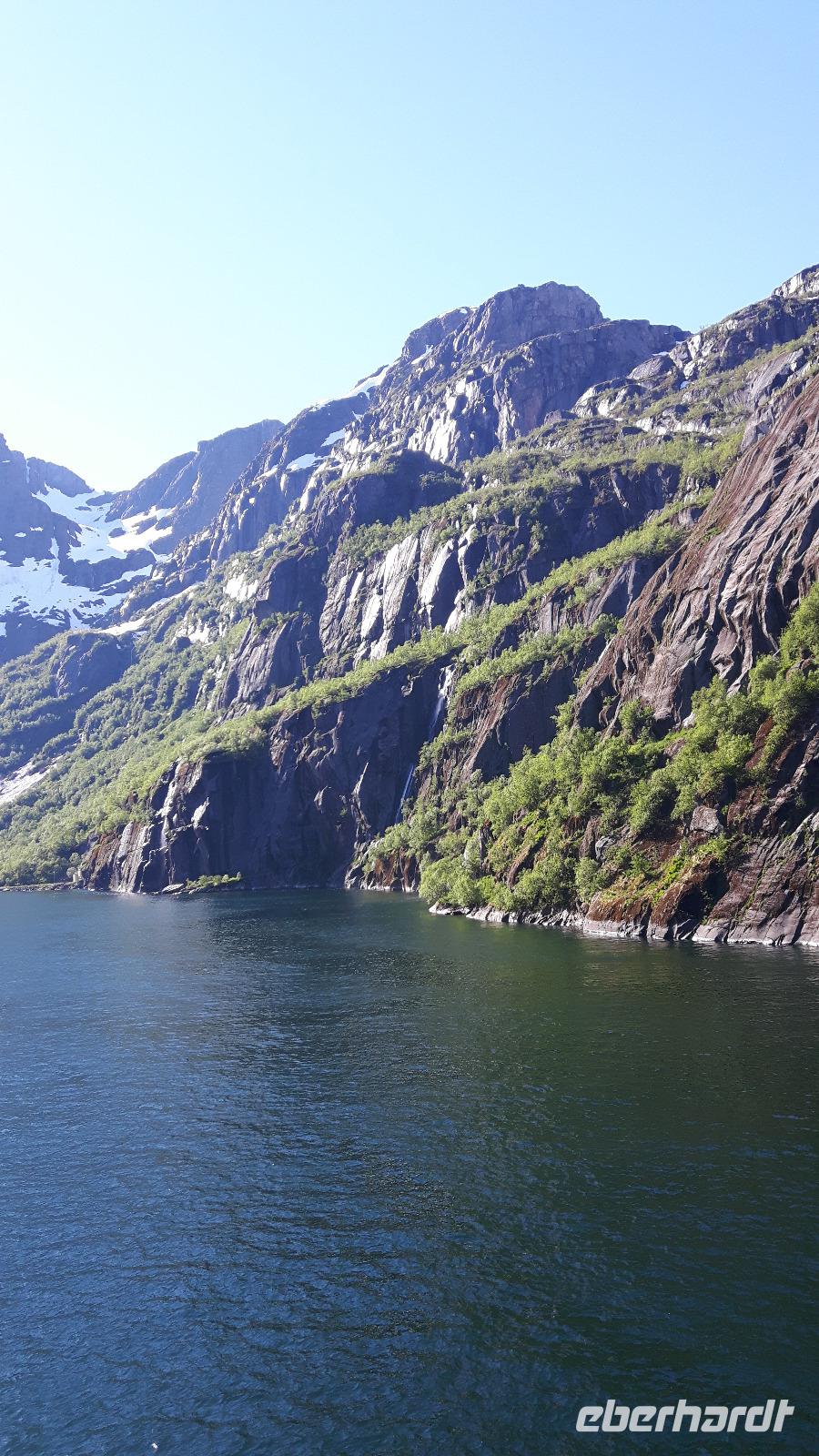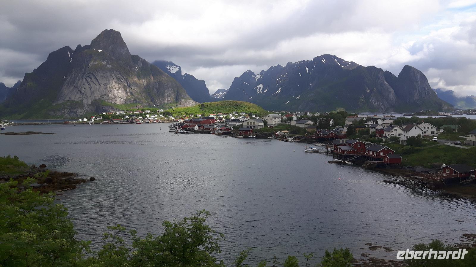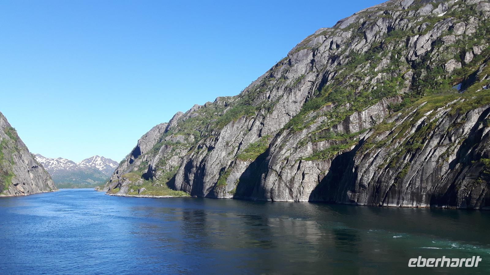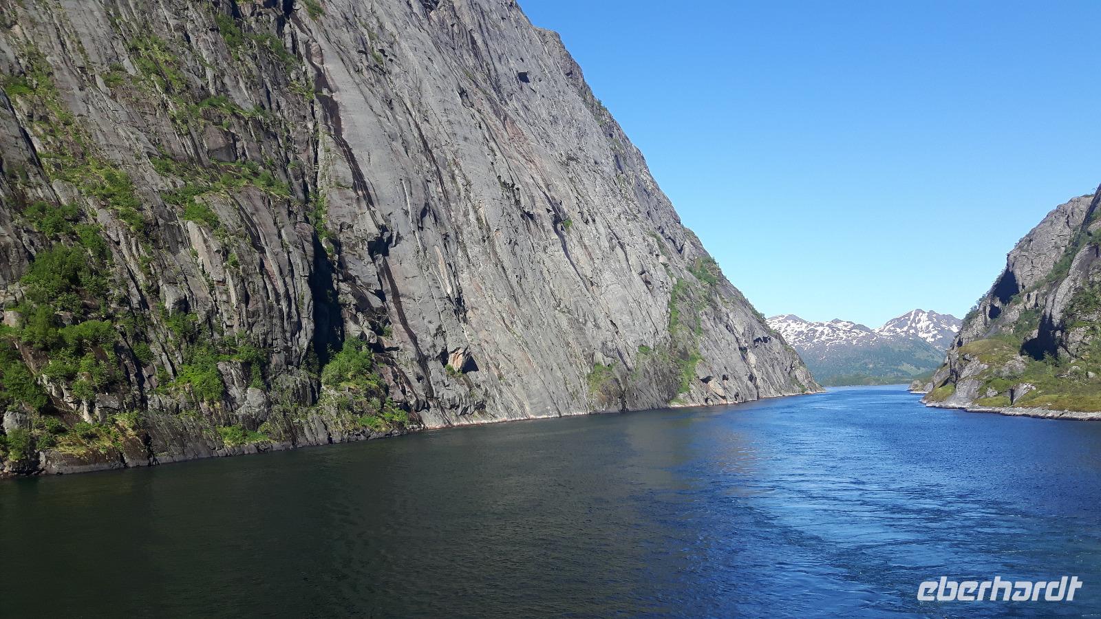 Traumhaft auch der heutige Morgen und in bester Stimmung reisten wir somit weiter. Wir fuhren am Balsfjord vorbei, dann weiter durch die Berge und über die Fjelle von Troms... und gegenüber von Narvik am Ofotfjord entlang. Nach der Überquerung der Tjeldsundbrücke kamen wir auf den Vesterålen, einer überaus facettenreichen Inselgruppe, an. Die Landschaftsvielfalt reicht hier von ruhigen, friedlichen Stränden, Wiesen und Weiden bis zu zerklüfteten alpinen Höhenzügen, dramatischen Fjorden und uriger Wildnis. Unser Bus brachte uns zum Hurtigruten-Kai in Stokmarknes, dem Ausgangspunkt unserer Mini-Kreuzfahrt auf einem der Postschiffe! In diesem idyllischen Dorf gründete Richard With übrigens vor mehr als 120 Jahren die erste Hurtigruten-Reederei! Unser Schiff, die MS „Nordnorge", fährt seit 1997 in der Hurtigruten-Flotte. Wer Norwegen hautnah erleben will, der sollte unbedingt die Hurtigruten kennenlernen. Es handelt sich dabei um die traditionelle norwegische Postschifflinie, über die seit Ende des 19. Jahrhunderts die Ortschaften der westlichen Küste Norwegens, die etwa 2.700 Kilometer umfasst, miteinander verbunden werden. Zwischen Bergen und Kirkenes kreuzen hier Passagier-, Fracht- und Kreuzfahrtschiffe. Diese Strecke bietet somit eine einmalige Gelegenheit, die gesamte Westküste Norwegens mit all ihren Naturschönheiten kennenzulernen. Fjorde, raue und liebliche Landschaften und die Gastfreundschaft der Menschen machen Hurtigruten heute zu einer echten Touristenattraktion und was einst aus der Not heraus geboren wurde, nämlich auch abgelegene nördliche Landesteile mit dem klimatisch begünstigten Süden zu verbinden, ist inzwischen eine Sehenswürdigkeit. Natürlich erlebten wir auf unserer knapp 4-stündigen Fahrt nur eine kleine Etappe dieser eigentlich 12-tägigen Reise, aber immerhin hat man dadurch einen Eindruck von der sogenannten „Schönsten Seereise der Welt". Der Höhepunkt dieser Hurtigruten-Etappe war die schöne Fahrt durch den Raftsund, hinein in den engen Trollfjord - inzwischen begleitet von herrlichem Sonnenschein! Unser Buschauffeur Andreas erwartete uns am frühen Abend in Svolvær, dem Hauptort der Lofoten. Die Lofoten sind ein weiteres und echtes Highlight dieser Reise! Das zeigt sich sofort, als wir in Svolvær wieder in unseren Reisebus steigen und über die Inselgruppe zur Übernachtung zu den Rorbuhütten von Mortsund fahren. Entlang der Küste Nordlands gibt es diese alten wiederhergerichteten ehemaligen Unterkünfte der Fischer zu mieten und eine Übernachtung hier ist etwas ganz Besonderes. Die Hütten dienten den Fischern ursprünglich als Behausung während längerer Fangperioden. Heute werden die gut ausgestatteten und restaurierten Hütten nur noch für Urlaub und Freizeit genutzt. Bei der Restaurierung legt man Wert auf die Erhaltung des ursprünglichen Gebäudes und kombiniert gleichzeitig Tradition mit den Annehmlichkeiten der heutigen Zeit. Das „Statles Rorbu- og Konferansesenter AS" liegt im idyllischen Mortsund, einem kleinen Fischerdorf, und genau hier, mitten im Herzen der Lofoten, verbrachten wir zwei Nächte.