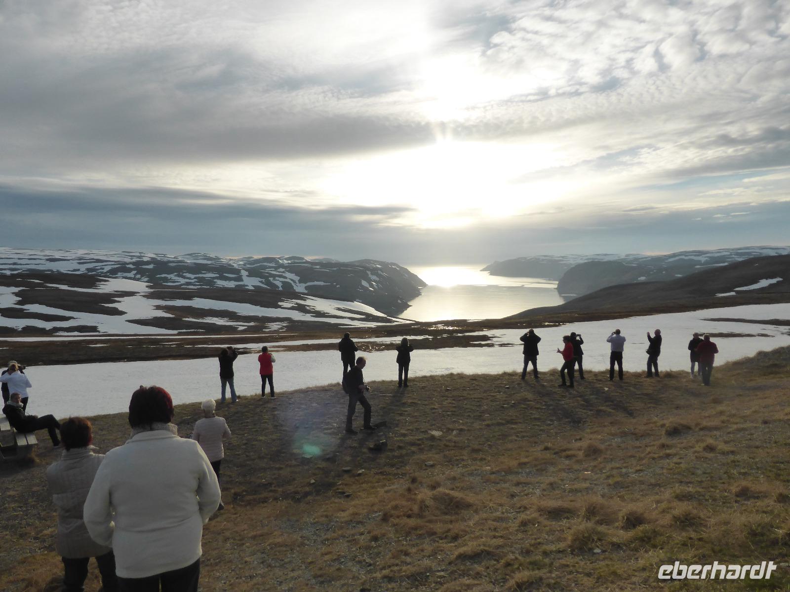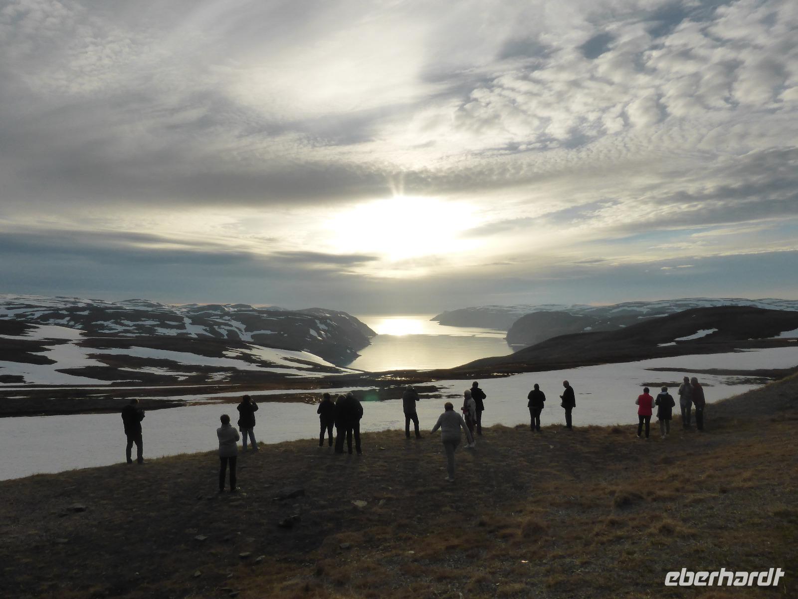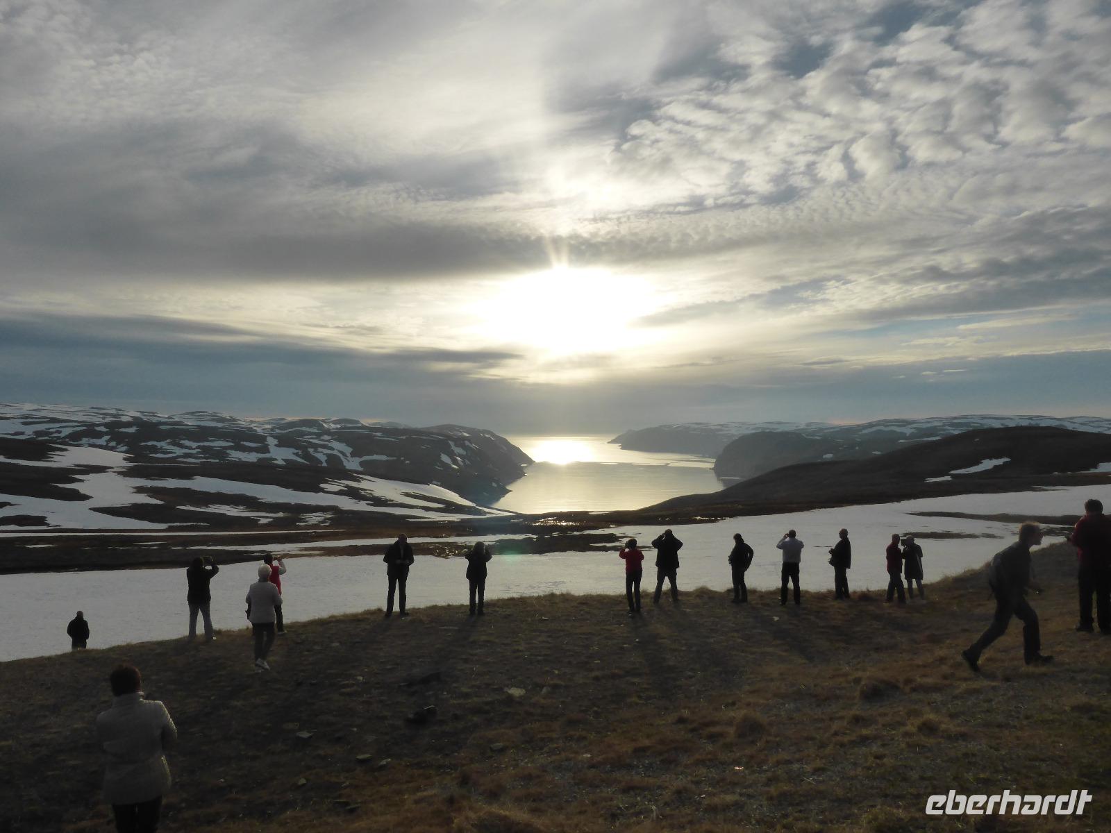 Heute war es endlich soweit - unser Ziel das Nordkapp rückte immer näher. Bei strahlend blauem Himmel setzten wir unsere Reise nach Norden fort. Nach einem kurzen Stopp am Inari See erreichten wir die Bärenhöhle. Dabei handelt es sich um einen Gletschermühle, in der der Legende nach ein Bär und ein Mensch einst zusammen Schutz gesucht hatten. Beeindruckend war der Besuch des Saiidi Museum in Inari. Das finnische Samenmuseum präsentiert das Urvolk der Samen auf eine besondere Art und Weise. Die Eismeerstrasse führte uns dann direkt an die Grenze nach Norwegen. Auf norwegischer Seite passierten wir Karasjok, dem Hauptort der norwegischen Samen. Unser erster Fjord war der Porsangerfjord. Er reicht ca. 132 km ins Landesinnere und ist flächenmäßig einer der größten Nordnorwegens. Durch das 6870 m lange Nordkaptunnel und 220 m unter dem Meeresspiegel erreichten wir die Nordkapinsel Mageroya. In Honningsvag bezogen wir das Scandic Hotel. Nach dem Abendessen chauffierte uns dann Claudia ans Nordkapp bei recht schönem Wetter. Das Wolkenspiel faszinierte uns. Bei recht gutem Wetter und angenehmen acht Grad und völlig windstill erreichten wir das Nordkapp. Die Mitternachtssonne zog uns in ihren Bann. Wir konnten die gesamte Eismeerküste überblicken und natürlich auch den 307 m hohen Nordkapfelsen.