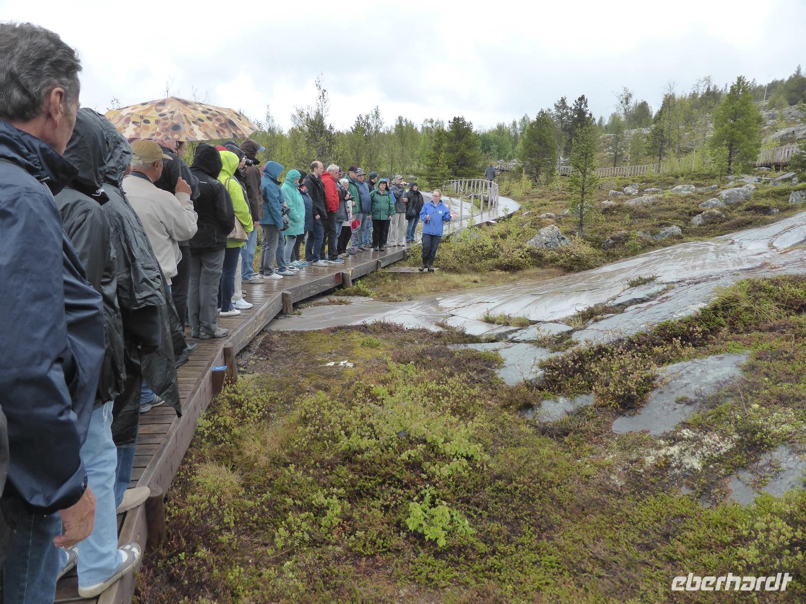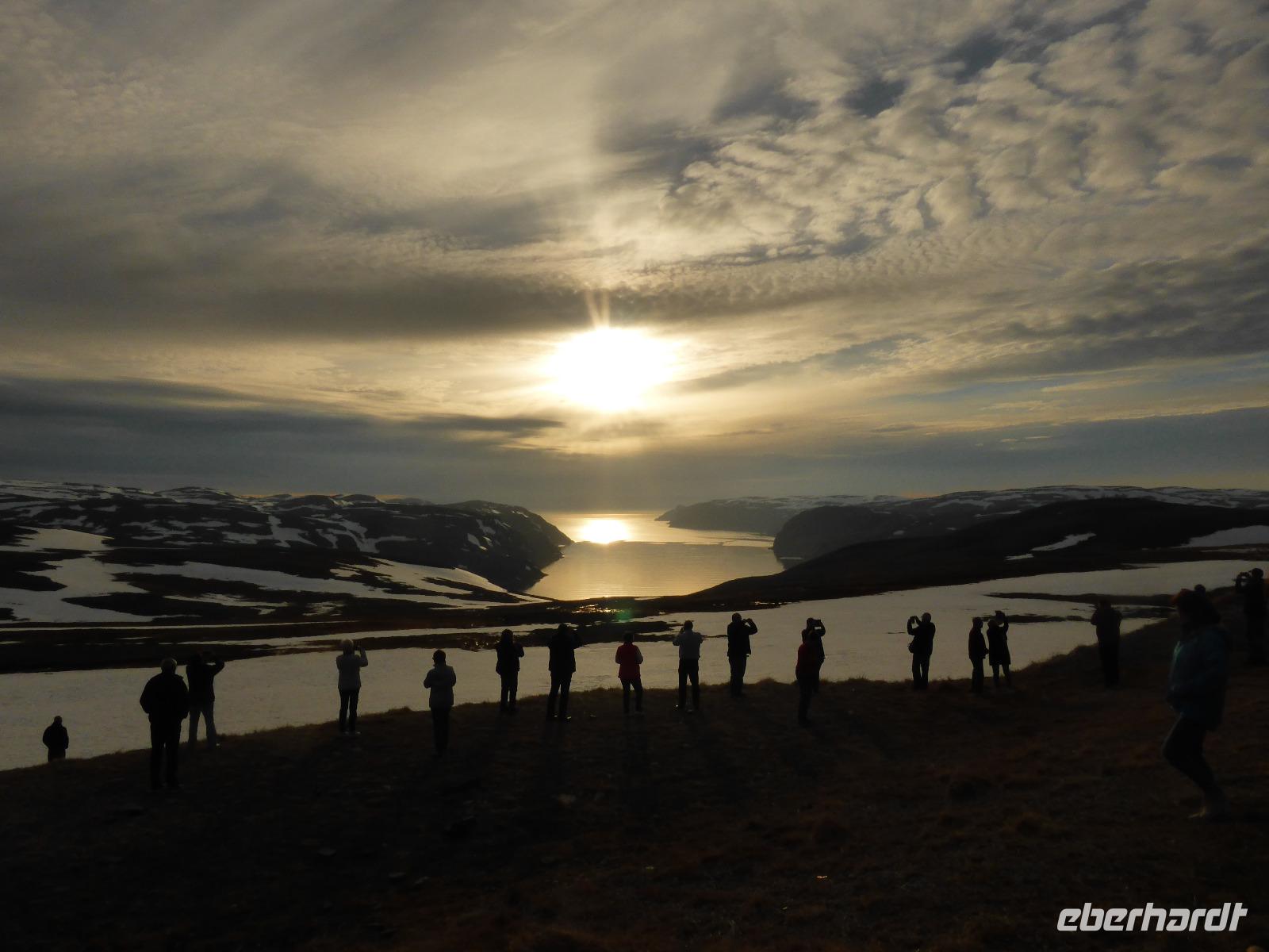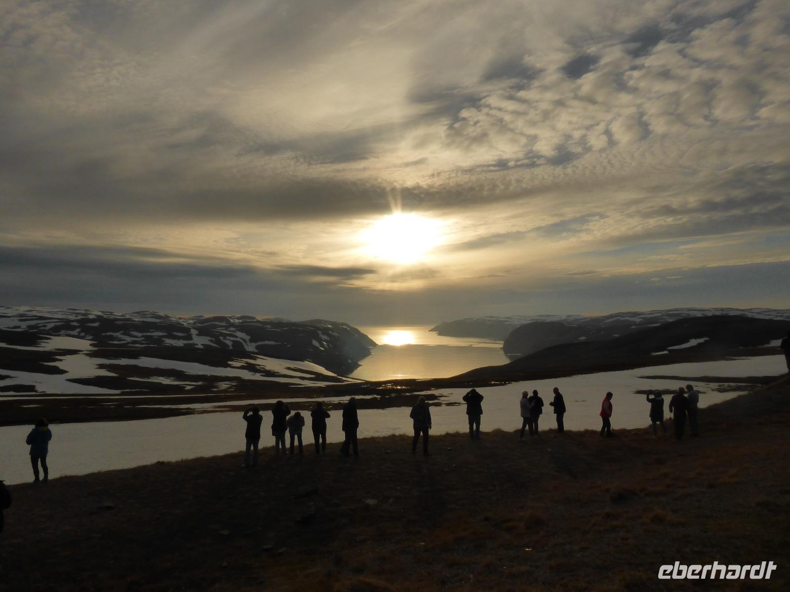 Heute war es endlich soweit - unser Ziel das Nordkapp rückte immer näher. Bei strahlend blauem Himmel setzten wir unsere Reise nach Norden fort. Nach einem kurzen Stopp am Inari See erreichten wir die Bärenhöhle. Dabei handelt es sich um einen Gletschermühle, in der der Legende nach ein Bär und ein Mensch einst zusammen Schutz gesucht hatten. Beeindruckend war der Besuch des Saiidi Museum in Inari. Das finnische Samenmuseum präsentiert das Urvolk der Samen auf eine besondere Art und Weise. Die Eismeerstrasse führte uns dann direkt an die Grenze nach Norwegen. Auf norwegischer Seite passierten wir Karasjok, dem Hauptort der norwegischen Samen. Unser erster Fjord war der Porsangerfjord. Er reicht ca. 132 km ins Landesinnere und ist flächenmäßig einer der größten Nordnorwegens. Durch das 6870 m lange Nordkaptunnel und 220 m unter dem Meeresspiegel erreichten wir die Nordkapinsel Mageroya. In Honningsvag bezogen wir das Scandic Hotel. Nach dem Abendessen chauffierte uns dann Claudia ans Nordkapp bei recht schönem Wetter. Das Wolkenspiel faszinierte uns. Bei recht gutem Wetter und angenehmen acht Grad und völlig windstill erreichten wir das Nordkapp. Die Mitternachtssonne zog uns in ihren Bann. Wir konnten die gesamte Eismeerküste überblicken und natürlich auch den 307 m hohen Nordkapfelsen.