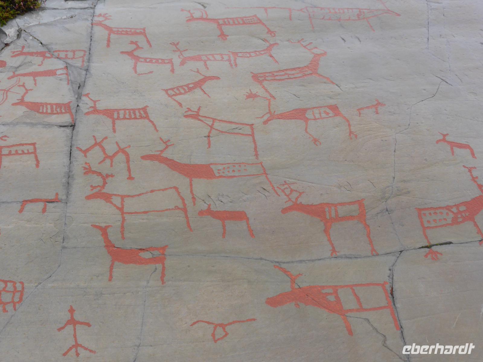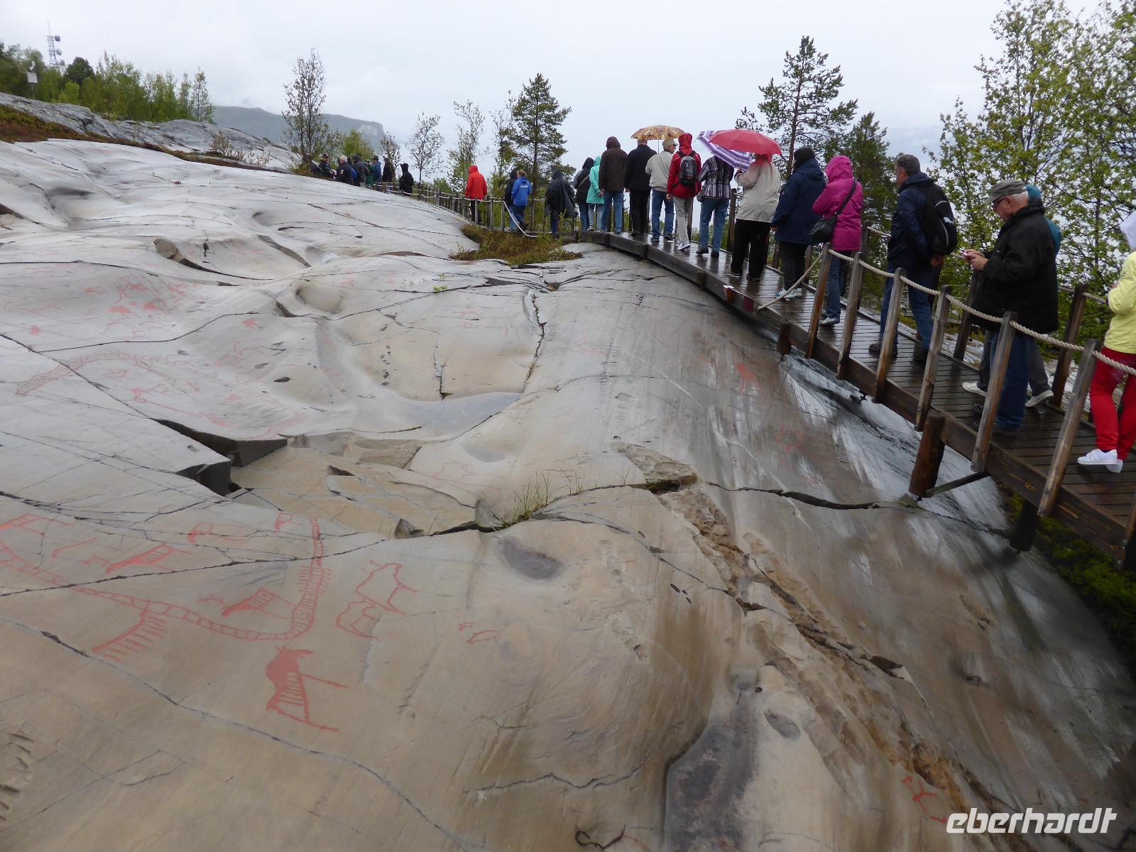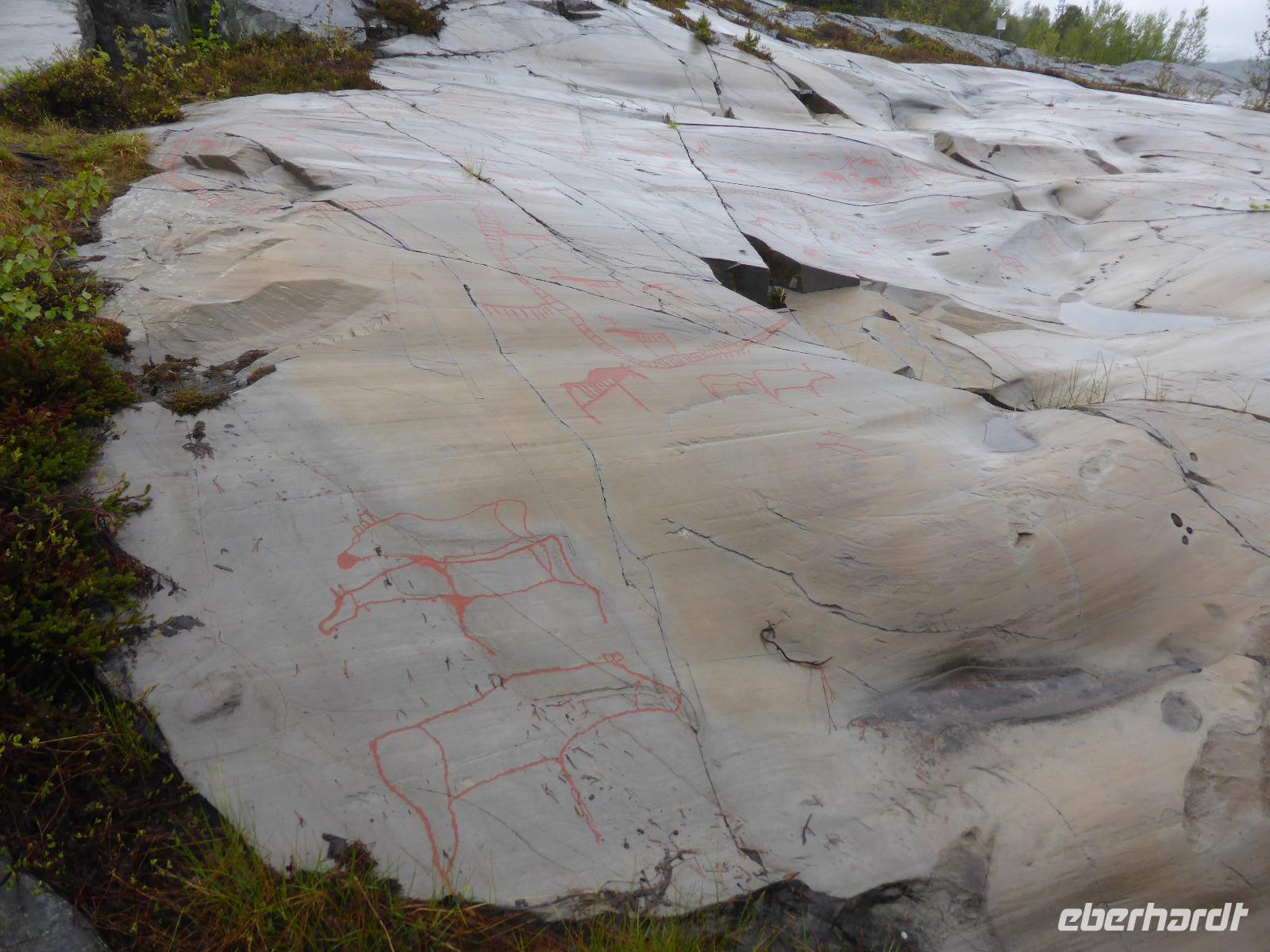 Noch etwas müde traten wir unsere „Heimreise" an. Die Nordkapinsel verließen wir bei trübem regnerischem Wetter, da fiel der Abschied nicht ganz so schwer. Über das Sennalandet erreichten wir Alta mit den 6200 Jahre alten Felszeichnungen. Sara führte uns in die Geheimnisse der Felszeichnungen ein. Entlang der E6 fuhren wir entlang des Lyngenfjordes mit schönen Blicken auf die Lyngenalpen nach Oteren. Am Abend erreichten wir unser Hotel Welcome Inn Lyngskroa in Oteren an der E6. Einen sehr herzlichen Empfang bereitete uns das hübsche familiengeführte Hotel. Die liebevolle Einrichtung sowie die zauberhafte Lage wollten uns länger verweilen lassen. Gestärkt wurden wir durch eine deftige Hühnersuppe als Vorspeise. Doch am nächsten Tag sollte es weiter gehen auf die Lofoten.