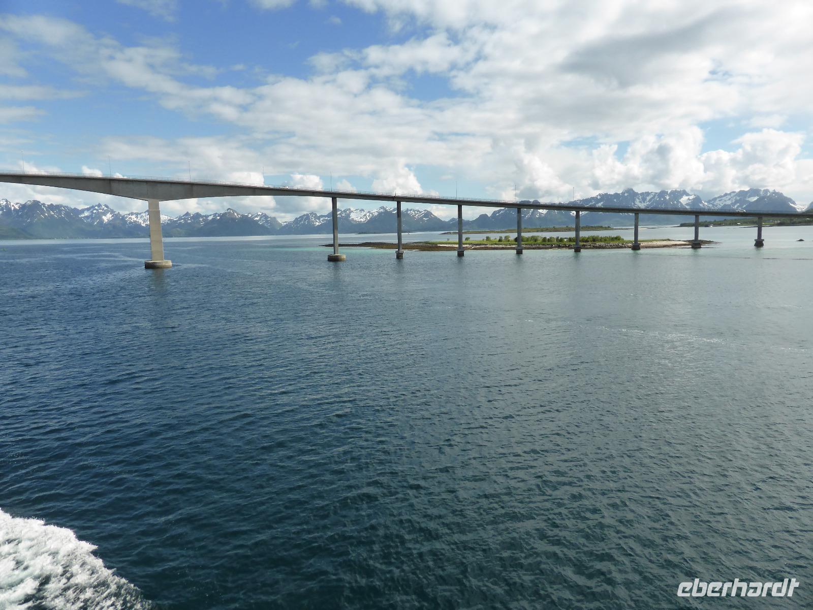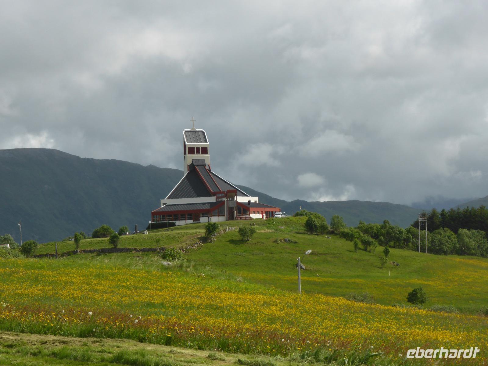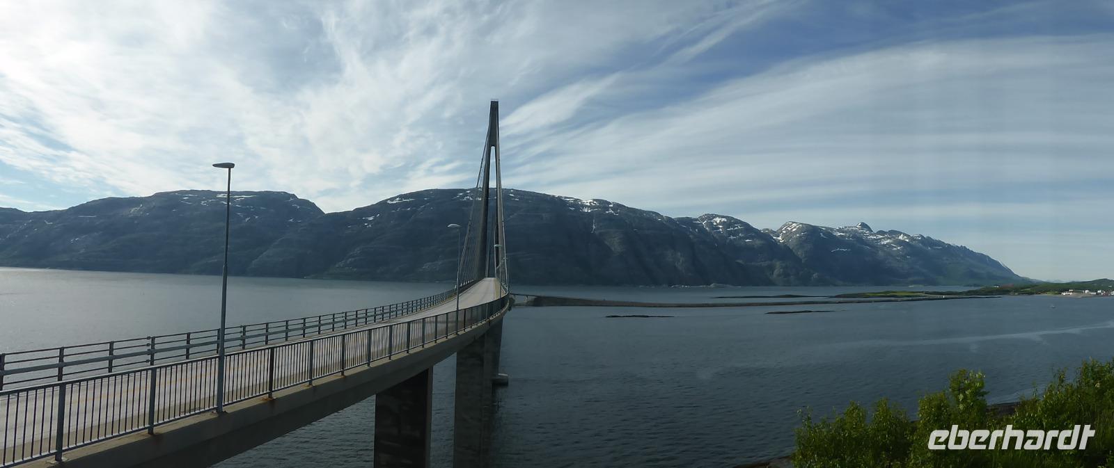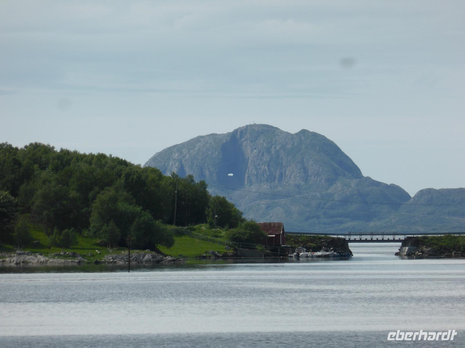 Auf unserer Panoramafahrt nutzten wir drei Fähren von Tjötta nach Forvik, von Anddalsvagen nach Horn und Vennesund nach Holm. Vor der ersten Fähre legten wir allerdings noch einige Stopps ein: am Haus sowie der Kirche des Dichter-Pfarrers Petter Dass, der 1065 m langen Helgelandbrücke sowie am „Haus des Windes".