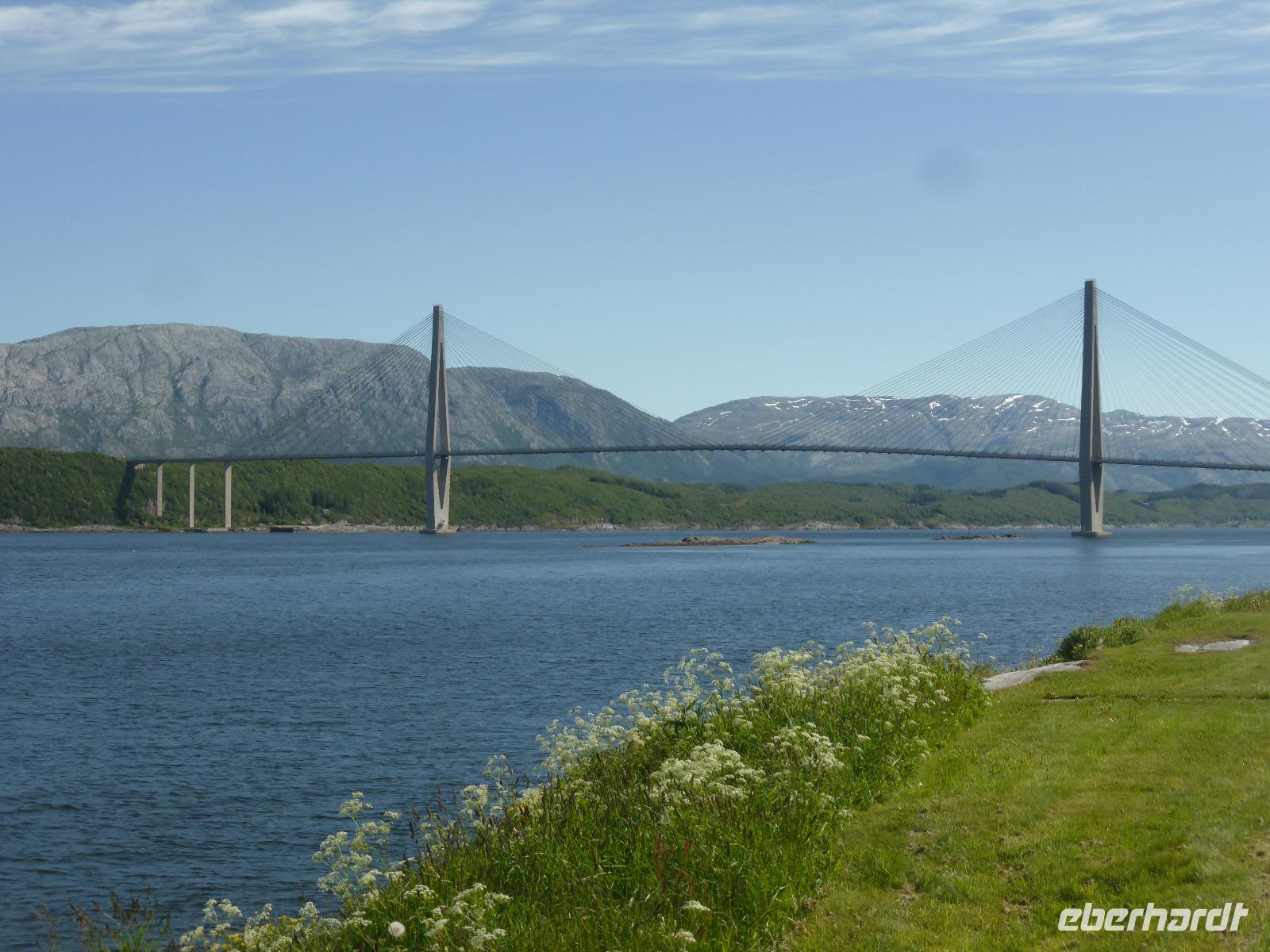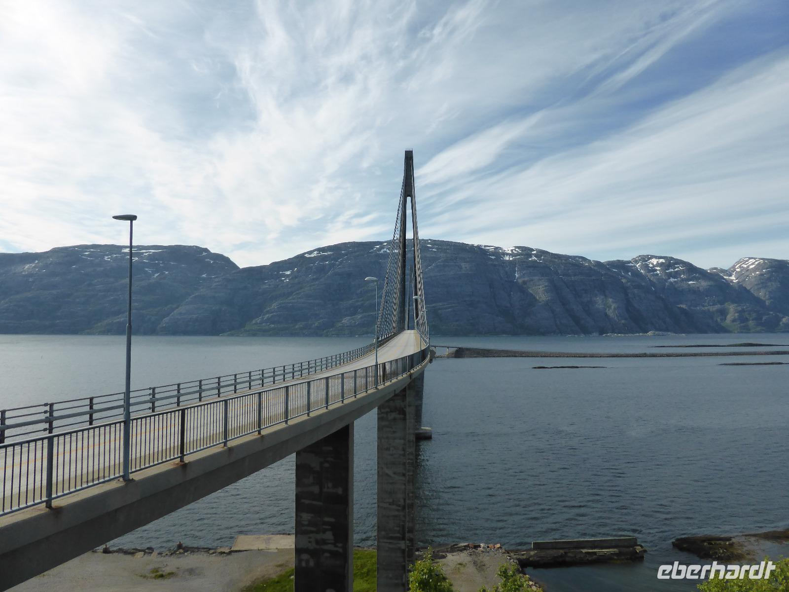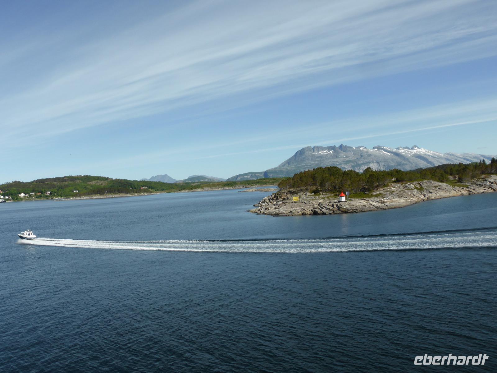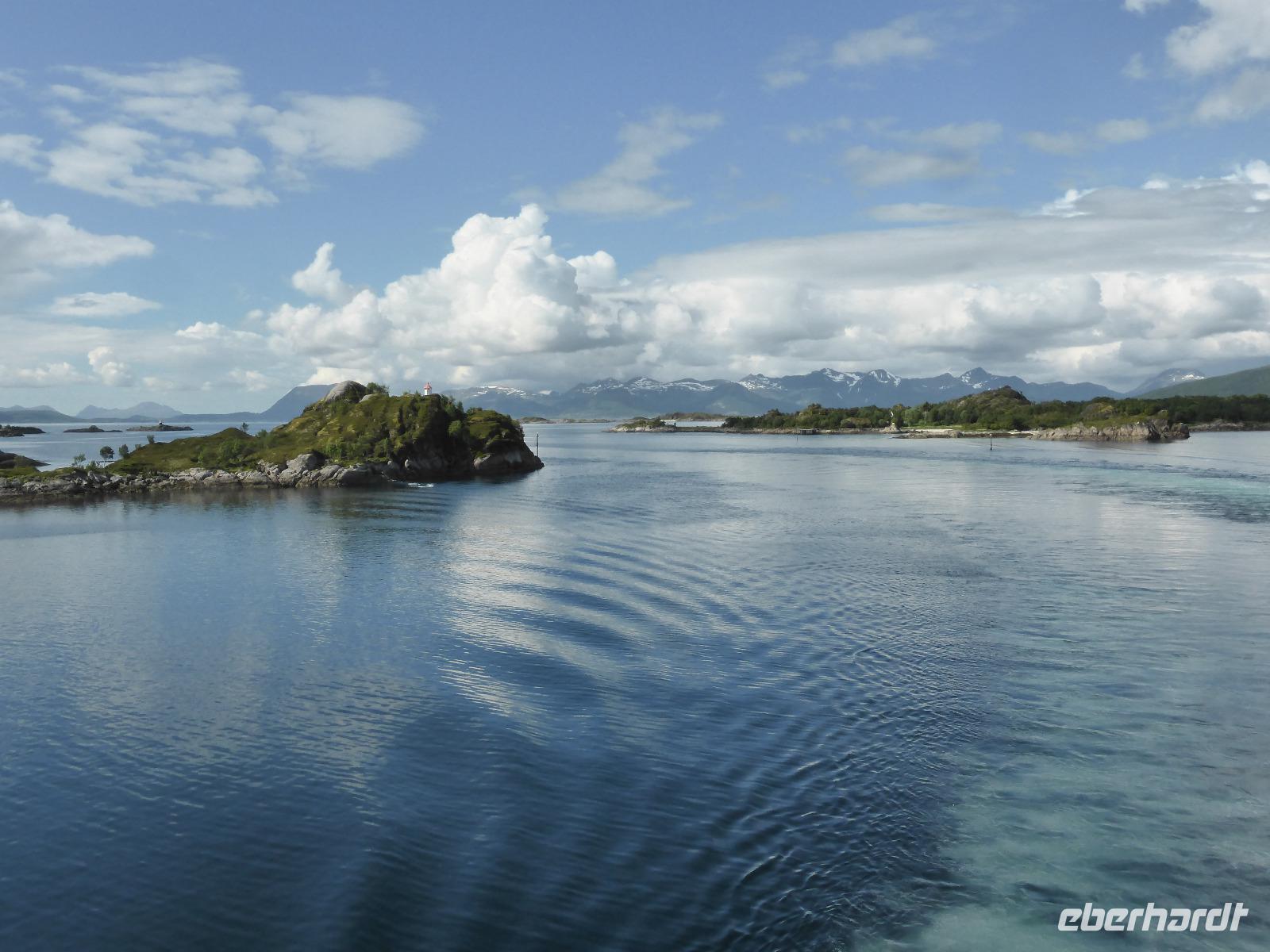 Auf unserer Panoramafahrt nutzten wir drei Fähren von Tjötta nach Forvik, von Anddalsvagen nach Horn und Vennesund nach Holm. Vor der ersten Fähre legten wir allerdings noch einige Stopps ein: am Haus sowie der Kirche des Dichter-Pfarrers Petter Dass, der 1065 m langen Helgelandbrücke sowie am „Haus des Windes".