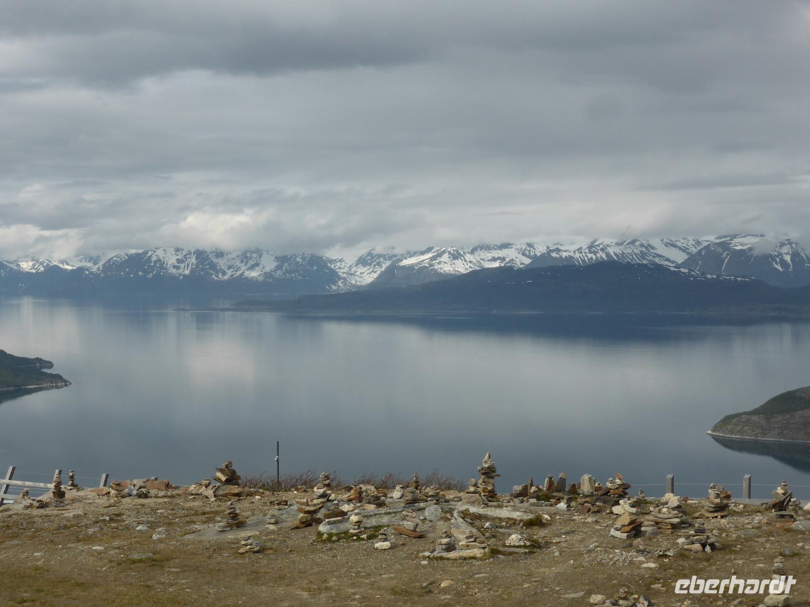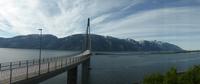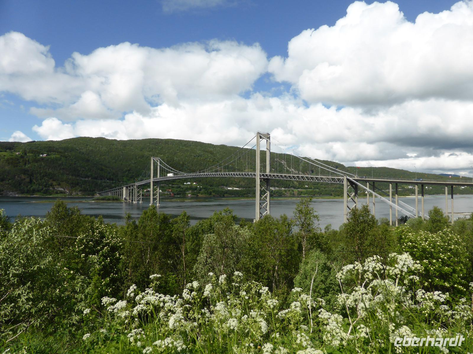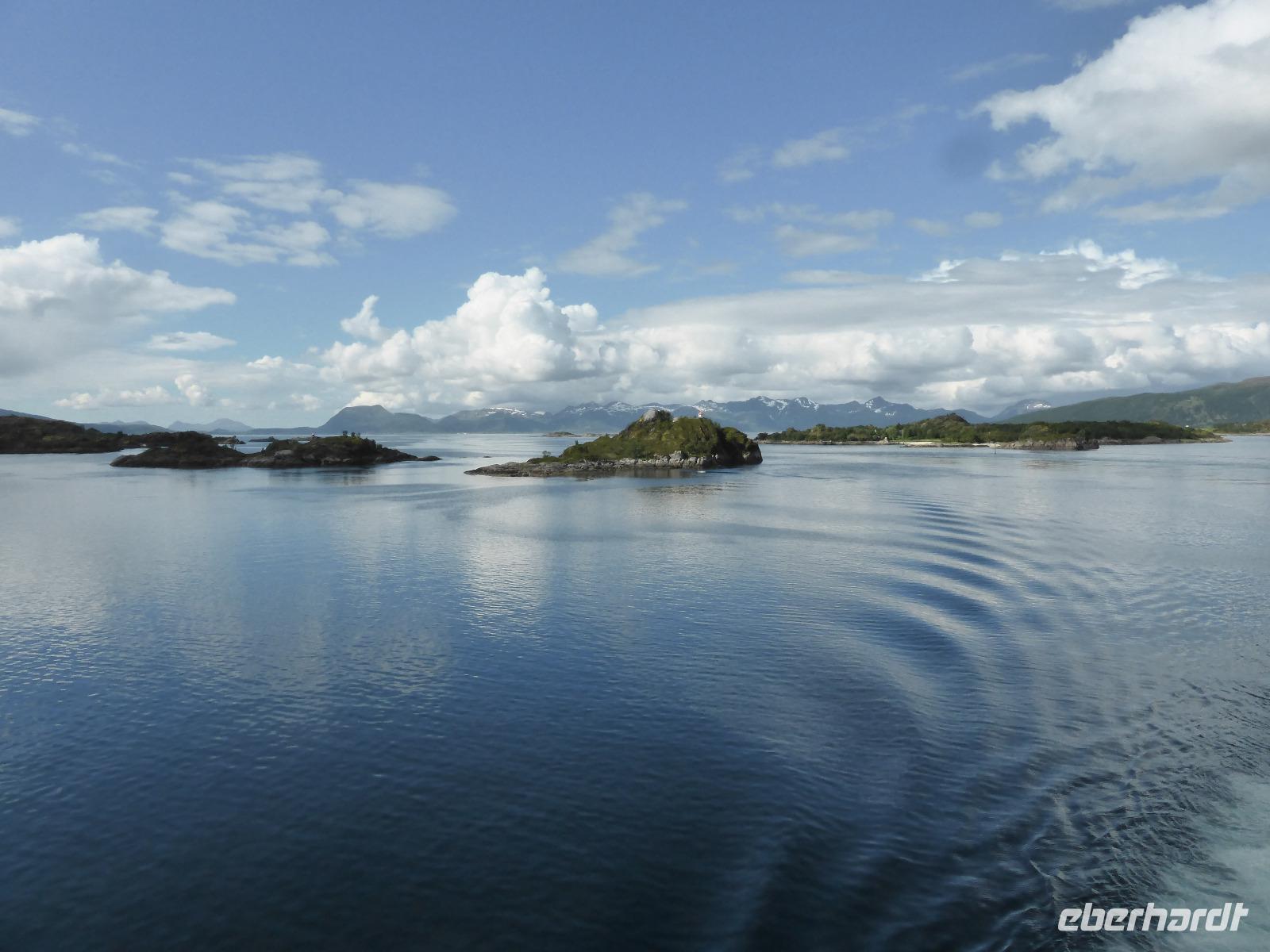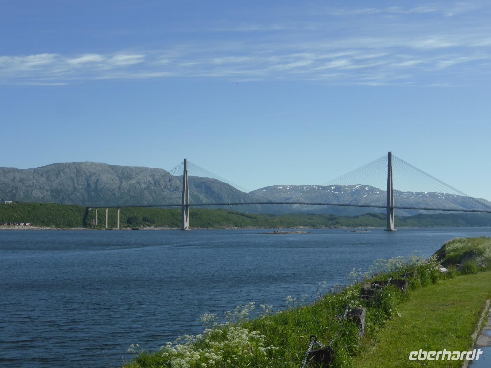 Auf unserer Panoramafahrt nutzten wir drei Fähren von Tjötta nach Forvik, von Anddalsvagen nach Horn und Vennesund nach Holm. Vor der ersten Fähre legten wir allerdings noch einige Stopps ein: am Haus sowie der Kirche des Dichter-Pfarrers Petter Dass, der 1065 m langen Helgelandbrücke sowie am „Haus des Windes".
