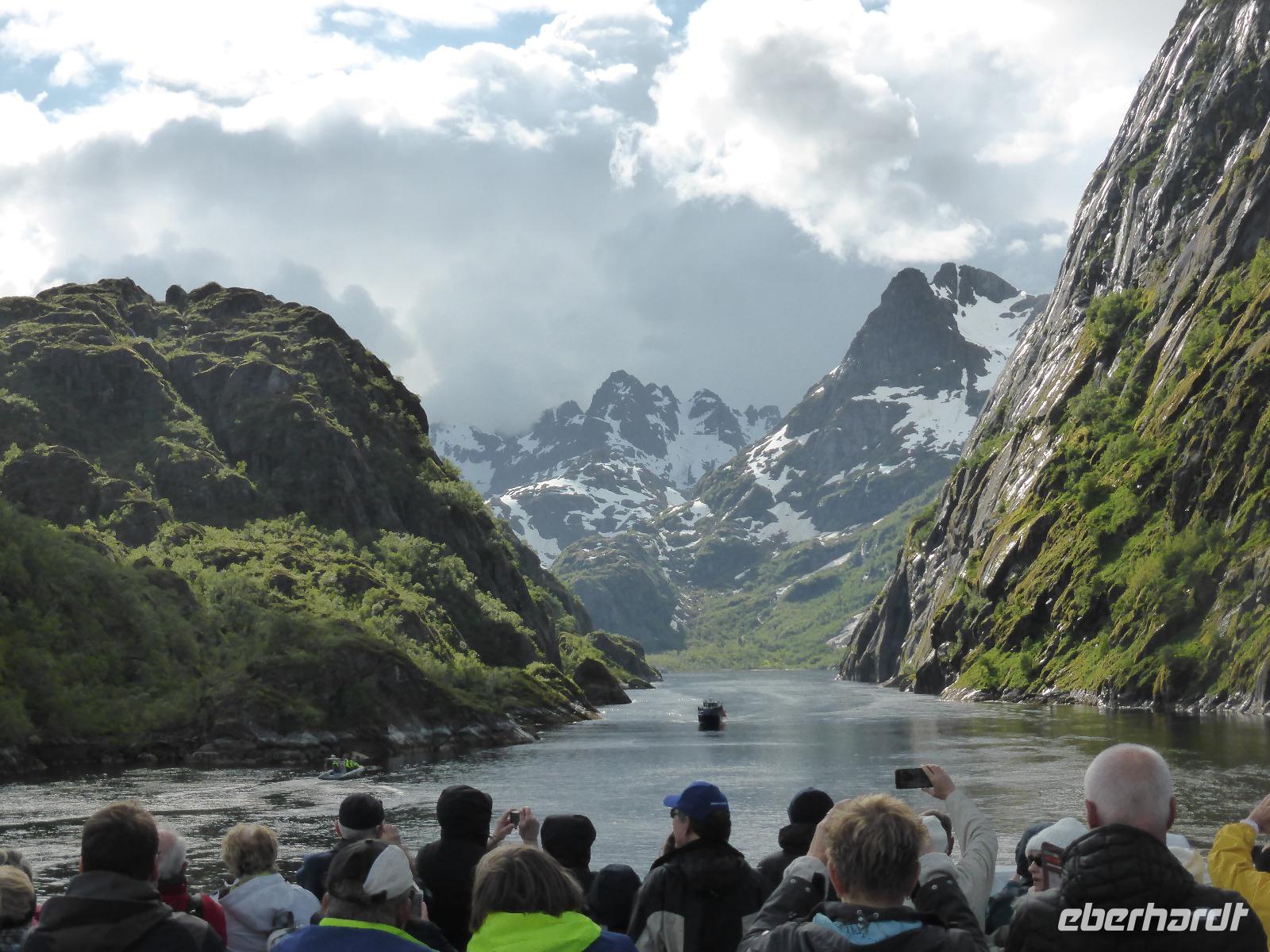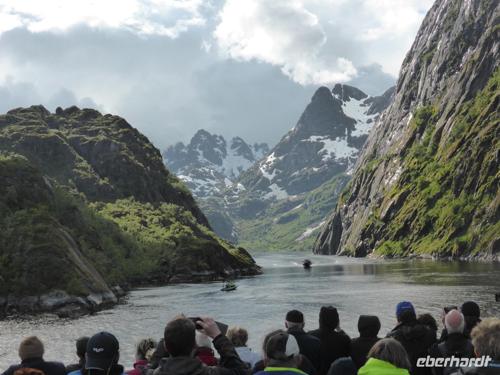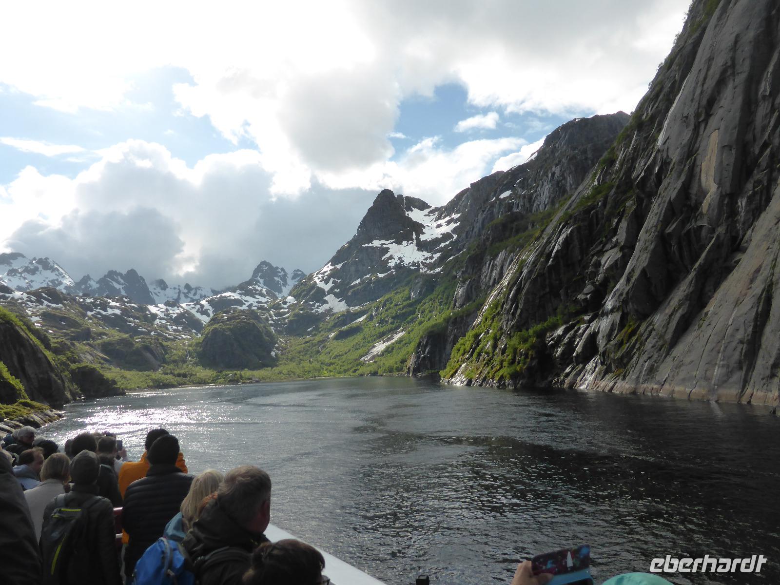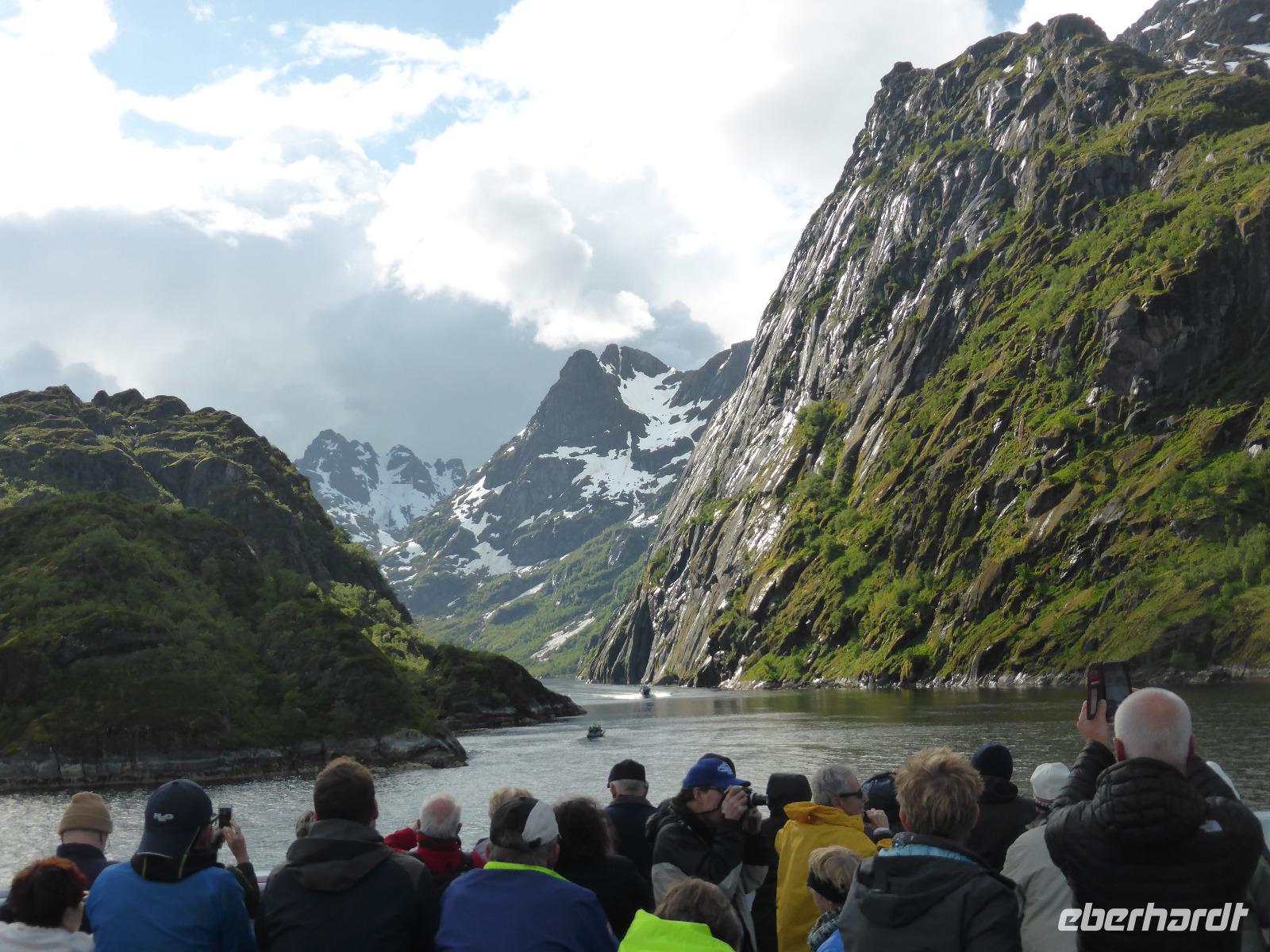 Heute war es am Morgen etwas bewölkt. Mit der Fahrt zog es sich immer weiter auf, sodass wir die Vesteralen bei Sonnenschein erreichten. Bei Gratanger genossen wir einen Blick auf den glecihnamigen Fjord. Nach der Mittagspause an der Tjeldsundbrücke erreichten wir die Insel Hinnoya, die größte der Vesterålen. Unser Zielt war Stokmarknes. Hier begann 1893 die Geschichte der „Reichsstrasse 1" oder auch der schönsten Seereise der Welt der Hurtigrute. Unser Schiff „MS Finnmarken" brachte uns durch den berühmten Raftsund und den Trollfjord nach Svolvaer bei schönstem Wetter. Angelangt auf den Lofoten verließen wir das Schiff in Svolvaer. Kurz nach Svolvaer legten wir einen Fotostopp an der Lofotenkathedrale in Kabelvag ein. Vorbei an Leknes erreichten wir unser Quartier, die Statlers Rorbuhütten für die nächsten beiden Nächte in Mortsund.