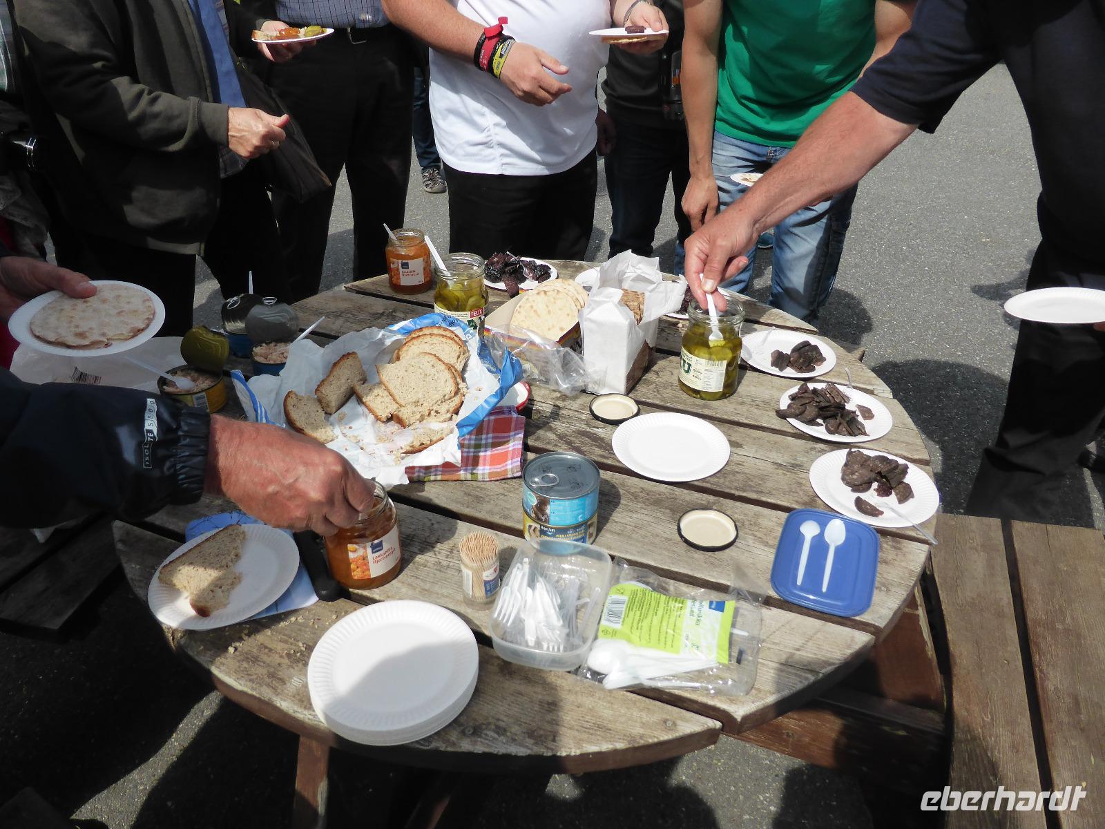 In Berg überraschten uns Steffen und Claudia mit einem kleinen skandinavischen Picknick. Wir probierten Elch- und Rentierwurst, Moltebeermarmelade, Thunfisch und Knäckebrot.
