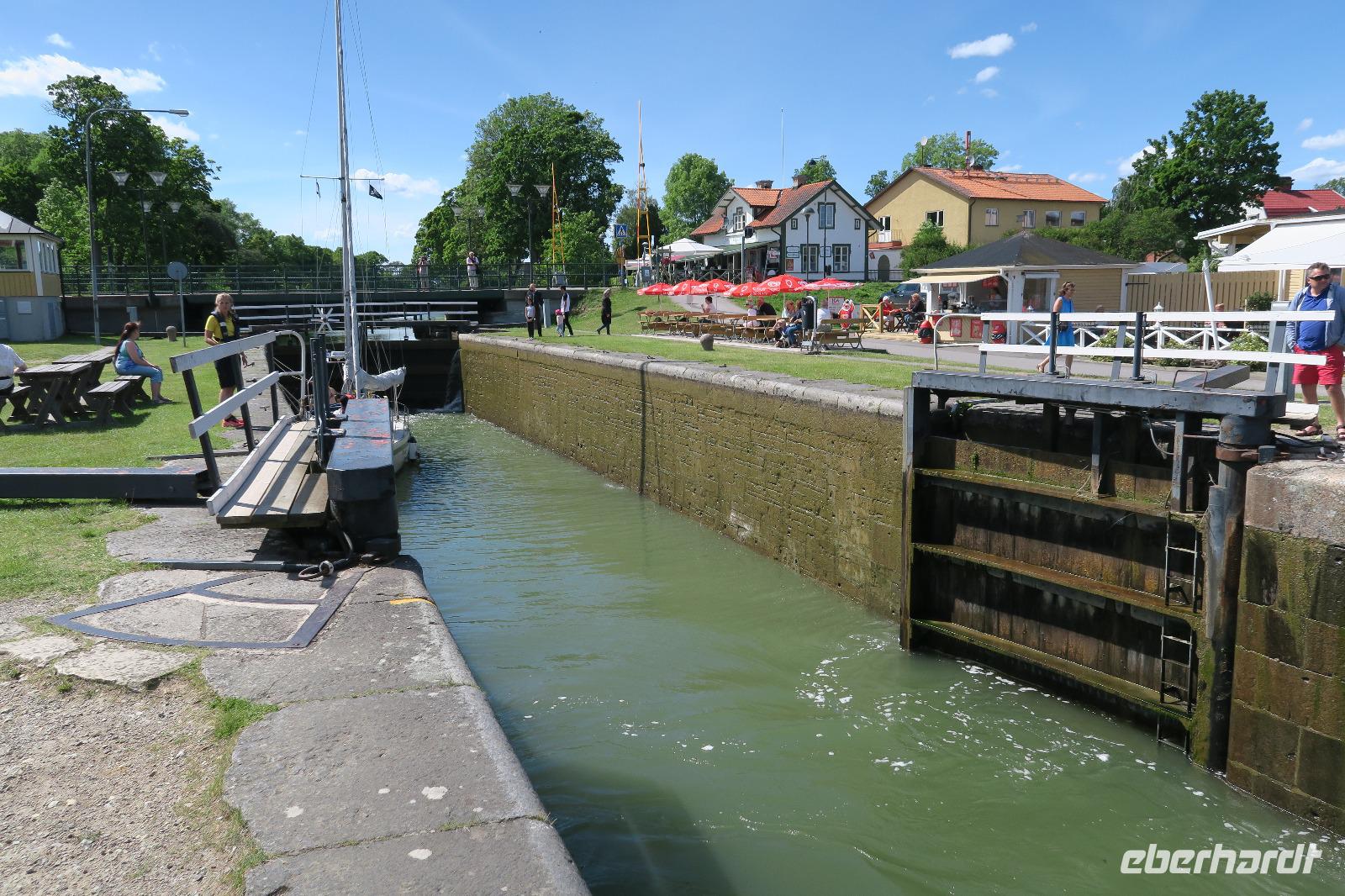 Am nächsten Tag sind wir in Schweden erwacht. Die Einfahrt in den Hafen von Göteborg, der zweit größten Stadt 580T.Einwohner in Schweden bei Sonnenschein, war auch ein Highlight. Eine Brücke, Fischerhäuser, Festung und viel Hafenatmosphäre konnte man bewundern. Nach einem guten Frühstück haben wir die Fähre verlassen und mit dem Bus ging es Richtung Stockholm. Unterwegs gab es einen Stopp in Gränna. Hier haben wir Süßigkeiten kennen gelernt, die dort hergestellt wurden. Im Anschluss fuhren wir durch diesen kleinen Ort, der sehr schön anzusehen war. Eine Touristenattraktion. Die Fahrt ging dann die ganze Zeit über am Vätternsee dem fünftgrößten See entlang. Unser nächstes Ziel war der Runenstein aus dem 9 Jahrhundert in Röck 4 m hoch neben einer Kirche von 1862 gelegen. Nach einem kleinen Mittagessen vor Ort fuhren wir zum nächsten Höhepunkt dem Göta Kanal bei Berg. Das Ganze bei schönem Sonnenschein und 20 Grad. Wir hatten Glück und ein Schiff wurde durchgeschleust. Die Schleuse hat 7 Kammern, durch die das Schiff geschleust wurde. Der Kanal ist 191km lang und verbindet 5 Seen miteinander. Er wurde 1832 eröffnet. Heute ist es nur noch eine Touristenattraktion. Geöffnet von Mai bis Sept. Zum Schluss des Tages ging es zum Hotel Scandic Talk Hotel. Die Fluggäste sind auf unsere Gruppe getroffen. Beim Abendessen hat man sich dann näher kennen gelernt und den morgigen Tag besprochen.