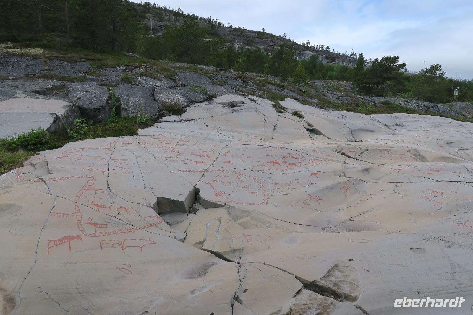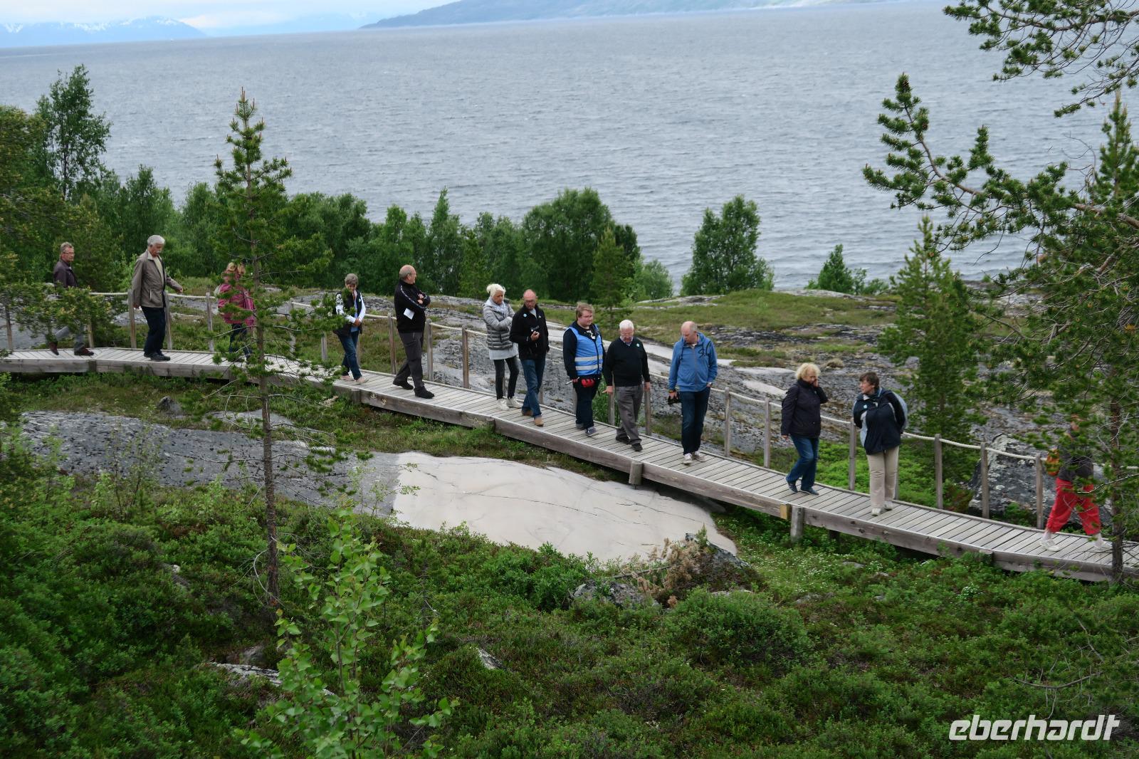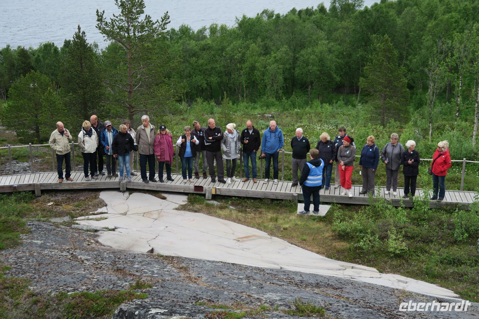 Heute gleich der erste Regen und nur noch 11 Grad. Wir hatten 530 km vor uns. Leider war auf der Fahrt das Wetter nicht schön. Erster Halt wieder in Olderfjord. Hier nochmal die Chance das zu kaufen, was gestern vergessen wurde. Dann ging es weiter nach Alta. Dort haben wir uns die Felszeichnungen mit einem Touristenführer angesehen. Es war recht frisch und man mochte sich nicht sogerne im Freien aufhalten. Die Zeichnungen sind Weltkulturerbe. Für die Meisten genauso wie für den örtlichen Führer waren diese „Bömische Dörfer" vieles nur Vermutungen.