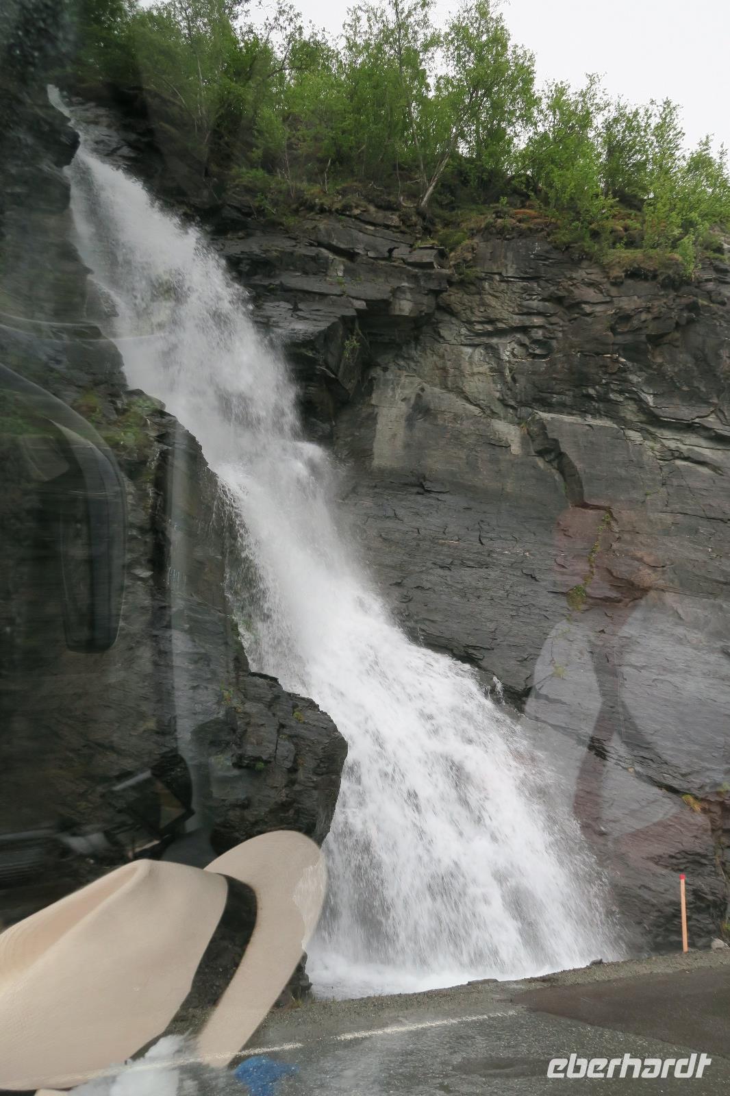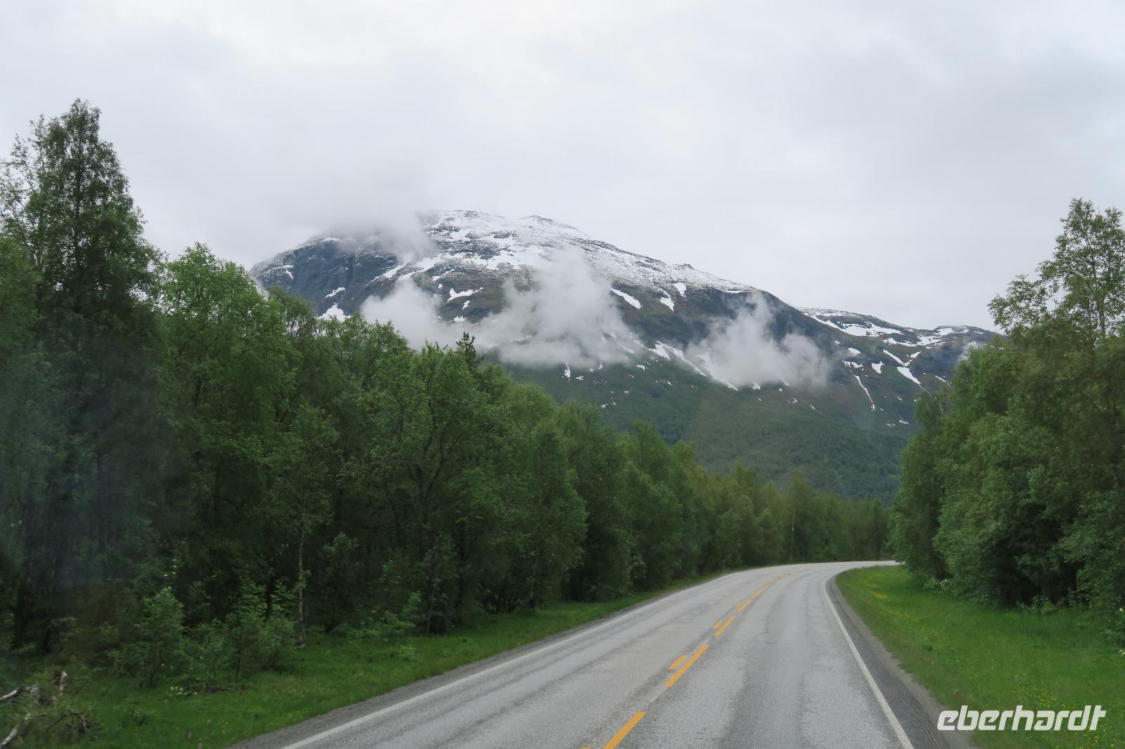 Den nächsten Halt gab es an einem Parkplatz Gildetun Hotel. Normalerweise ein traumhafter Ausblick von hier oben. Aber es war doch recht trübe und so war nicht viel zu sehen von der schönen Umgebung. Unser Hotel in Oteren „Welcome Inn Lyngskroa". Sehr ruhig und schön gelegen. Leider goss es in Strömen.