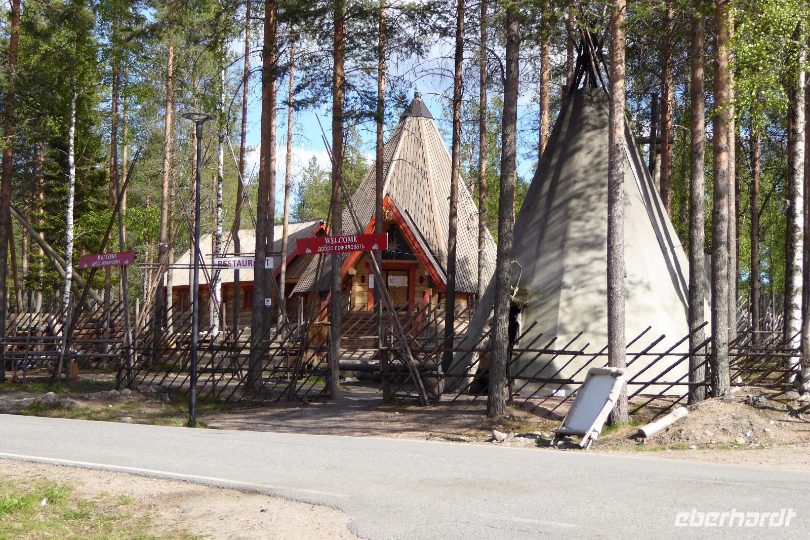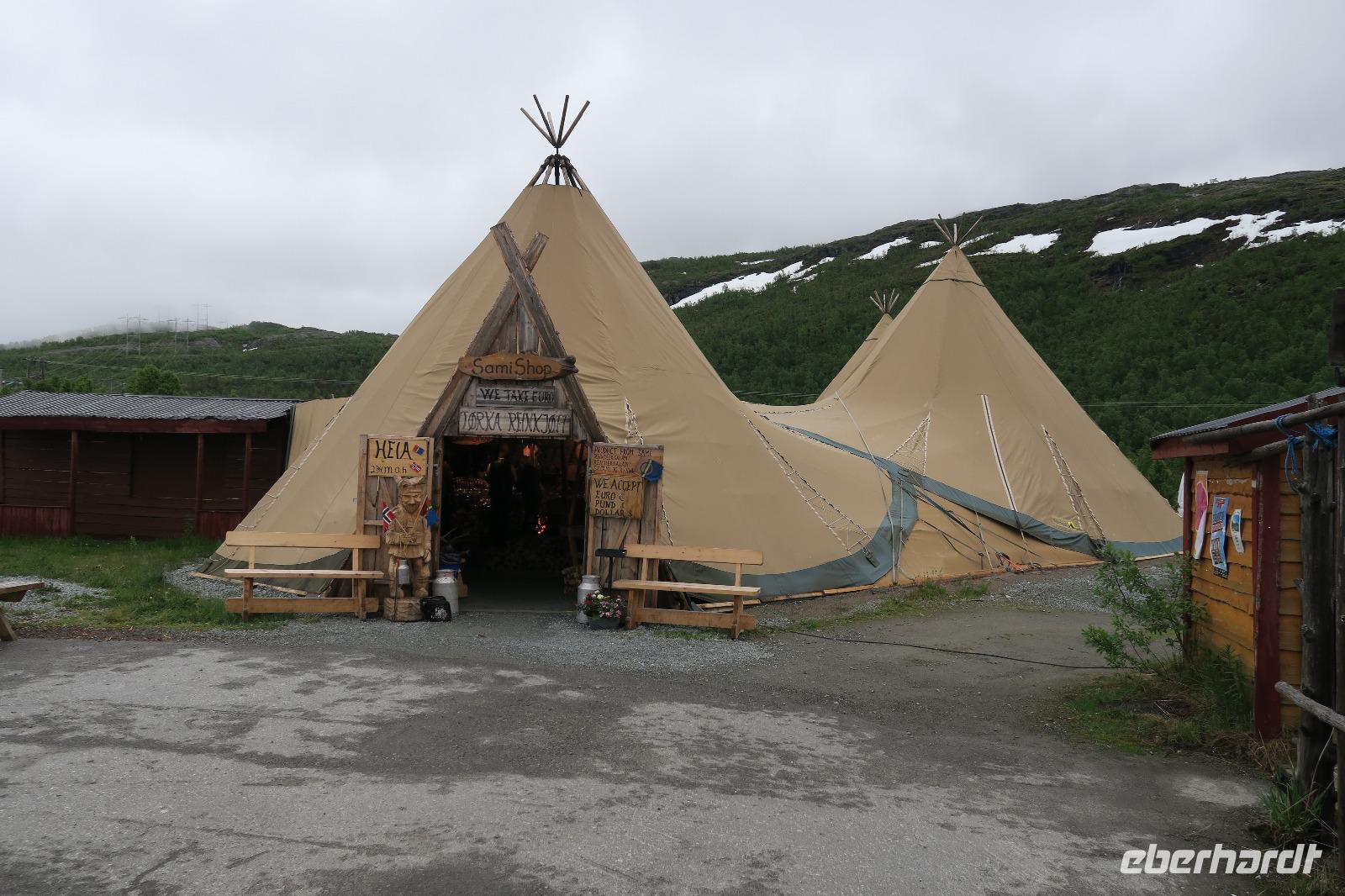 Es begann wieder mit Regen, der aber dann im Laufe der Fahrt verschwand. Die Sonne ließ sich auch mal sehen 12 Grad. Wir hielten als erstes an einem Lap Camp. Sehr schön, gut sortiert und man konnte in € bezahlen. Wurst vom Ren/Elch war hier der Hit der Gäste. Gekauft wurde reichlich.
