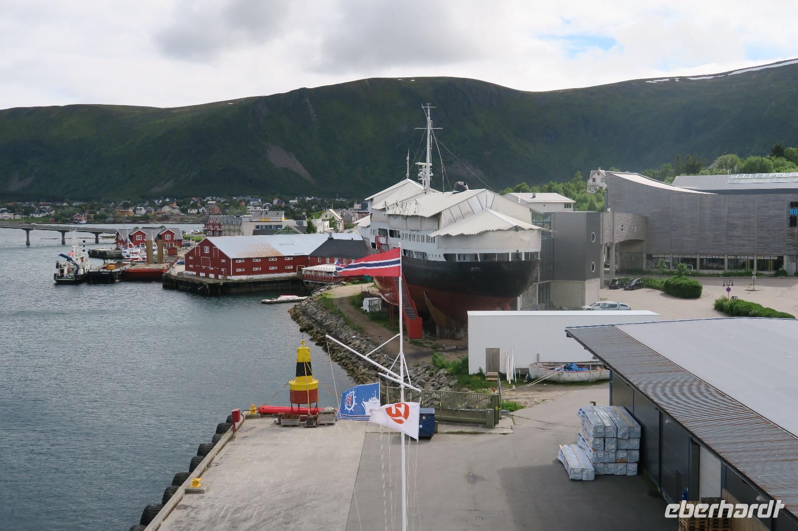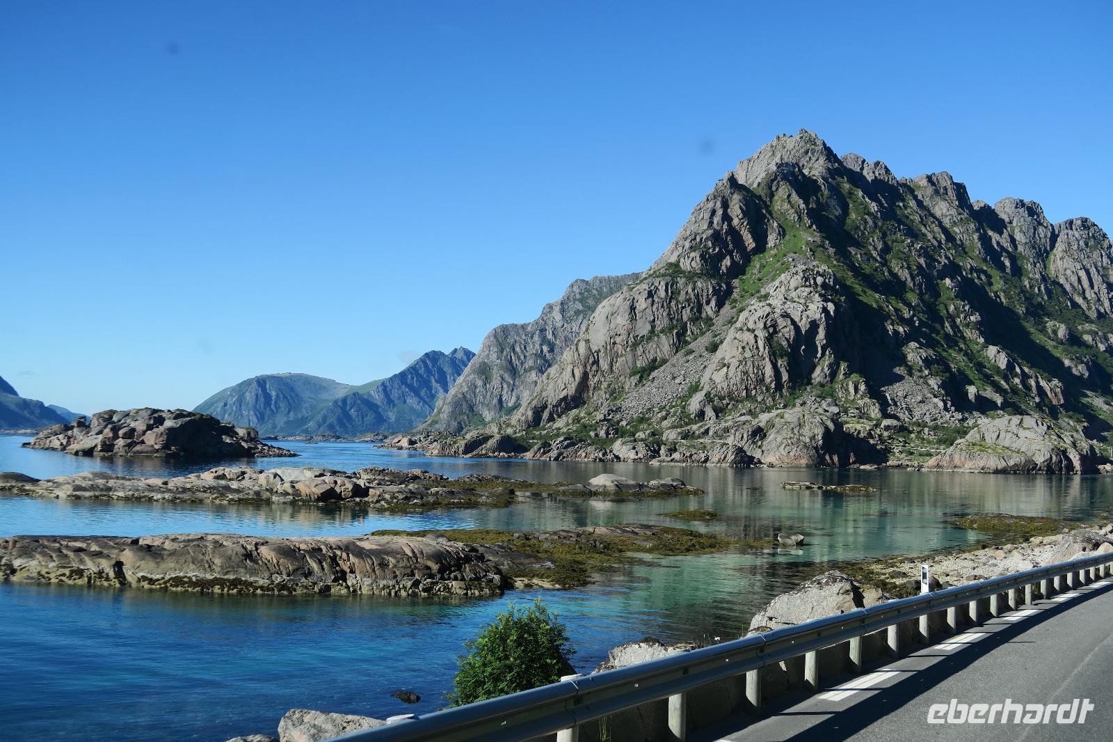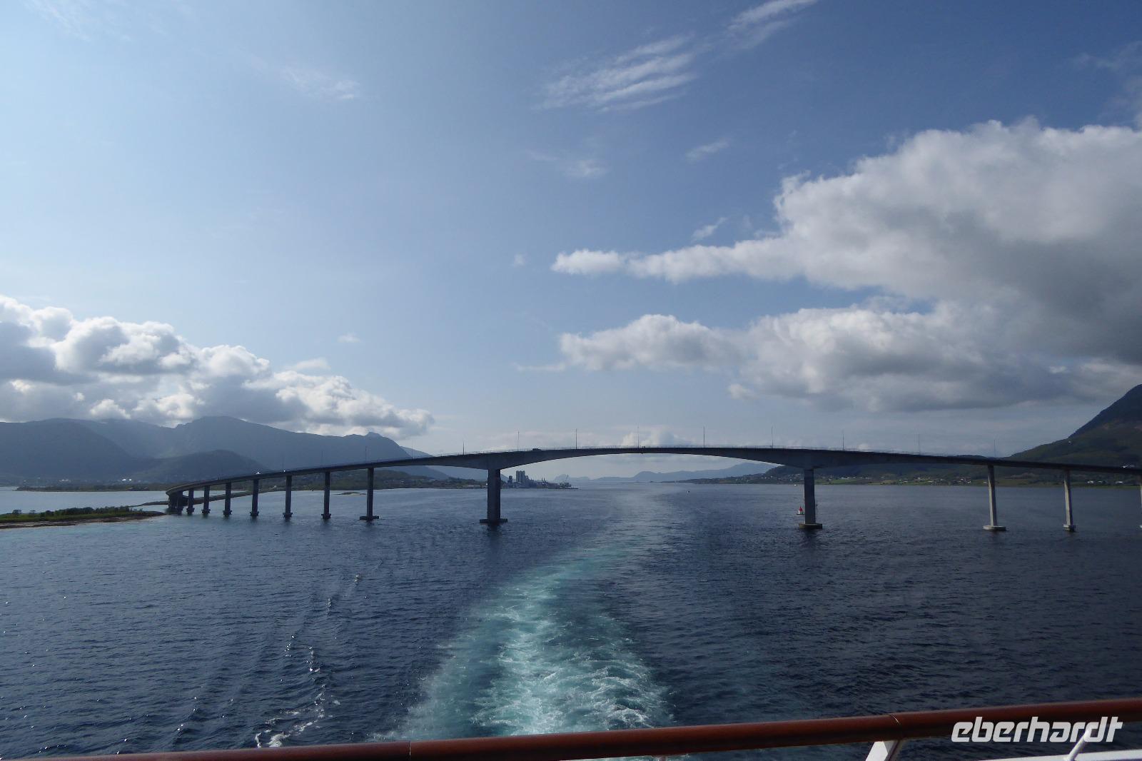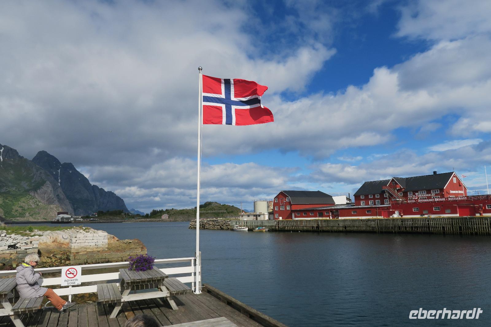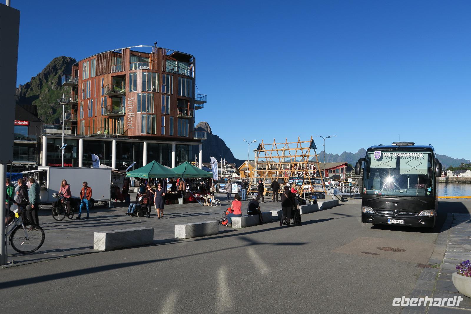 Auf einem Parkplatz bei Narvik haben wir eine Pause eingelegt. Der Olaffjord lag uns zu Füßen. Hier gab es die große Seeschlacht bei der alle 8 deutschen Schiffe versenkt wurden sowie zwei englische Kriegsschiffe. An der Tjeldsundbrücke (Verbindung zu den Vesteralen)eine kurze Fotopause. Dann ging es Richtung Strokmarknes zum Schiff der Hurtigroute „Richard With". Die Schiffe fahren seit 1893 als Postschiffe. Es gibt derzeit 12 Schiffe im Einsatz. Pünktlich haben wir abgelegt und es ging Richtung Svolvaer dem nächsten Hafen und Hauptstadt der Lofoten. Das Wetter war frisch. Einige Gäste haben Seeadler gesehen genauso wie springende Lachse. Die Sonne kam durch und so wurde es auch eine schöne Fahrt. Wir besichtigten auch den Trollfjord, der als Höhepunkt der Schiffstour verkauft wird. Ein enger Fjord, der aber auch eine Sackgasse ist. Im Hafen angekommen stand schon Peter mit unserem Bus.