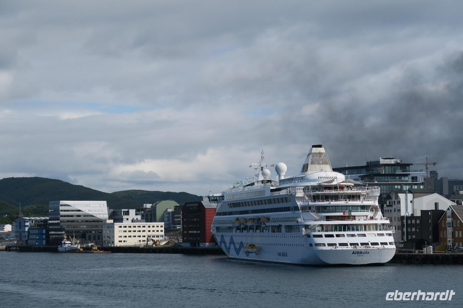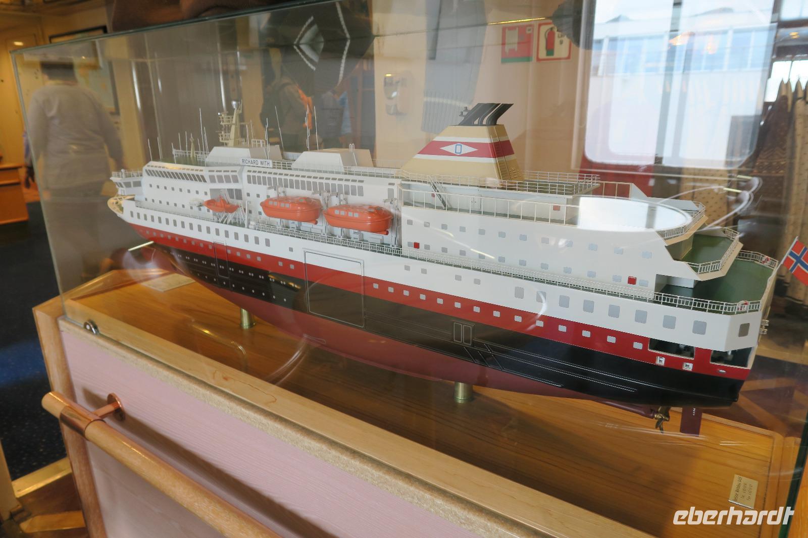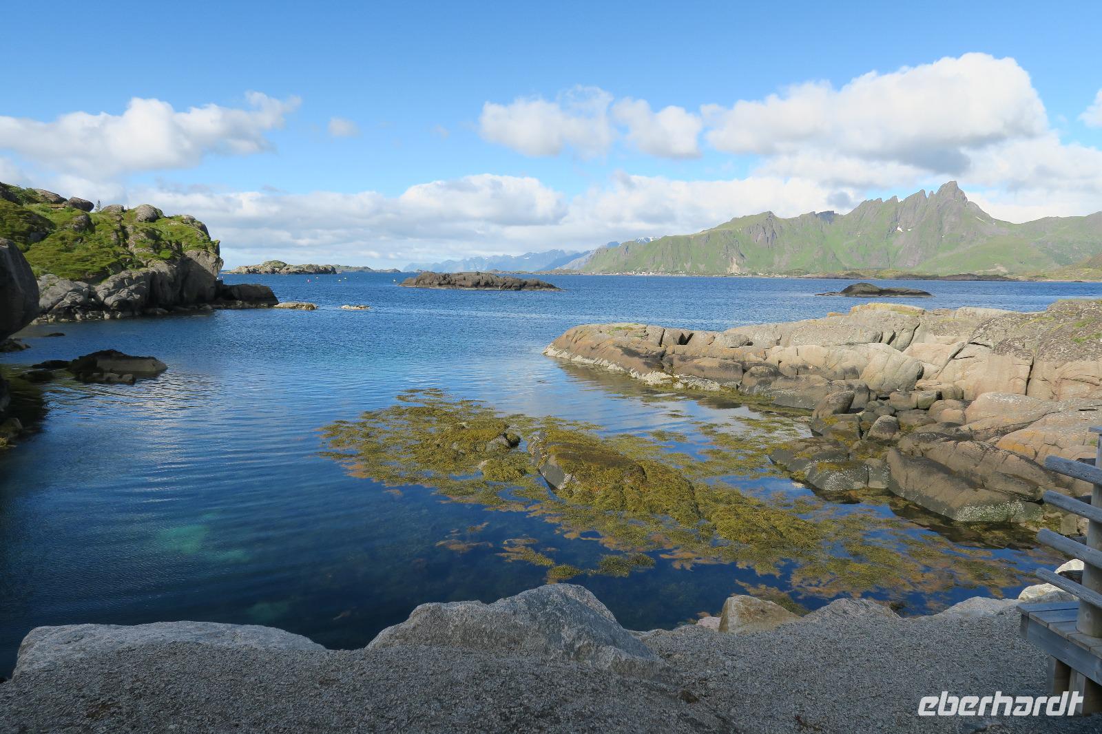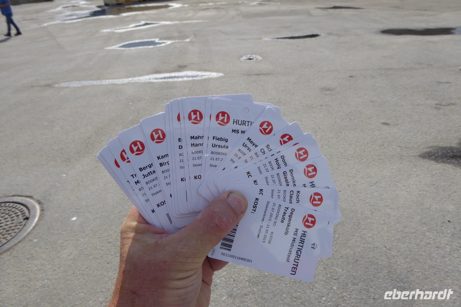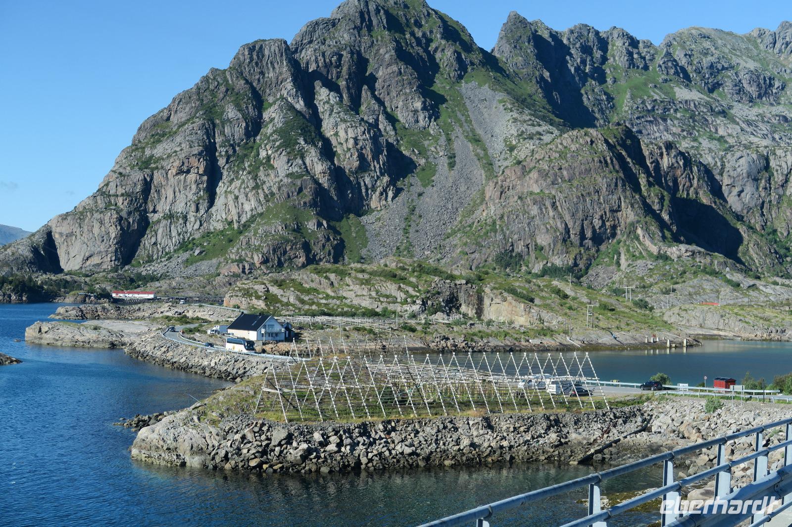 Auf einem Parkplatz bei Narvik haben wir eine Pause eingelegt. Der Olaffjord lag uns zu Füßen. Hier gab es die große Seeschlacht bei der alle 8 deutschen Schiffe versenkt wurden sowie zwei englische Kriegsschiffe. An der Tjeldsundbrücke (Verbindung zu den Vesteralen)eine kurze Fotopause. Dann ging es Richtung Strokmarknes zum Schiff der Hurtigroute „Richard With". Die Schiffe fahren seit 1893 als Postschiffe. Es gibt derzeit 12 Schiffe im Einsatz. Pünktlich haben wir abgelegt und es ging Richtung Svolvaer dem nächsten Hafen und Hauptstadt der Lofoten. Das Wetter war frisch. Einige Gäste haben Seeadler gesehen genauso wie springende Lachse. Die Sonne kam durch und so wurde es auch eine schöne Fahrt. Wir besichtigten auch den Trollfjord, der als Höhepunkt der Schiffstour verkauft wird. Ein enger Fjord, der aber auch eine Sackgasse ist. Im Hafen angekommen stand schon Peter mit unserem Bus.