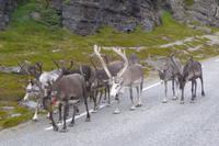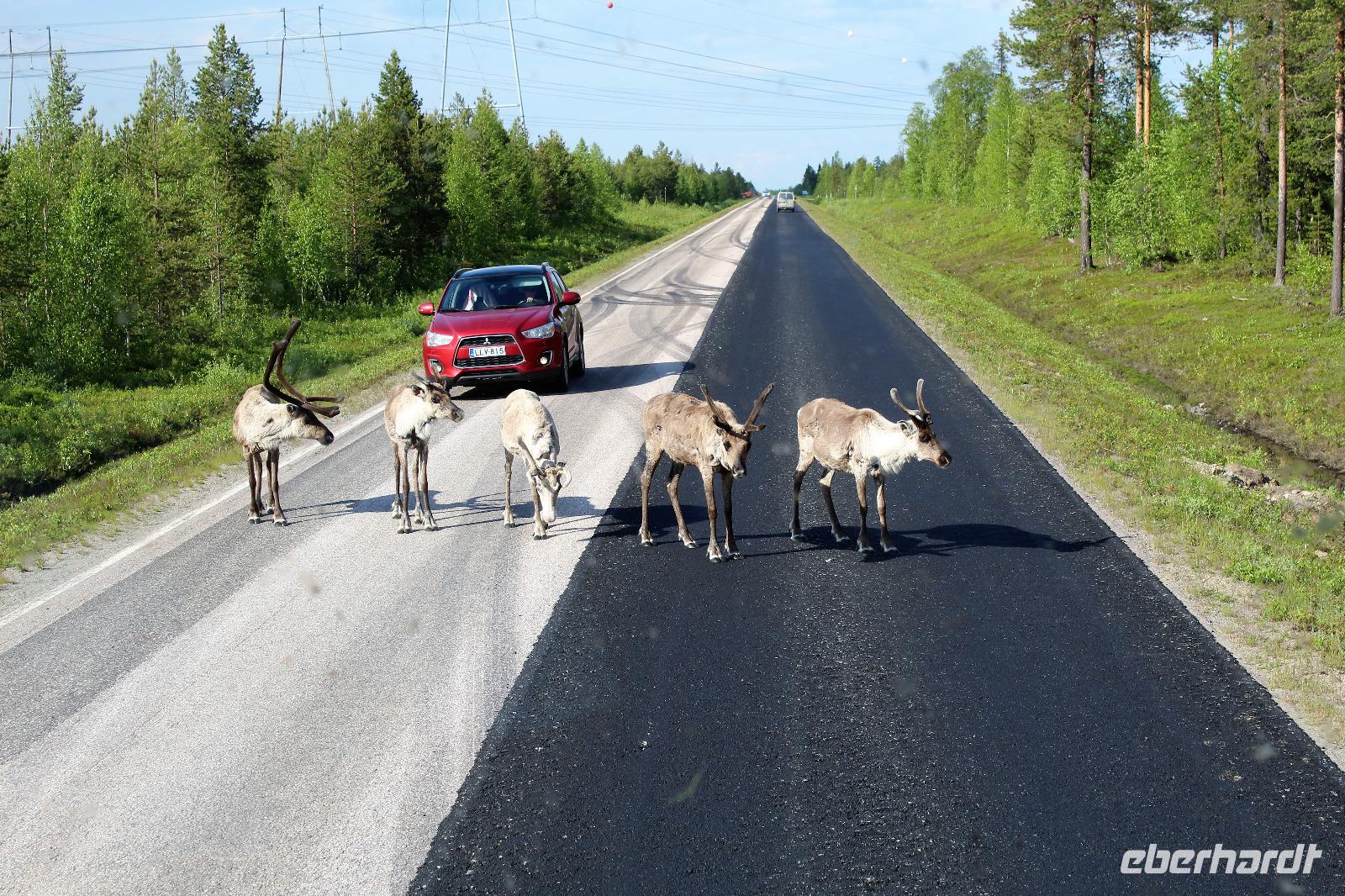Auf unserem weitern Weg standen plötzlich 6 Rentiere auf der Straße. Das war natürlich eine schöne Überraschung. Fotos gemacht und dann weiter, nachdem sich die Rentiere endlich zur Seite bewegt hatten. Die Stimmung im Bus wurde immer besser.