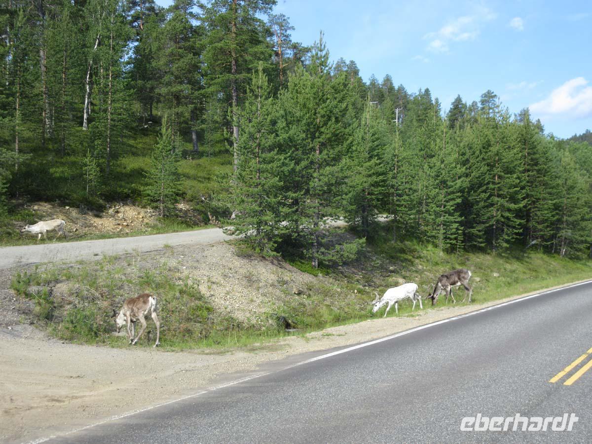 He3ute reisen wir nach Finnalnd. Kurz vor der finnischen Grenze ist die Kirche von Kalix sehenswert. Weil Samstag ist, ist sie geöffnet. Wir finden uns in einer gotischen Hallenkirche mit schönem Netzgewölbe wieder. Wir überschreiten wir im Bus kurze Zeit später in Tornio die Grenze zu Finnland und stellen unsere Uhren um eine Stunde vor. Tagesziel ist heute das Polarkreiszentrum in Rovaniemi. Hier sitzt auch der Weihnachtsmann und man kann Postkarten schreiben, die dann pünktlich zum Fest ankommen. Wir stoßen am Polarkreis mit einem Gläschen Sekt an. 20 Grad wie heute am Polarkreis sind nicht unnormal, denn es herrscht kontinentales Klima mit heißen, trockenen Sommern und klirrend kalten, sehr schneereichen Wintern. Nach und nach haben wir immer mehr Rentiersichtungen. So ist Vorsicht geboten, denn die äsenden Tiere achten nicht auf den Straßenverkehr. Am Abend kommen wir bei strahlendem Sonnenschein in Saariselkä an und genießen in unserem Hotel das Abendbüffet, während die Rentiere draußen auf der Straße herum laufen. Heute ist unsere erste Nacht, in der die Sonne nicht untergehen wird.
