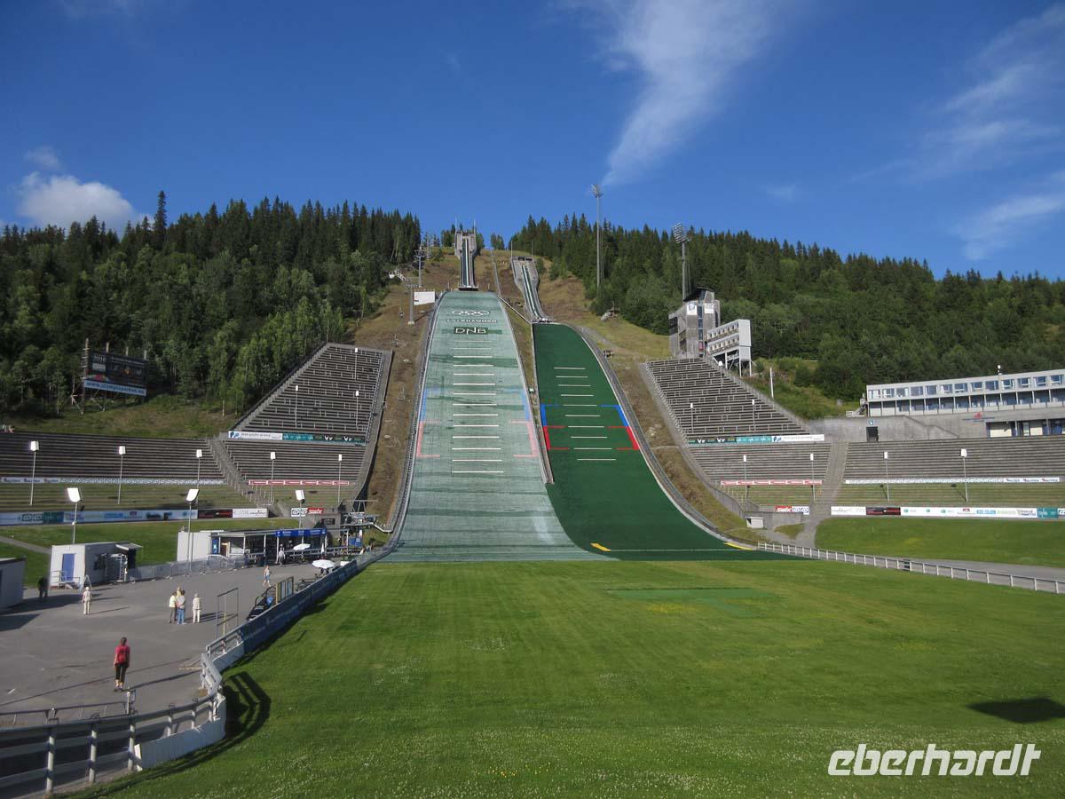 Unser erster Aufenthalt ist in der Stadt Trondheim. Natürlich kann der Nidarosdom besichtigt werden, in dem der heilige Olav 1030 nach seinem Tod in der Schlacht von Stiklestad beerdigt worden ist. Viel Zeit haben wir jedoch nicht, und so reicht es gerade noch für einen Gang an den alten Hafen mit den schön restaurierten Speicherhäusern, sowie auf den Markt, wo die Stadt dem Gründervater König Olav Tryggvasson ein Denkmal gesetzt hat. Durchs Drivatal reisen wir zum Dovrefjell. Noch einmal wird die Landschaft karg und unbewohnt. Weite Flächen sind von der Rentierflechte überwachsen. Leider ist der Berg Snöhättan heute von Wolken umtost. Er ist ein schneebedeckter 2000er und nach den Gipfeln von Jötunheimen der höchste Norwegens. Im milden und recht lieblichen Gudbrandstal angekommen reisen wir weiter dem Süden entgegen. Überfällig ist auch ein Besuch einer Stabkirche. Diese steht in Ringeby und hat mal wieder geschlossen. Aber in frisch saniertem Zustand macht sie auch von außen einen wunderschönen Eindruck.Von den ehemals weit über 1000 sind nur noch 28 gut erhalten. Sie gehören in die Zeit der Christianisierung des Landes im 12. und 13. Jh. Nach dem Besuch der Olympiaschanzen in Lillehammer erreichen wir Hamar, am Mjösasee gelegen, statten der dortigen Olympiahalle noch einen Besuch ab und beziehen unser Hotel.