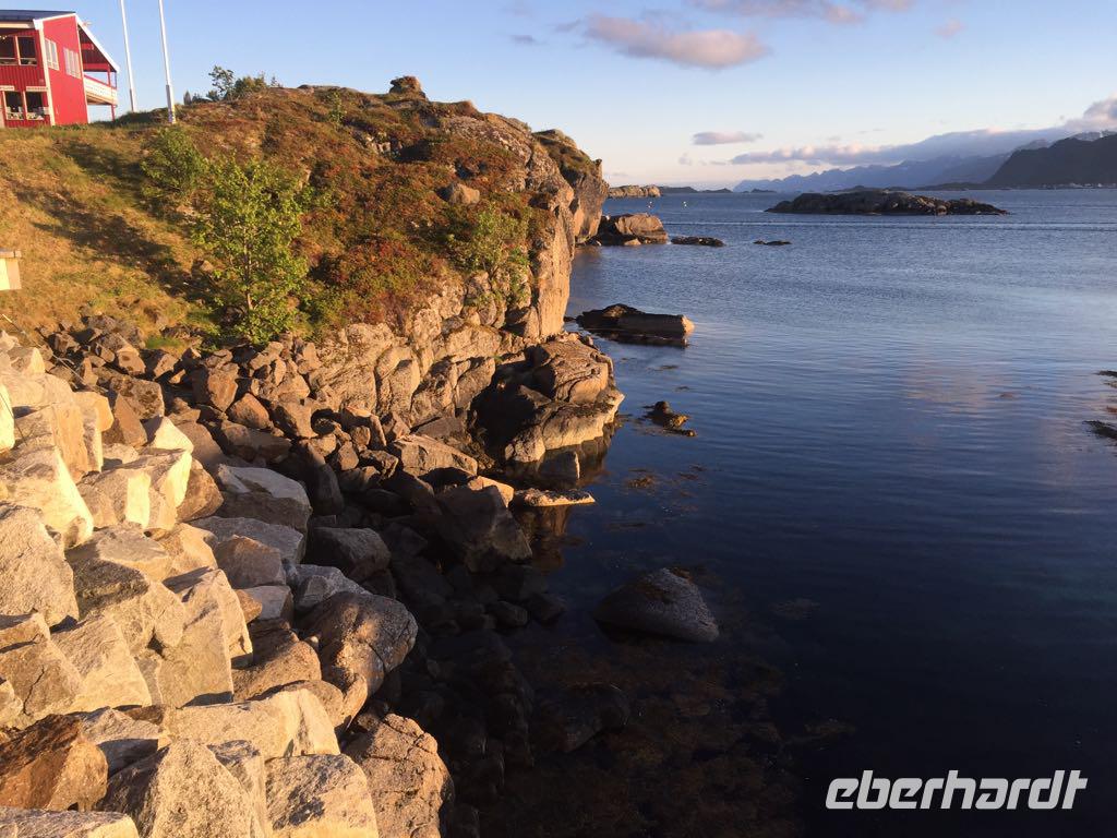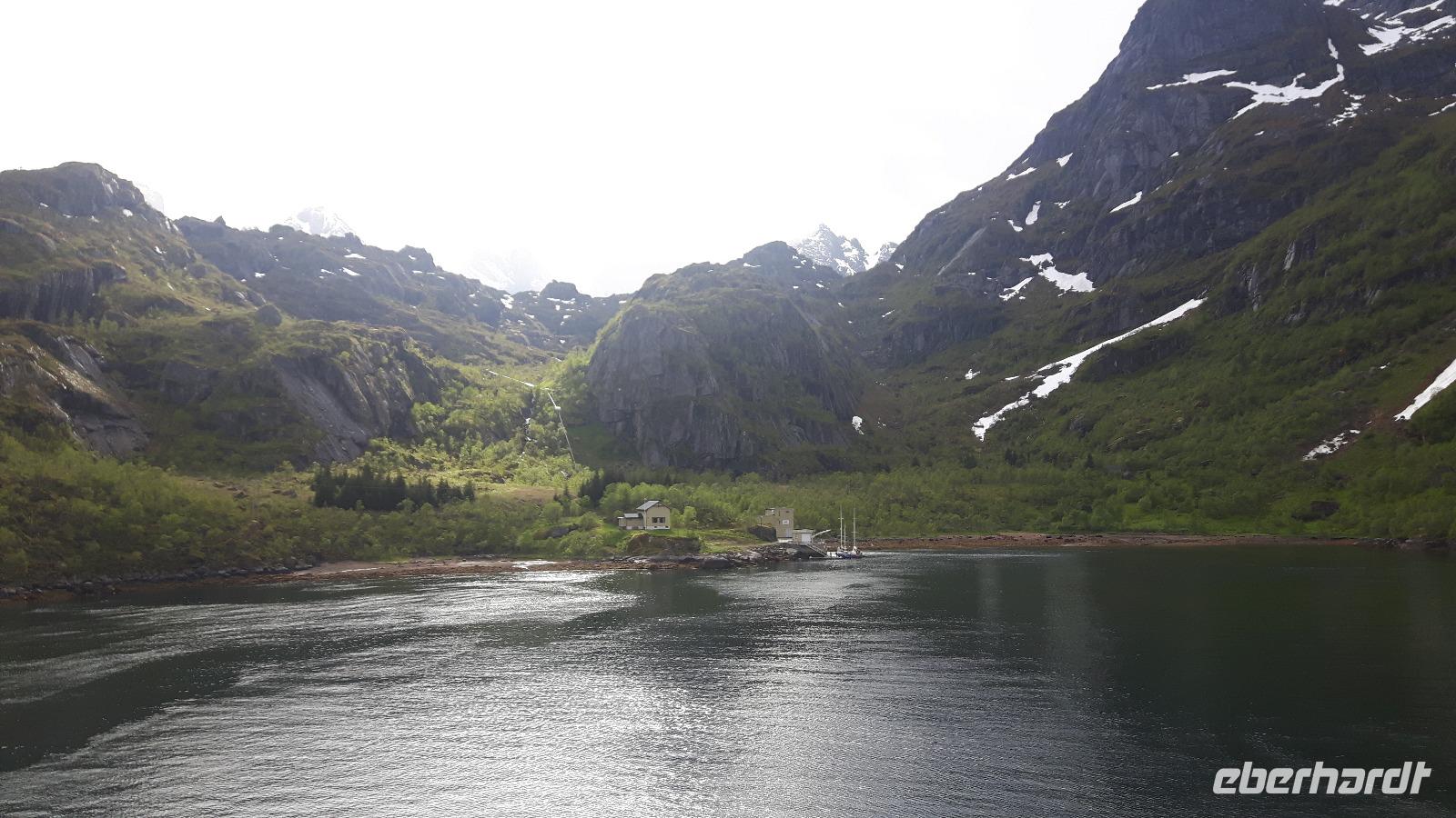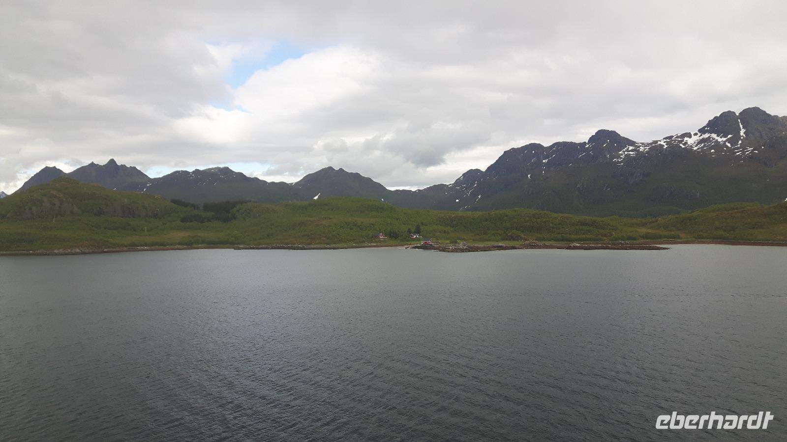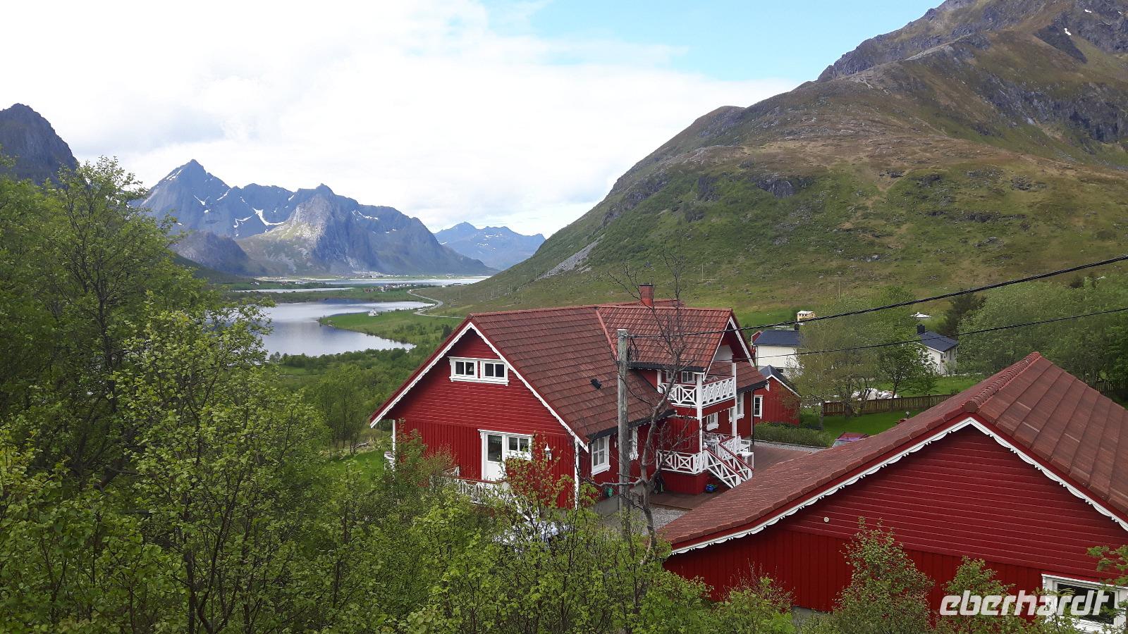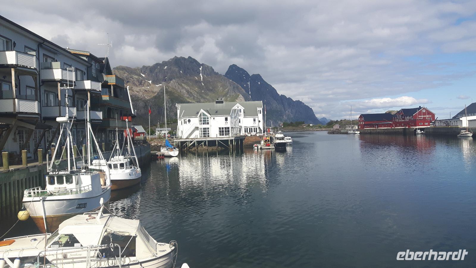 Traumhaft auch der heutige Morgen und in bester Stimmung reisten wir somit weiter. Wir fuhren am Balsfjord vorbei, dann weiter durch die Berge und über die Fjelle von Troms... und gegenüber von Narvik am Ofotfjord entlang. Nach der Überquerung der Tjeldsundbrücke kamen wir auf den Vesterålen, einer überaus facettenreichen Inselgruppe, an. Die Landschaftsvielfalt reicht hier von ruhigen, friedlichen Stränden, Wiesen und Weiden bis zu zerklüfteten alpinen Höhenzügen, dramatischen Fjorden und uriger Wildnis. Unser Bus brachte uns zum Hurtigruten-Kai in Stokmarknes, dem Ausgangspunkt unserer Mini-Kreuzfahrt auf einem der Postschiffe! In diesem idyllischen Dorf gründete Richard With übrigens vor mehr als 120 Jahren die erste Hurtigruten-Reederei! Unser Schiff, die MS „Trollfjord", fährt seit 2002 im Dienst der Hurtigruten-Flotte. Wenn man Norwegen hautnah erleben möchte, sollte man unbedingt zumindest eine Etappe der Hurtigruten-Reise im Programm haben. Dabei handelt es sich schließlich um die traditionelle norwegische Postschifflinie, die seit Ende des 19. Jahrhunderts die Ortschaften der westlichen Küste Norwegens miteinander verbindet und somit bietet diese Strecke eine einmalige Gelegenheit, die gesamte Westküste Norwegens mit all ihren Naturschönheiten kennenzulernen. Fjorde, raue und liebliche Landschaften und die Gastfreundschaft der Menschen machen Hurtigruten heute zu einer echten Touristenattraktion und was einst aus der Not heraus geboren wurde, nämlich auch abgelegene nördliche Landesteile mit dem klimatisch begünstigten Süden zu verbinden, ist inzwischen eine Sehenswürdigkeit. Natürlich erlebten wir auf unserer knapp 4-stündigen Fahrt nur eine kleine Etappe dieser eigentlich 12-tägigen Reise, aber immerhin hat man dadurch einen Eindruck von der sogenannten „Schönsten Seereise der Welt". Der Höhepunkt dieser Hurtigruten-Etappe war die schöne Fahrt durch den Raftsund, hinein in den engen Trollfjord - inzwischen begleitet von etwas Sonnenschein! Unser Buschauffeur Andreas erwartete uns am frühen Abend in Svolvær, dem Hauptort der Lofoten. Die Lofoten waren dann übrigens ein weiteres echtes Highlight dieser Reise! Das zeigte sich sofort, als wir in Svolvær wieder in unseren Reisebus stiegen und über den östlichen Teil der Inselgruppe fuhren. Unterwegs durfte natürlich ein kurzer Besuch der als „Lofot-Kathedrale" bekannten Kirche Vågan, einer aus Holz gebaute Kreuzkirche im neugotischen Stil, nicht fehlen. Voller Erwartungen erreichten wir am Abend das Statles-Rorbusenter in Mortsund. Entlang der Küste Nordlands gibt es diese alten wiederhergerichteten ehemaligen Unterkünfte der Fischer zu mieten und eine Übernachtung hier ist etwas ganz Besonderes. Die Hütten dienten den Fischern ursprünglich als Behausung während längerer Fangperioden. Heute werden die gut ausgestatteten und restaurierten Hütten nur noch für Urlaub und Freizeit genutzt. Bei der Restaurierung legt man Wert auf die Erhaltung des ursprünglichen Gebäudes und kombiniert gleichzeitig Tradition mit den Annehmlichkeiten der heutigen Zeit. Das „Statles Rorbu- og Konferansesenter AS" liegt im idyllischen Mortsund, einem kleinen Fischerdorf, und genau hier, mitten im Herzen der Lofoten, verbrachten wir zwei Nächte.