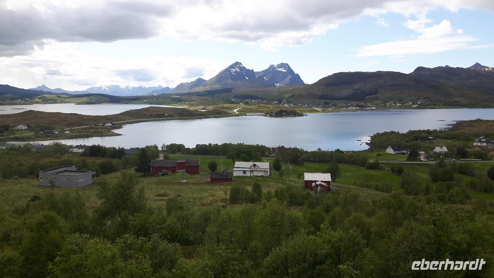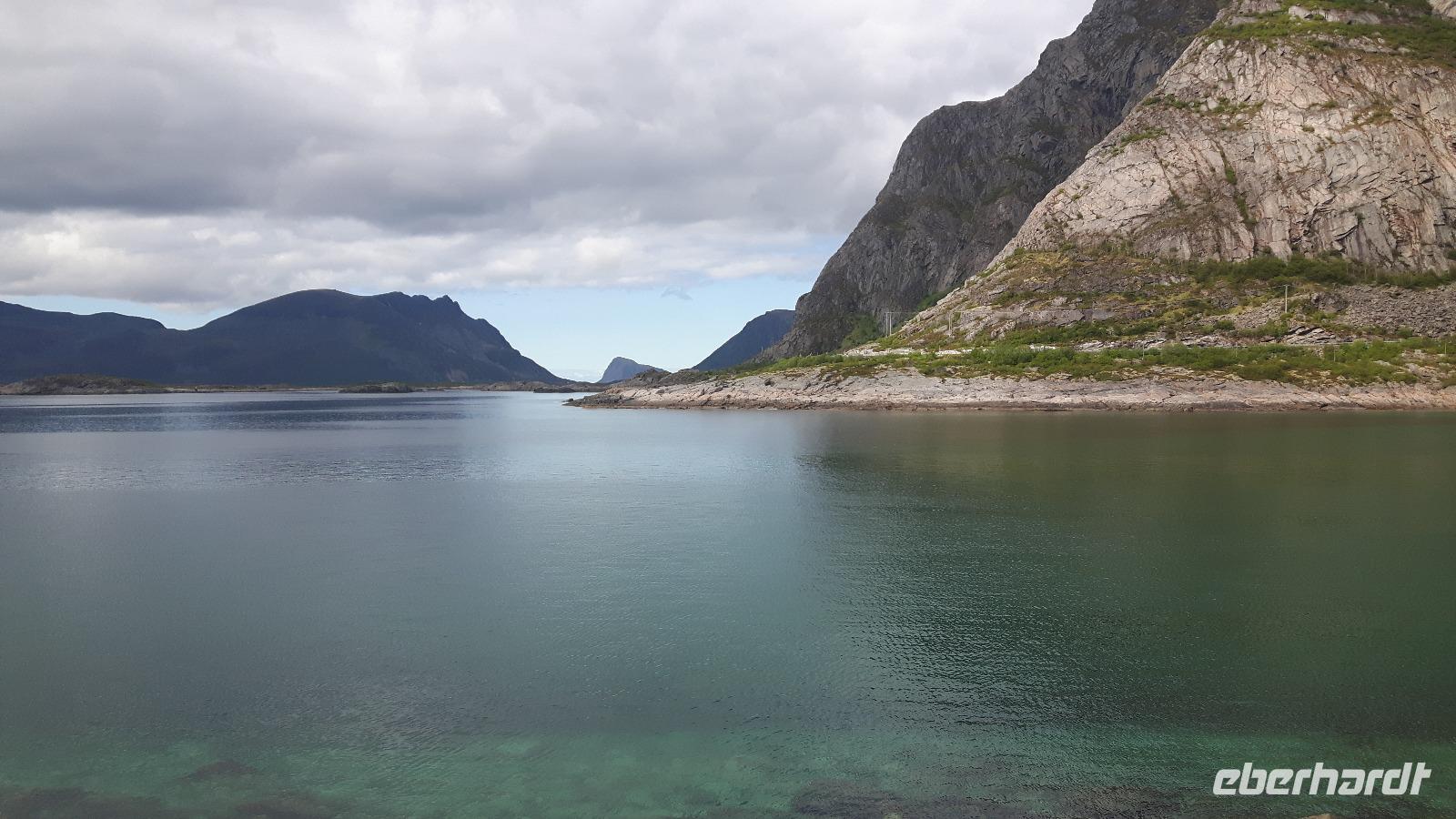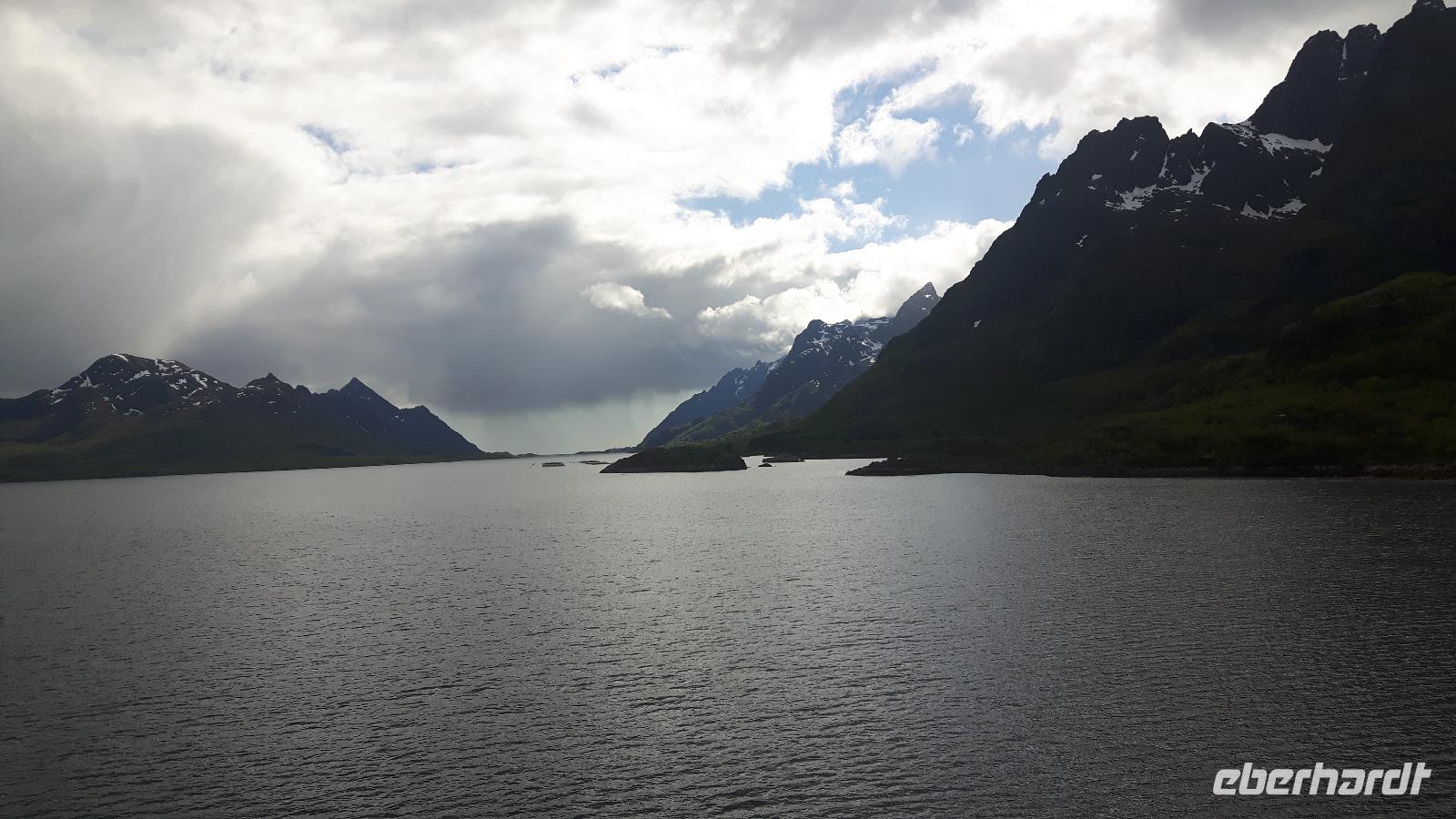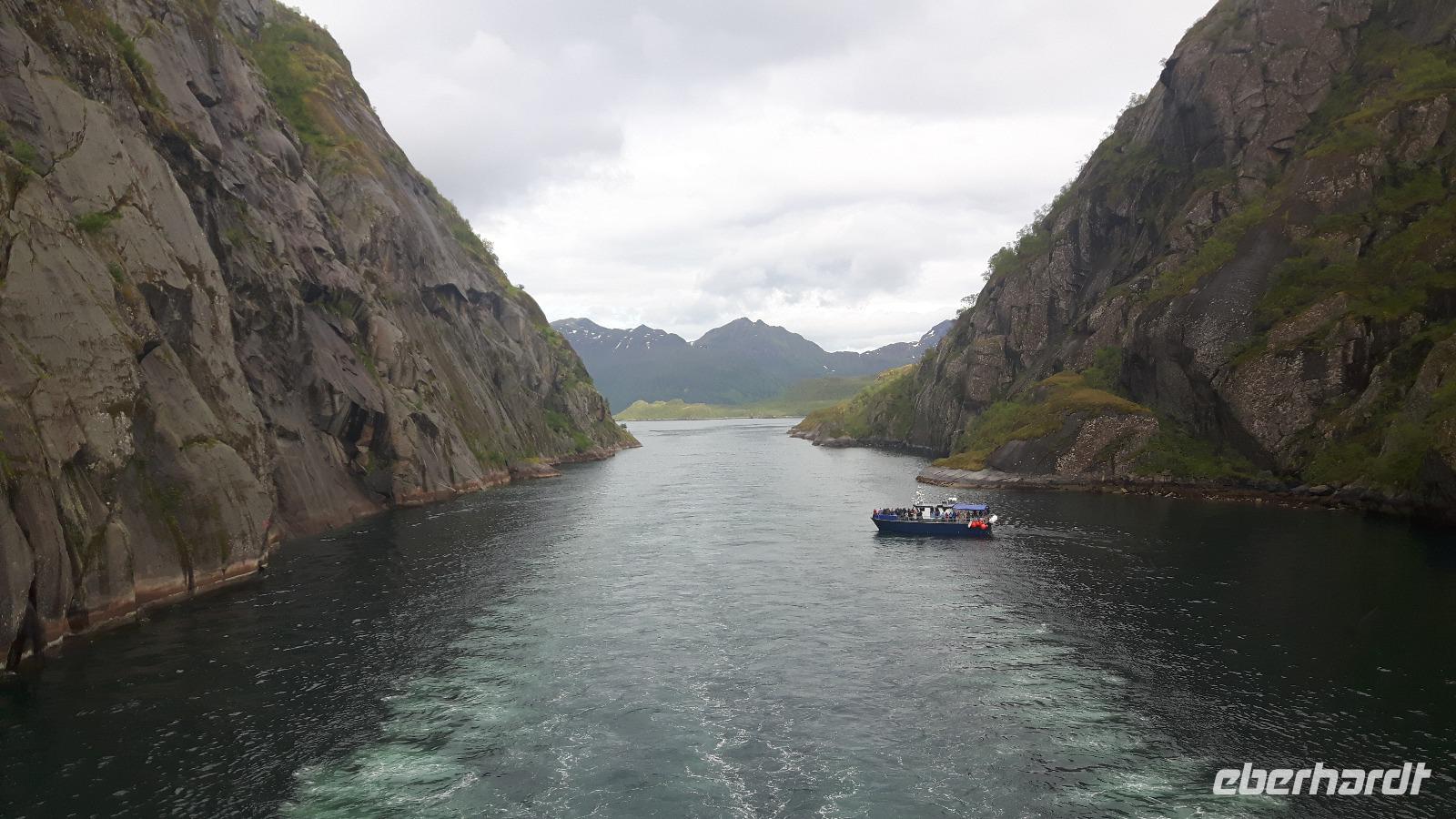 Traumhaft auch der heutige Morgen und in bester Stimmung reisten wir somit weiter. Wir fuhren am Balsfjord vorbei, dann weiter durch die Berge und über die Fjelle von Troms... und gegenüber von Narvik am Ofotfjord entlang. Nach der Überquerung der Tjeldsundbrücke kamen wir auf den Vesterålen, einer überaus facettenreichen Inselgruppe, an. Die Landschaftsvielfalt reicht hier von ruhigen, friedlichen Stränden, Wiesen und Weiden bis zu zerklüfteten alpinen Höhenzügen, dramatischen Fjorden und uriger Wildnis. Unser Bus brachte uns zum Hurtigruten-Kai in Stokmarknes, dem Ausgangspunkt unserer Mini-Kreuzfahrt auf einem der Postschiffe! In diesem idyllischen Dorf gründete Richard With übrigens vor mehr als 120 Jahren die erste Hurtigruten-Reederei! Unser Schiff, die MS „Trollfjord", fährt seit 2002 im Dienst der Hurtigruten-Flotte. Wenn man Norwegen hautnah erleben möchte, sollte man unbedingt zumindest eine Etappe der Hurtigruten-Reise im Programm haben. Dabei handelt es sich schließlich um die traditionelle norwegische Postschifflinie, die seit Ende des 19. Jahrhunderts die Ortschaften der westlichen Küste Norwegens miteinander verbindet und somit bietet diese Strecke eine einmalige Gelegenheit, die gesamte Westküste Norwegens mit all ihren Naturschönheiten kennenzulernen. Fjorde, raue und liebliche Landschaften und die Gastfreundschaft der Menschen machen Hurtigruten heute zu einer echten Touristenattraktion und was einst aus der Not heraus geboren wurde, nämlich auch abgelegene nördliche Landesteile mit dem klimatisch begünstigten Süden zu verbinden, ist inzwischen eine Sehenswürdigkeit. Natürlich erlebten wir auf unserer knapp 4-stündigen Fahrt nur eine kleine Etappe dieser eigentlich 12-tägigen Reise, aber immerhin hat man dadurch einen Eindruck von der sogenannten „Schönsten Seereise der Welt". Der Höhepunkt dieser Hurtigruten-Etappe war die schöne Fahrt durch den Raftsund, hinein in den engen Trollfjord - inzwischen begleitet von etwas Sonnenschein! Unser Buschauffeur Andreas erwartete uns am frühen Abend in Svolvær, dem Hauptort der Lofoten. Die Lofoten waren dann übrigens ein weiteres echtes Highlight dieser Reise! Das zeigte sich sofort, als wir in Svolvær wieder in unseren Reisebus stiegen und über den östlichen Teil der Inselgruppe fuhren. Unterwegs durfte natürlich ein kurzer Besuch der als „Lofot-Kathedrale" bekannten Kirche Vågan, einer aus Holz gebaute Kreuzkirche im neugotischen Stil, nicht fehlen. Voller Erwartungen erreichten wir am Abend das Statles-Rorbusenter in Mortsund. Entlang der Küste Nordlands gibt es diese alten wiederhergerichteten ehemaligen Unterkünfte der Fischer zu mieten und eine Übernachtung hier ist etwas ganz Besonderes. Die Hütten dienten den Fischern ursprünglich als Behausung während längerer Fangperioden. Heute werden die gut ausgestatteten und restaurierten Hütten nur noch für Urlaub und Freizeit genutzt. Bei der Restaurierung legt man Wert auf die Erhaltung des ursprünglichen Gebäudes und kombiniert gleichzeitig Tradition mit den Annehmlichkeiten der heutigen Zeit. Das „Statles Rorbu- og Konferansesenter AS" liegt im idyllischen Mortsund, einem kleinen Fischerdorf, und genau hier, mitten im Herzen der Lofoten, verbrachten wir zwei Nächte.
