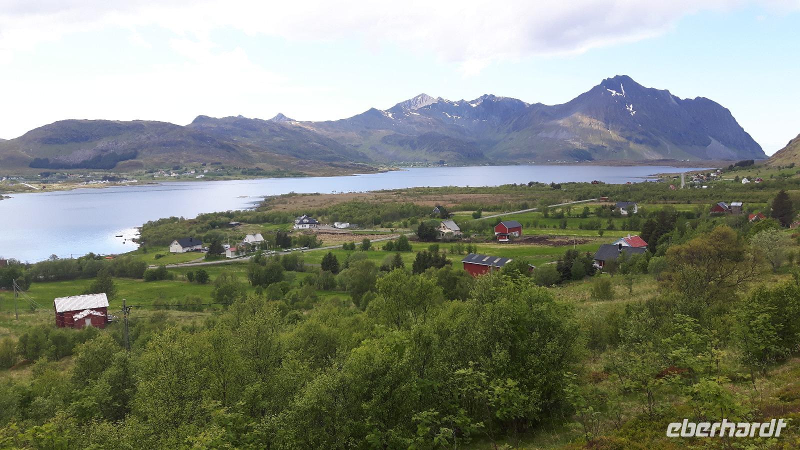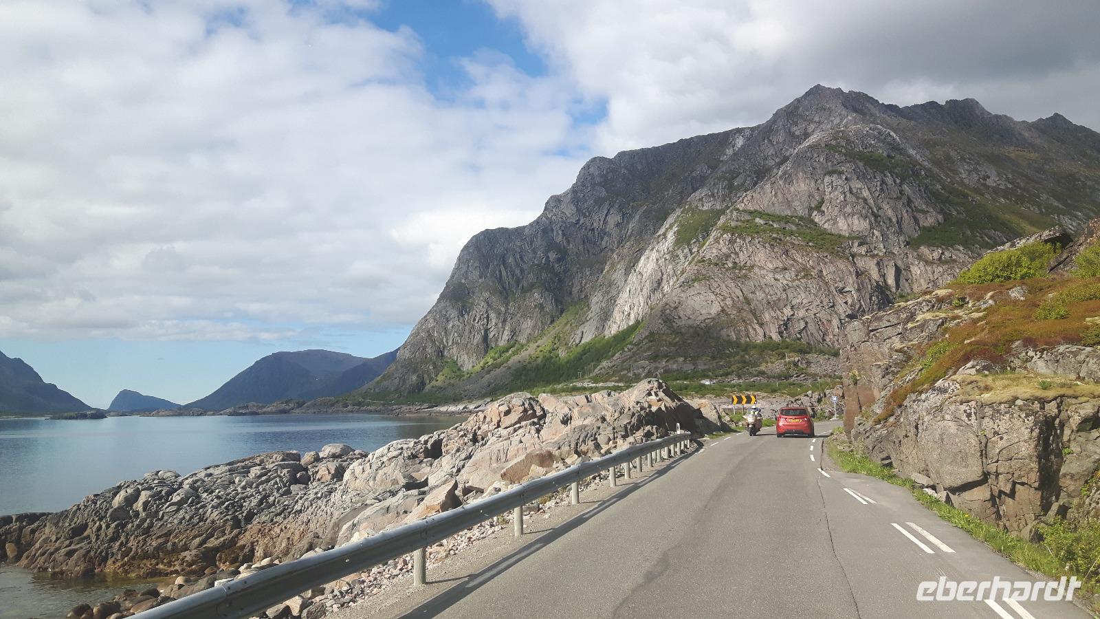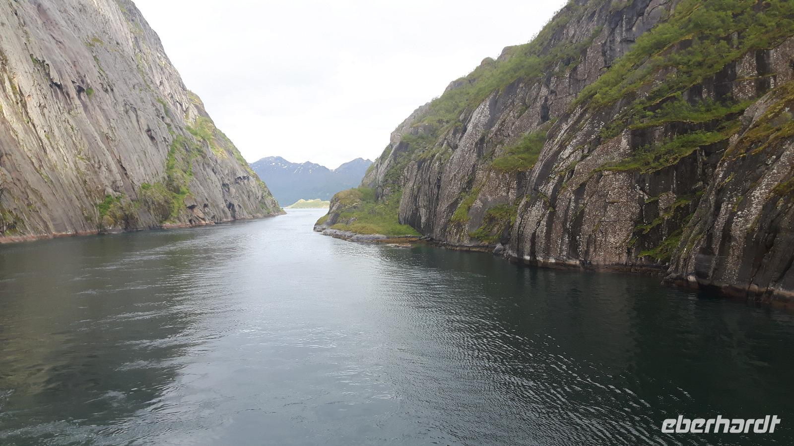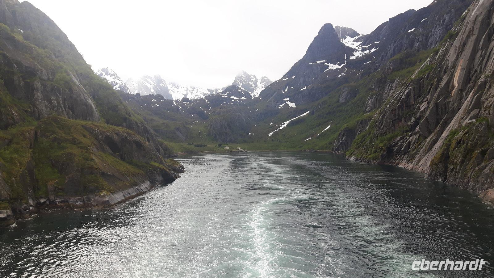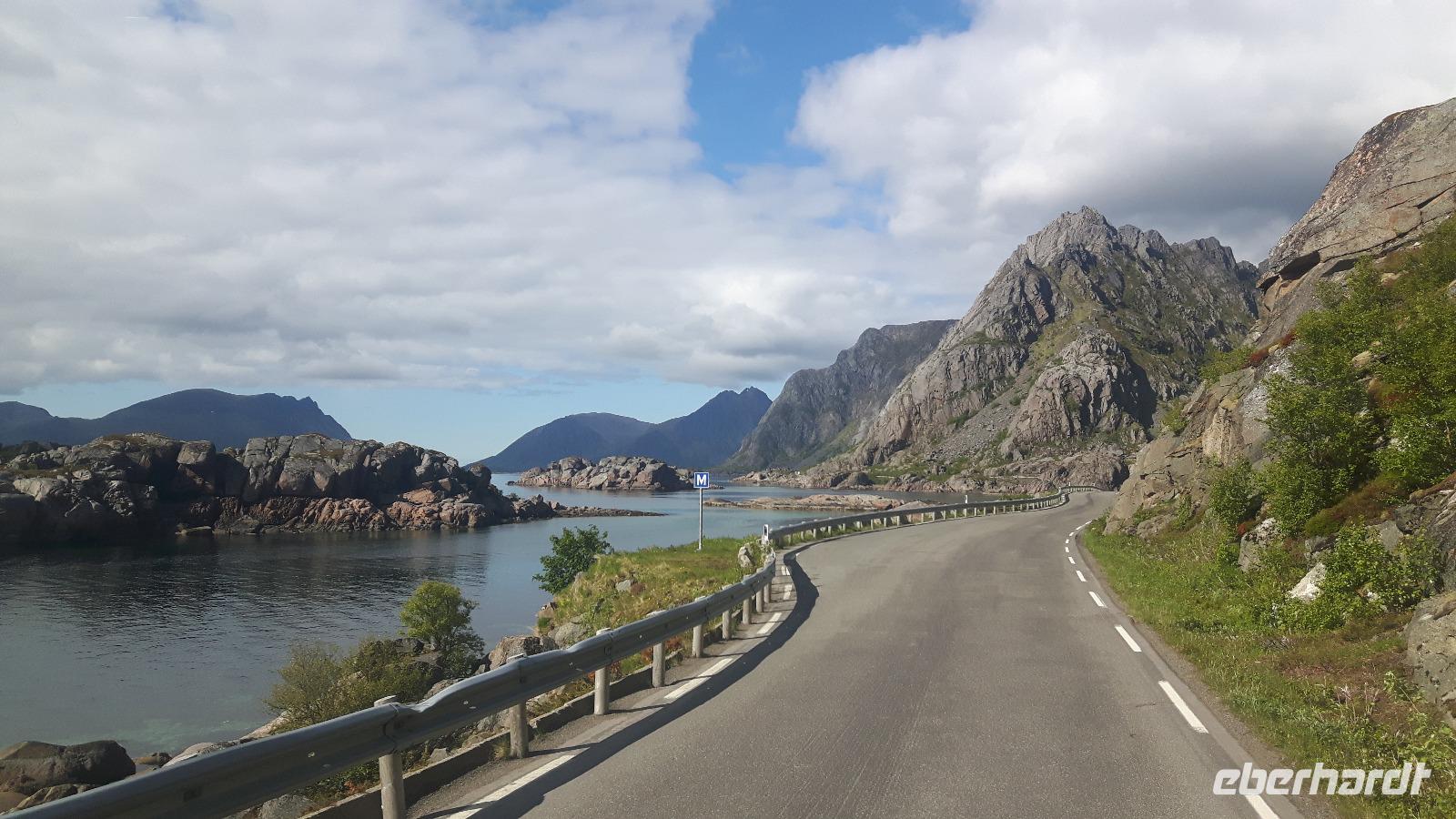 Traumhaft auch der heutige Morgen und in bester Stimmung reisten wir somit weiter. Wir fuhren am Balsfjord vorbei, dann weiter durch die Berge und über die Fjelle von Troms... und gegenüber von Narvik am Ofotfjord entlang. Nach der Überquerung der Tjeldsundbrücke kamen wir auf den Vesterålen, einer überaus facettenreichen Inselgruppe, an. Die Landschaftsvielfalt reicht hier von ruhigen, friedlichen Stränden, Wiesen und Weiden bis zu zerklüfteten alpinen Höhenzügen, dramatischen Fjorden und uriger Wildnis. Unser Bus brachte uns zum Hurtigruten-Kai in Stokmarknes, dem Ausgangspunkt unserer Mini-Kreuzfahrt auf einem der Postschiffe! In diesem idyllischen Dorf gründete Richard With übrigens vor mehr als 120 Jahren die erste Hurtigruten-Reederei! Unser Schiff, die MS „Trollfjord", fährt seit 2002 im Dienst der Hurtigruten-Flotte. Wenn man Norwegen hautnah erleben möchte, sollte man unbedingt zumindest eine Etappe der Hurtigruten-Reise im Programm haben. Dabei handelt es sich schließlich um die traditionelle norwegische Postschifflinie, die seit Ende des 19. Jahrhunderts die Ortschaften der westlichen Küste Norwegens miteinander verbindet und somit bietet diese Strecke eine einmalige Gelegenheit, die gesamte Westküste Norwegens mit all ihren Naturschönheiten kennenzulernen. Fjorde, raue und liebliche Landschaften und die Gastfreundschaft der Menschen machen Hurtigruten heute zu einer echten Touristenattraktion und was einst aus der Not heraus geboren wurde, nämlich auch abgelegene nördliche Landesteile mit dem klimatisch begünstigten Süden zu verbinden, ist inzwischen eine Sehenswürdigkeit. Natürlich erlebten wir auf unserer knapp 4-stündigen Fahrt nur eine kleine Etappe dieser eigentlich 12-tägigen Reise, aber immerhin hat man dadurch einen Eindruck von der sogenannten „Schönsten Seereise der Welt". Der Höhepunkt dieser Hurtigruten-Etappe war die schöne Fahrt durch den Raftsund, hinein in den engen Trollfjord - inzwischen begleitet von etwas Sonnenschein! Unser Buschauffeur Andreas erwartete uns am frühen Abend in Svolvær, dem Hauptort der Lofoten. Die Lofoten waren dann übrigens ein weiteres echtes Highlight dieser Reise! Das zeigte sich sofort, als wir in Svolvær wieder in unseren Reisebus stiegen und über den östlichen Teil der Inselgruppe fuhren. Unterwegs durfte natürlich ein kurzer Besuch der als „Lofot-Kathedrale" bekannten Kirche Vågan, einer aus Holz gebaute Kreuzkirche im neugotischen Stil, nicht fehlen. Voller Erwartungen erreichten wir am Abend das Statles-Rorbusenter in Mortsund. Entlang der Küste Nordlands gibt es diese alten wiederhergerichteten ehemaligen Unterkünfte der Fischer zu mieten und eine Übernachtung hier ist etwas ganz Besonderes. Die Hütten dienten den Fischern ursprünglich als Behausung während längerer Fangperioden. Heute werden die gut ausgestatteten und restaurierten Hütten nur noch für Urlaub und Freizeit genutzt. Bei der Restaurierung legt man Wert auf die Erhaltung des ursprünglichen Gebäudes und kombiniert gleichzeitig Tradition mit den Annehmlichkeiten der heutigen Zeit. Das „Statles Rorbu- og Konferansesenter AS" liegt im idyllischen Mortsund, einem kleinen Fischerdorf, und genau hier, mitten im Herzen der Lofoten, verbrachten wir zwei Nächte.