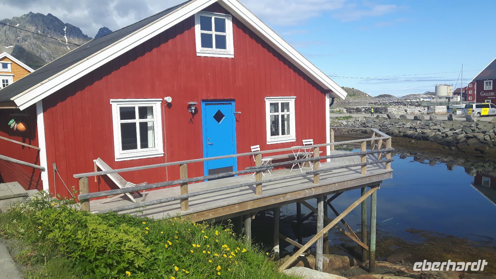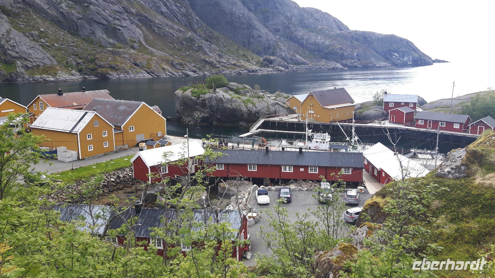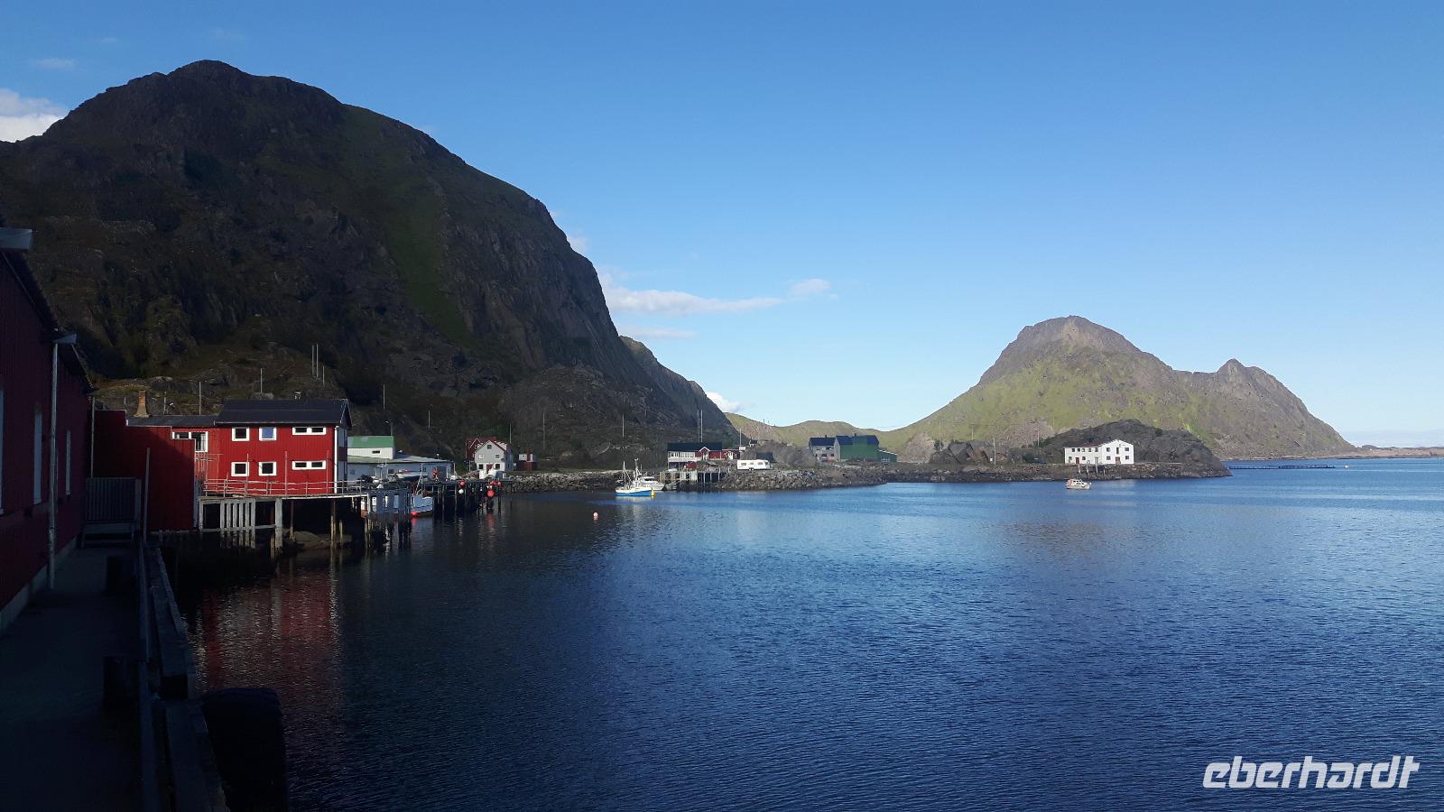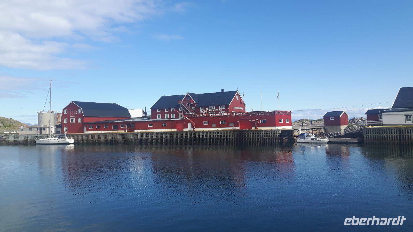 Wir ließen den neuen Tag mal etwas geruhsamer angehen. An diesem Morgen wachten wir auf, gingen nach draußen und standen in einem Natur-Idyll - türkisblaues Meer und kleine Fische, die sich um die Pfähle der Hütten tummelten... Ein gemütliches Frühstück und ganz entspannt begannen wir die Lofoten-Rundfahrt. Einen ersten Aufenthalt legten wir im kleinen Fischerdorf Nusfjord auf der Insel Flakstadøy, einer der Hauptinseln des Lofoten-Archipels, ein. Anschließend besuchten wir das Wikingermuseum in Borg, ein „Museum zum Anfassen". In Borg haben Archäologen 1983 ein Langhaus aus Wikingerzeiten entdeckt. Um den größten Fund aus dieser Zeit entstand ein Museum, in dem jedermann 1.000 Jahre zurück in die Vergangenheit reisen kann. Während einer interessanten und kurzweiligen Führung erfuhren wir beispielsweise wie sich die Vorfahren der heutigen Norweger ernährt haben und wie es auf ihren Festen zuging. Außerdem wurden wir mit leckerer Wikingersuppe (Lamm) verwöhnt! Gut gestärkt ging es am Nachmittag weiter. Unser nächstes Ziel hieß Henningsvær und schon die Fahrt dahin war unglaublich beeindruckend. Es ging durch einzigartige Gebirgswelten und an traumhaften Buchten vorbei, bevor wir das sogenannte „Venedig des Nordens" erreichten. Der Ort wirkte beruhigend, fast schon „verschlafen". Während eines kleinen Bummels entdeckten wir nicht nur den idyllischen Hafen mit den kleinen Fischerbooten, sondern wiederum auch die auf den Lofoten überall präsenten Rorbu-Hütten. Zurück in Mortsund, erwartete uns noch vor dem Abendessen Brigitte, eine überaus sympathische Mitarbeiterin des Statles Rorbusenter, mit einem informativen und lustigen Vortrag über die Kabeljau-Fischerei, den Lebertran und das Leben auf den Lofoten. Sogar eine Lebertran-Verkostung durfte dabei nicht fehlen!