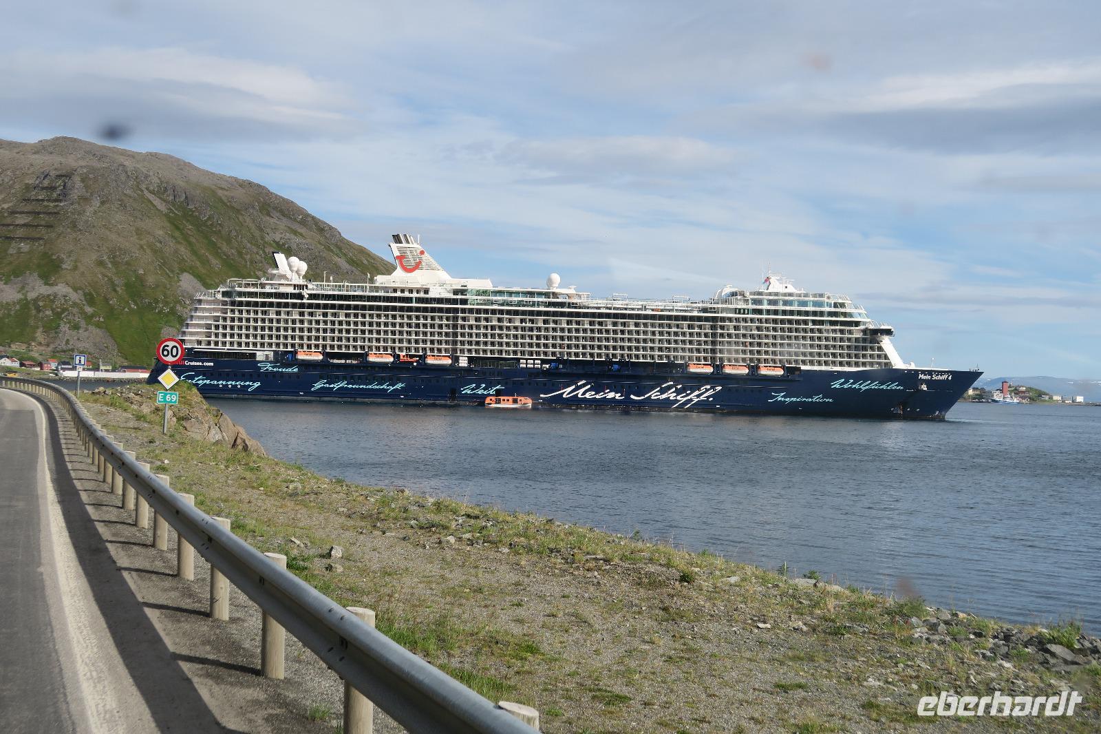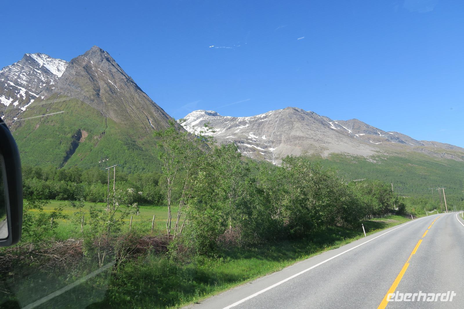 Olderfjord war unser erstes Ziel. Wer gestern noch nichts gekauft hatte konnte es nun nachholen. Das Wetter schon am Morgen über 20 Grad.