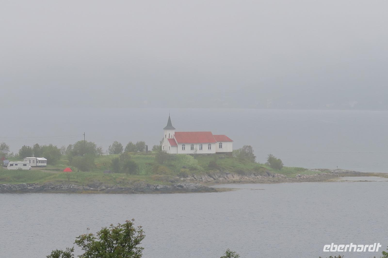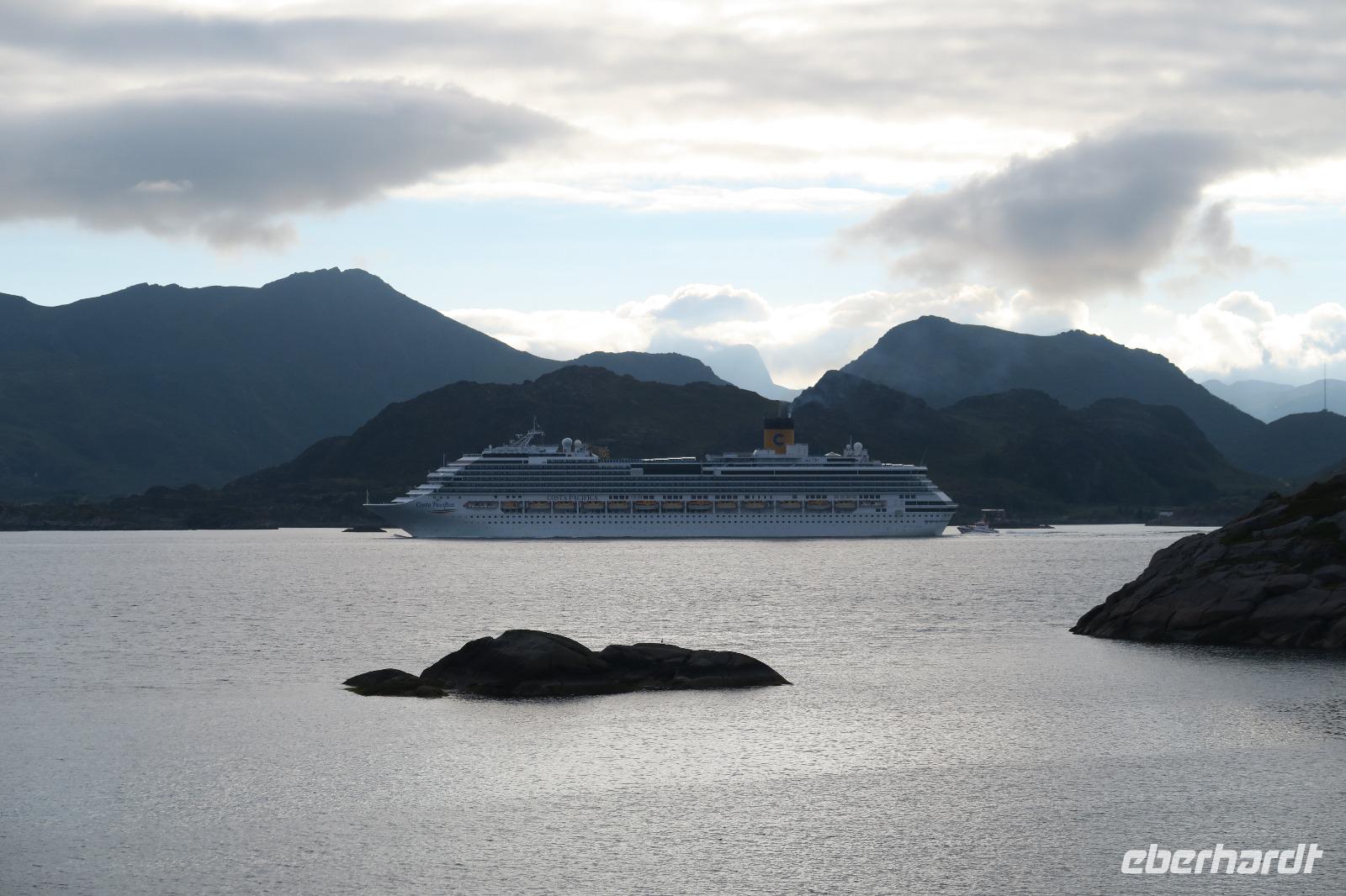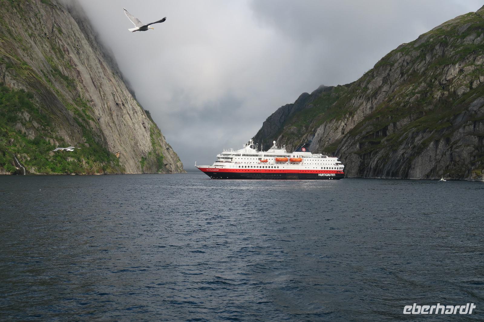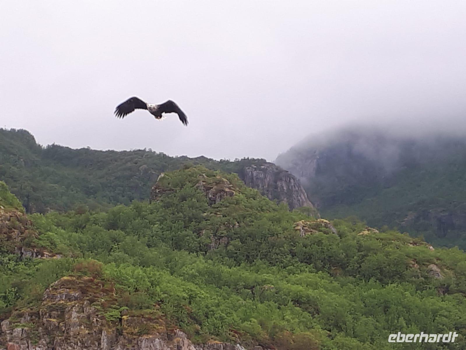 Auch heute beim Start schönes Wetter. Das sollte sich aber noch ändern. Das versprochene 5 Sterne Zelt der Sami erreichten wir in einer Baustelle. Hier gab es reichlich und viel zu kaufen. Auch diesmal war die Ren/Elch Wurst der Renner. Nach dem Einkauf ging es dann mit etwas Zeitdruck weiter Richtung Lofoten. Einige Baustellen machten uns das Leben schwer. Dann schlug das Wetter um und Regen und Kälte war angesagt. Wir machten noch einen kleinen Halt auf dem Parkplatz gegenüber Narvik auf einem Berg. Es wurde ungemütlich. An der Tjeldsundbrücke dann ein längerer Halt. Es regnete stark. So ging es zu den Lofoten über die Inseln der Vesteralen. Nachdem der Regen nach ließ, hielten wir noch für einen Fotostopp in Sildpollnis gegenüber einer Kirche. Unser Ziel war dann der Hafen in Svolvaer. Hier hatten wir ein Schiff gebucht, das uns zu dem Trollfjord fahren sollte und dann wieder zurück. Das Ganze als Seeadler Safari.Das Wetter war schrecklich. Kaum Sichten aber wenigstens keinen Regen.So fuhren wir dann los und trafen unterwegs einen Kreuzfahrer sowie ein Hurtigrouten Schiff. Dann passierte das Wunder. Als wir in den Trollfjord einbogen, riss der Himmel auf und die Sonne schien. Gleichzeitig kam das Hurtigrouten Schiff in den Fjord und drehte dann auch noch vor uns im Sonnenschein. Besser konnte es nicht sein.