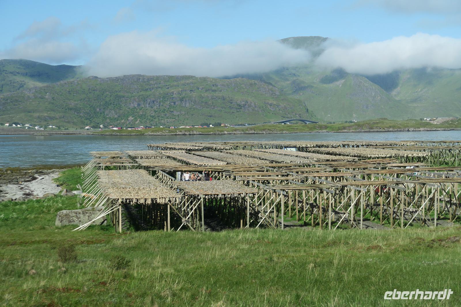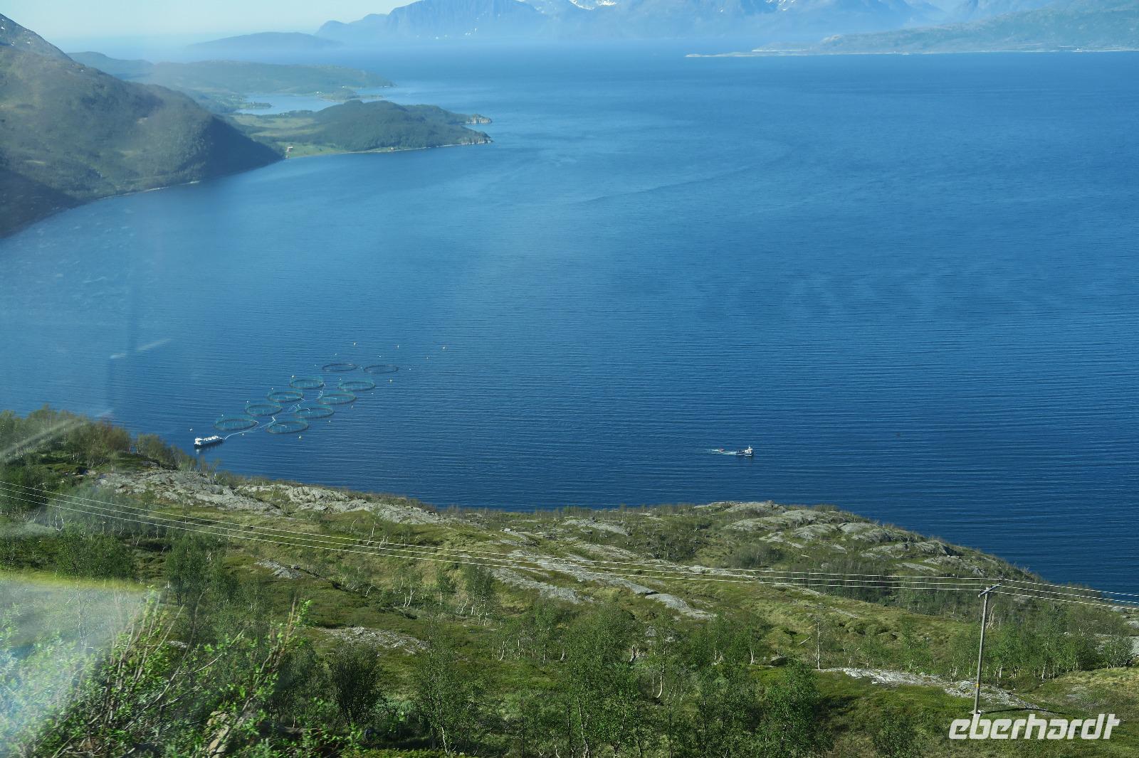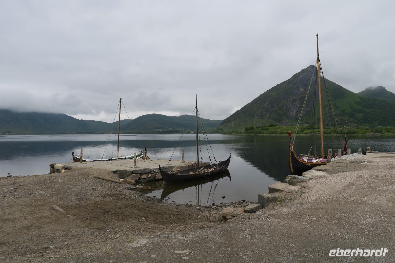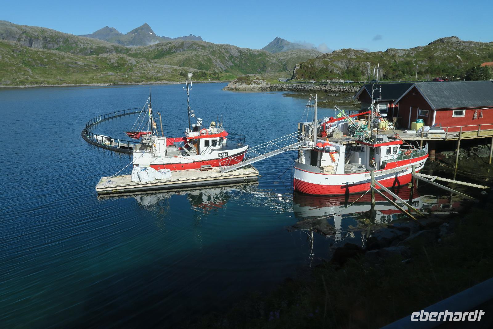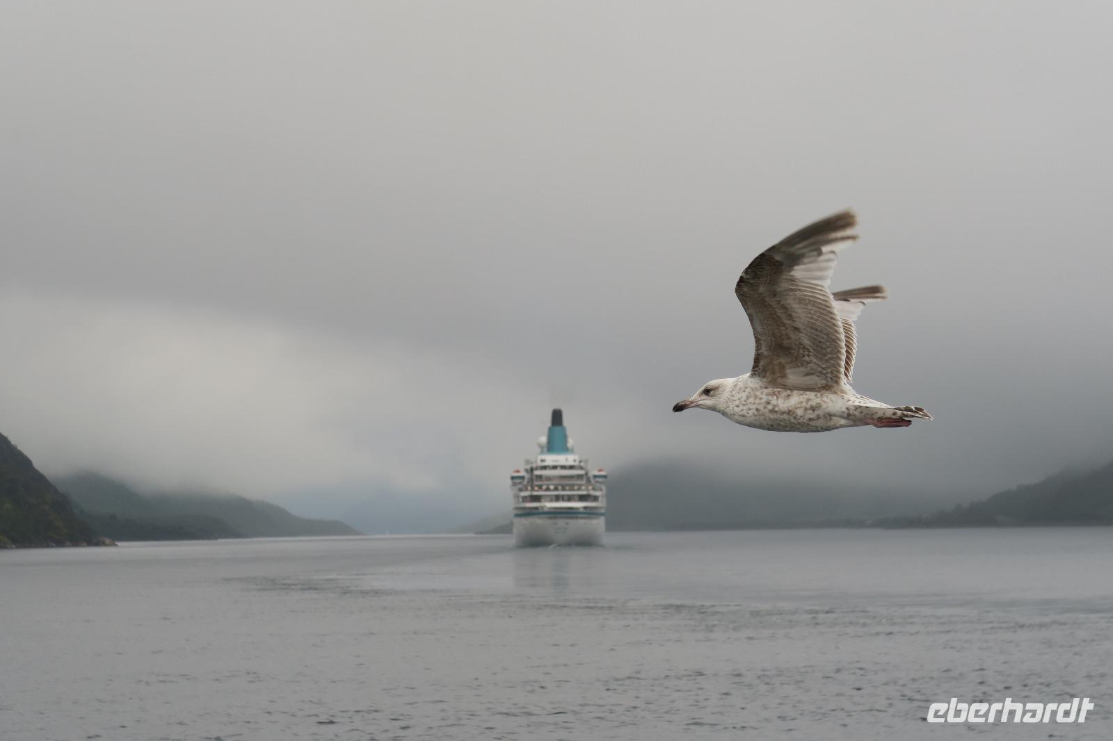 Auch heute beim Start schönes Wetter. Das sollte sich aber noch ändern. Das versprochene 5 Sterne Zelt der Sami erreichten wir in einer Baustelle. Hier gab es reichlich und viel zu kaufen. Auch diesmal war die Ren/Elch Wurst der Renner. Nach dem Einkauf ging es dann mit etwas Zeitdruck weiter Richtung Lofoten. Einige Baustellen machten uns das Leben schwer. Dann schlug das Wetter um und Regen und Kälte war angesagt. Wir machten noch einen kleinen Halt auf dem Parkplatz gegenüber Narvik auf einem Berg. Es wurde ungemütlich. An der Tjeldsundbrücke dann ein längerer Halt. Es regnete stark. So ging es zu den Lofoten über die Inseln der Vesteralen. Nachdem der Regen nach ließ, hielten wir noch für einen Fotostopp in Sildpollnis gegenüber einer Kirche. Unser Ziel war dann der Hafen in Svolvaer. Hier hatten wir ein Schiff gebucht, das uns zu dem Trollfjord fahren sollte und dann wieder zurück. Das Ganze als Seeadler Safari.Das Wetter war schrecklich. Kaum Sichten aber wenigstens keinen Regen.So fuhren wir dann los und trafen unterwegs einen Kreuzfahrer sowie ein Hurtigrouten Schiff. Dann passierte das Wunder. Als wir in den Trollfjord einbogen, riss der Himmel auf und die Sonne schien. Gleichzeitig kam das Hurtigrouten Schiff in den Fjord und drehte dann auch noch vor uns im Sonnenschein. Besser konnte es nicht sein.