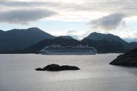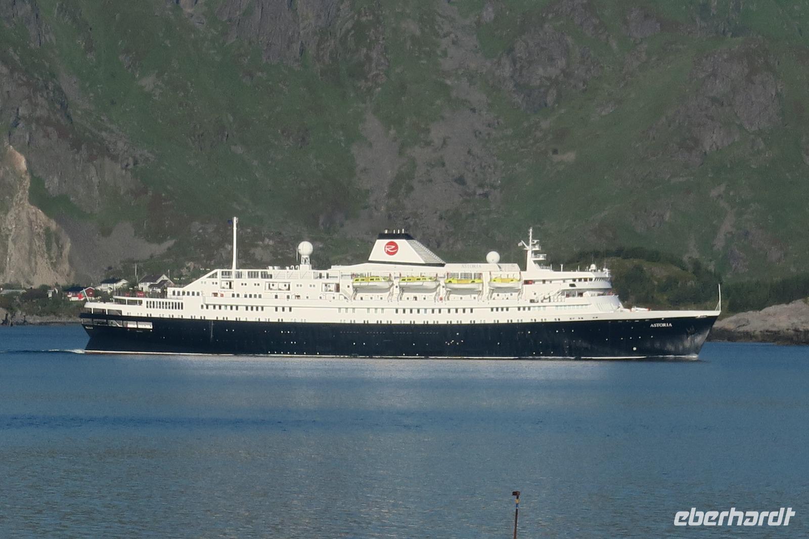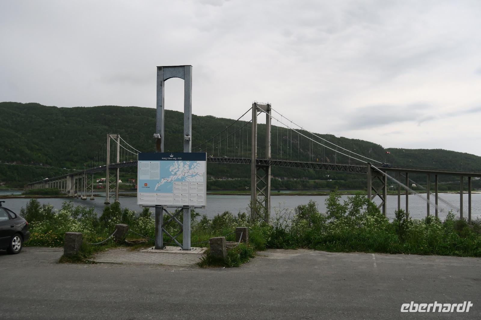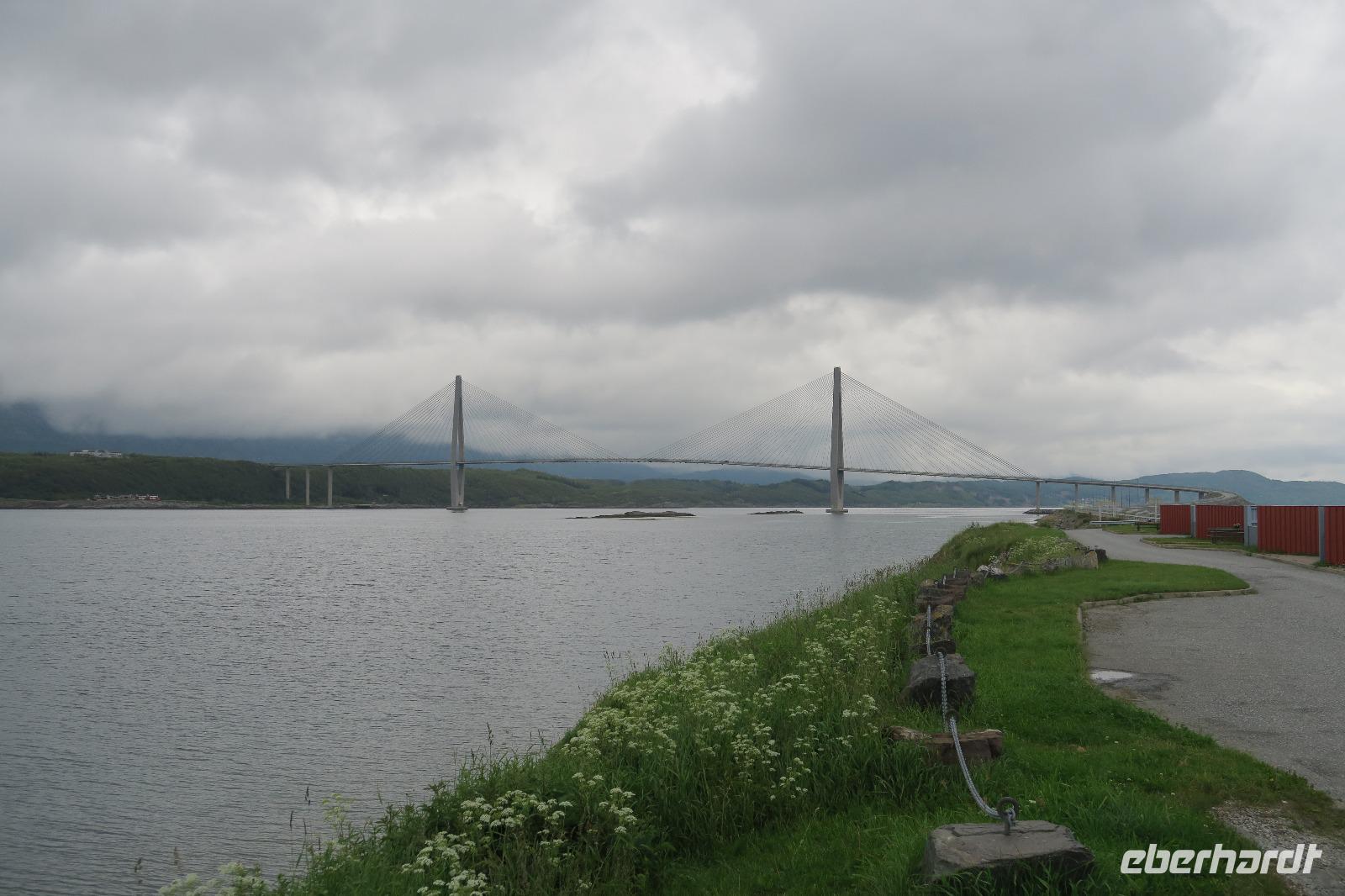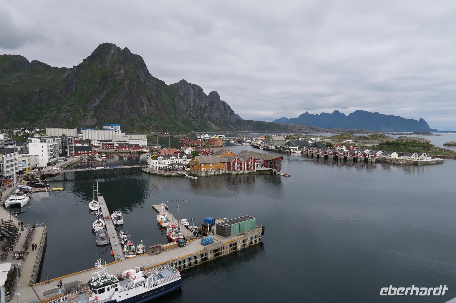 Auch heute beim Start schönes Wetter. Das sollte sich aber noch ändern. Das versprochene 5 Sterne Zelt der Sami erreichten wir in einer Baustelle. Hier gab es reichlich und viel zu kaufen. Auch diesmal war die Ren/Elch Wurst der Renner. Nach dem Einkauf ging es dann mit etwas Zeitdruck weiter Richtung Lofoten. Einige Baustellen machten uns das Leben schwer. Dann schlug das Wetter um und Regen und Kälte war angesagt. Wir machten noch einen kleinen Halt auf dem Parkplatz gegenüber Narvik auf einem Berg. Es wurde ungemütlich. An der Tjeldsundbrücke dann ein längerer Halt. Es regnete stark. So ging es zu den Lofoten über die Inseln der Vesteralen. Nachdem der Regen nach ließ, hielten wir noch für einen Fotostopp in Sildpollnis gegenüber einer Kirche. Unser Ziel war dann der Hafen in Svolvaer. Hier hatten wir ein Schiff gebucht, das uns zu dem Trollfjord fahren sollte und dann wieder zurück. Das Ganze als Seeadler Safari.Das Wetter war schrecklich. Kaum Sichten aber wenigstens keinen Regen.So fuhren wir dann los und trafen unterwegs einen Kreuzfahrer sowie ein Hurtigrouten Schiff. Dann passierte das Wunder. Als wir in den Trollfjord einbogen, riss der Himmel auf und die Sonne schien. Gleichzeitig kam das Hurtigrouten Schiff in den Fjord und drehte dann auch noch vor uns im Sonnenschein. Besser konnte es nicht sein.