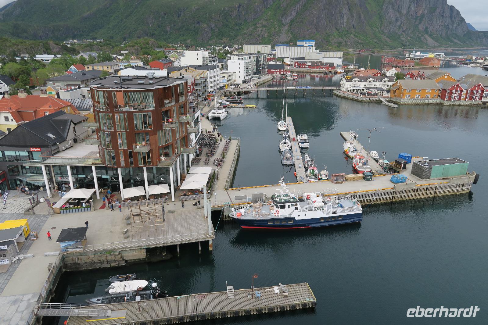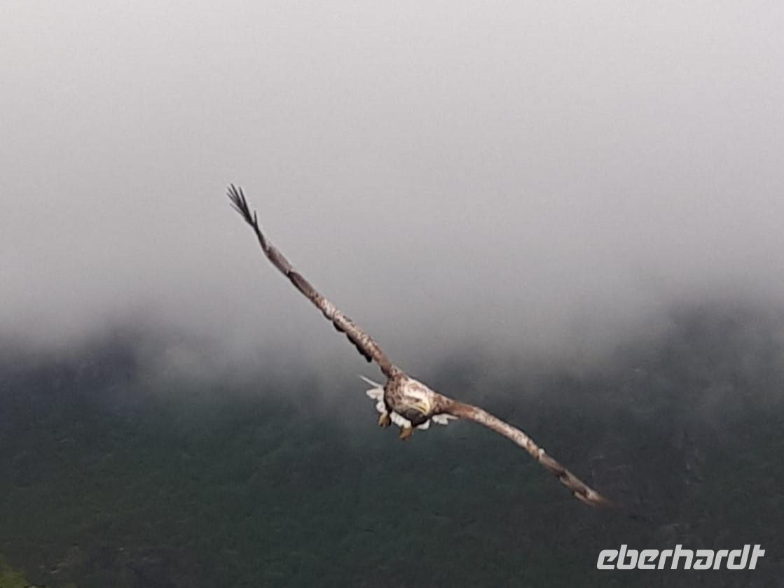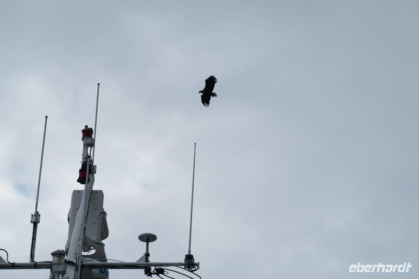 Jetzt fehlten nur noch Adler. Das Wetter hielt sich noch, obwohl die Sonne nur noch selten zu sehen war. Und dann passierte auch noch das Wunder. 3 Seeadler haben wir gesehen und fotografiert. Diese wurden erst durch die Möwen angelockt, die von der Besatzung gefüttert wurden. Dadurch werden Adler aufmerksam und kommen dann um sich einen Fisch zu holen. So waren alle glücklich und zufrieden. Das Wetter hielt und so ging es dann auch zum Bus in Svolvaer zurück. Auf der Fahrt zum Hotel Rorbusenter wurde das Wetter immer besser. Bei der Ankunft wieder Sonnenschein. Nach dem Abendessen ging es an die Verteilung der Häuser. Nach langer Vorbereitung am Tage klappte das dann ganz schnell. Alle waren mit ihren Entscheidungen zufrieden und so ging auch dieser schöne Tag zu Ende.