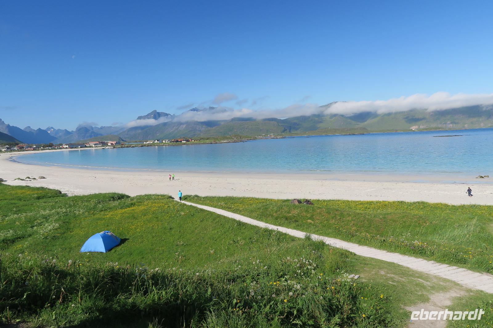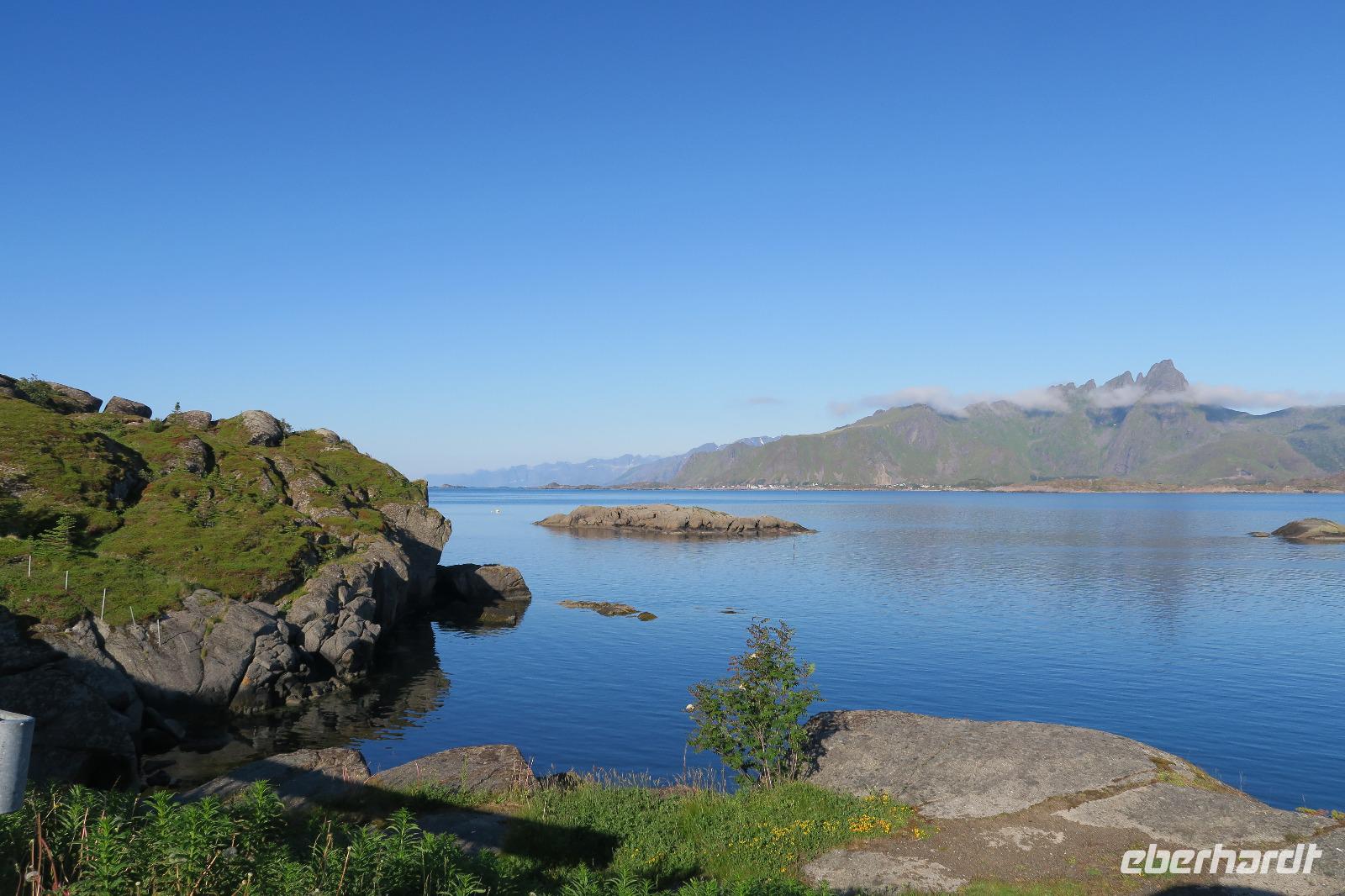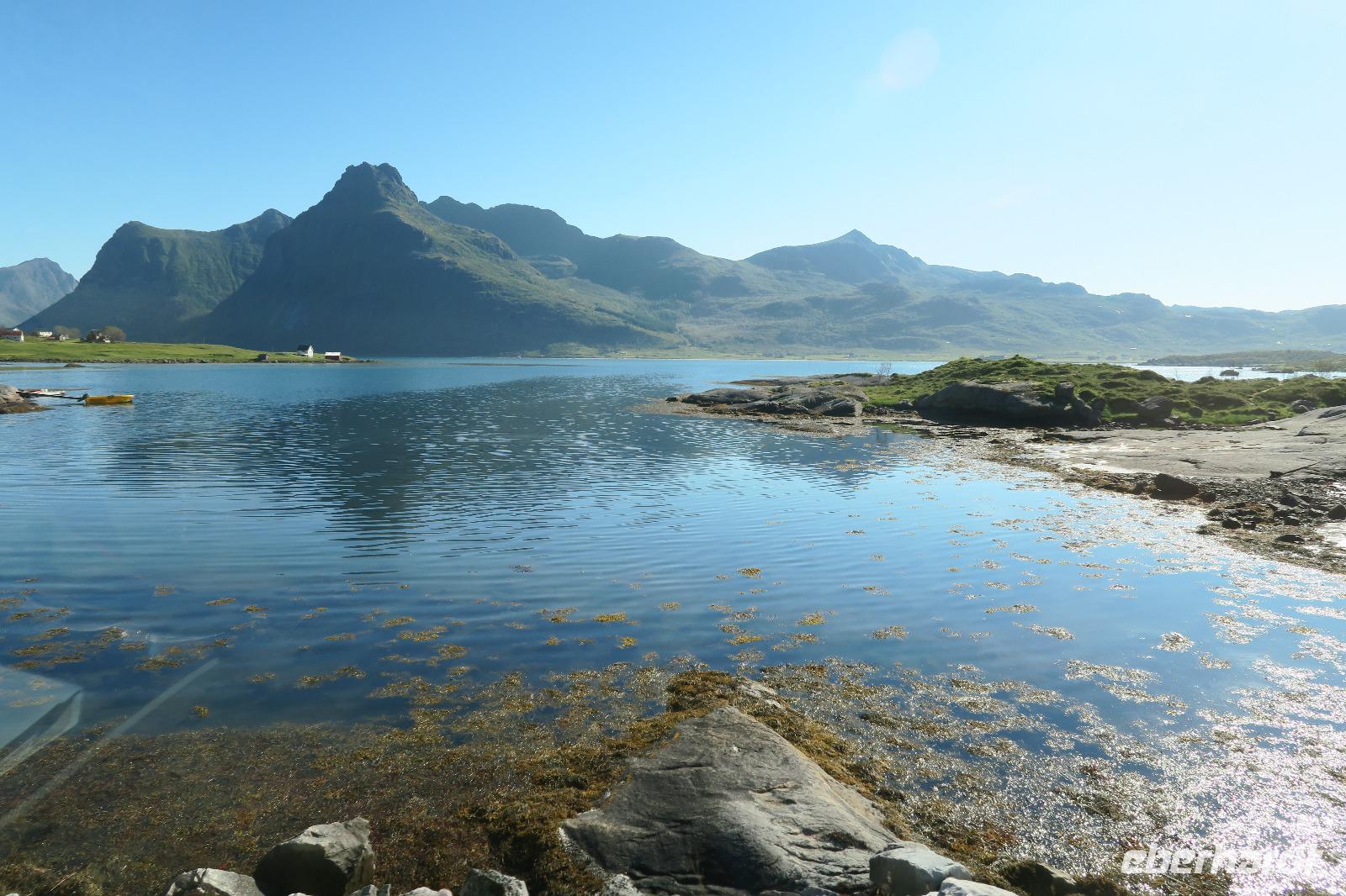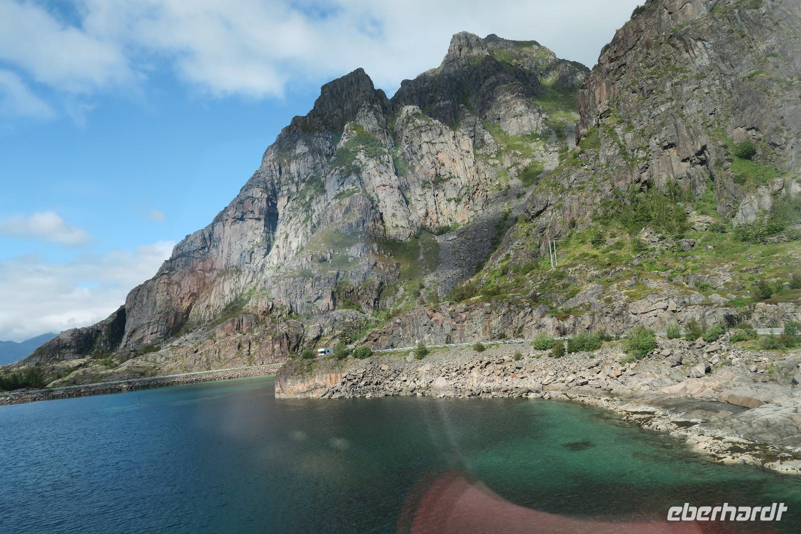 Bei herrlichem Wetter ging es zu unserer Fähre. Die Fahrt ging durch den schönsten Teil der Lofoten. Bilderbuchwetter Bilderbuchfotos. Wir konnten unser Glück kaum glauben. Unterwegs gab es einige Fotostopps. Besonders der Strand war super. An der Fähre angekommen kam diese auch schon.