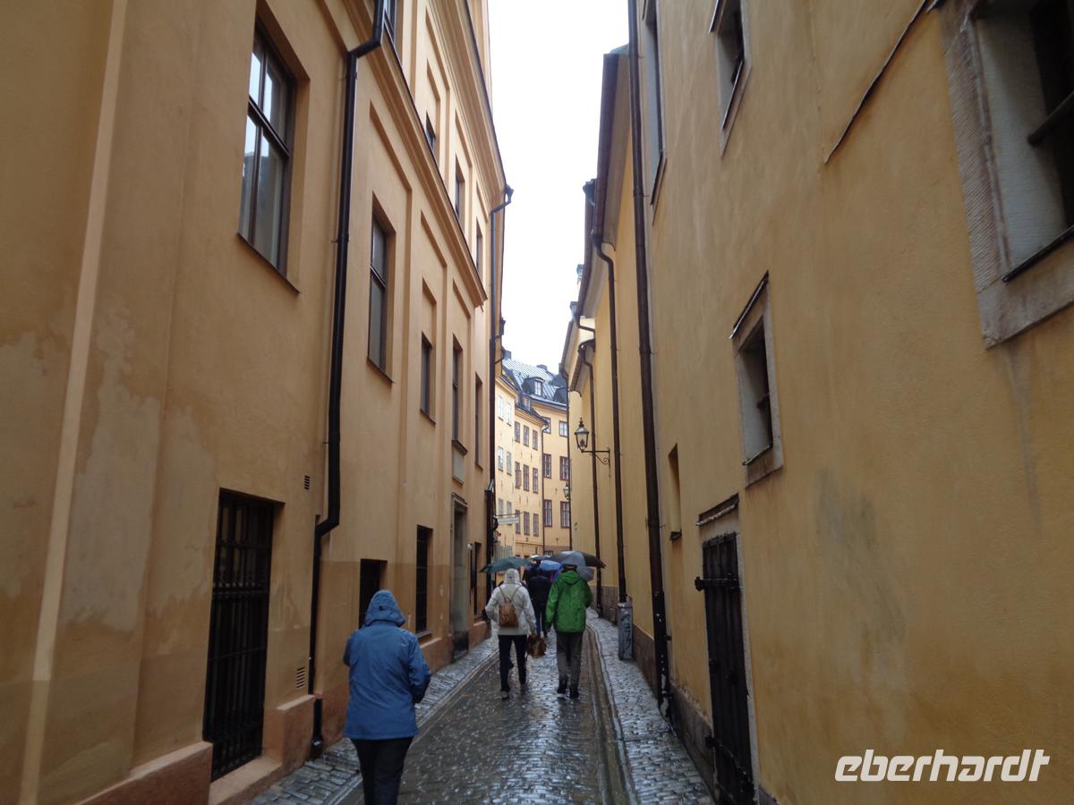 Nach dem Frühstück an Bord passieren wir die Festung Nya Älvsborg vor Göteborg und gehen in Schwedens zweitgrößter Stadt an Land. Wir brechen sofort nach Norden auf und bald liegt die fast 600000 Einwohner zählende Großstadt hinter uns. Schweden empfängt uns heute bei strömenden Regen, der den gesamten Tag nicht gänzlich aufhören möchte. Nach einer ersten Pause beim kleinen Städtchen Ulricehamn erreiochen wir am Mittag in Jönköping den Vätternsee, Schwedens zweitgrößten See. Wir pausieren oberhalb von Gränna bei einer Zuckerstangenfabrik, wo die leckeren Polkagrisa hergestellt werden, die weit über Schwedens Grenzen hinaus bekannt sind. Wer möchte, kann auch die berühmten Zuckerstangen hier ab Werk erwerben. Etwas Süßes schmeckt ja zum ausgeschenkten Kaffee nochmal so gut. Mittags erreichen wir den größten Runenstein Schwedens in Rök. 3,84 m ist er hoch und besitzt eine außergewöhnlich lange Runeninschrift; mit weit über 700 Zeichen ist sie die längste Schwedens. Mit diesen Eindrücken erreichen wir gegen Abend unser Hotel in Schwedens Hauptstadt, wo 6 Fluggäste schon auf uns warten. Nun ist die Gruppe vollzählig, und mit 36 Gästen schon recht groß. Bei einem leckeren Abendbüffet beschließen wir diesen erlebnisreichen Tag.