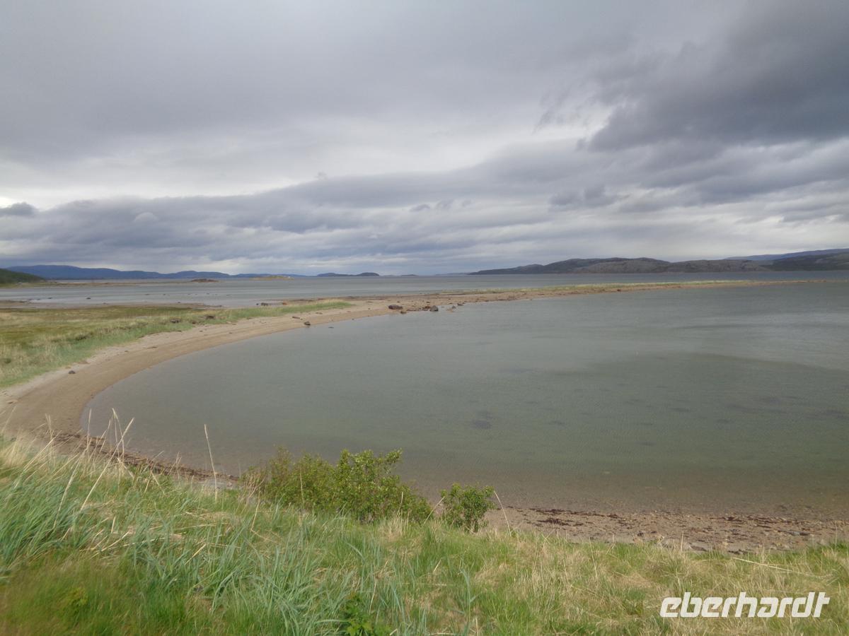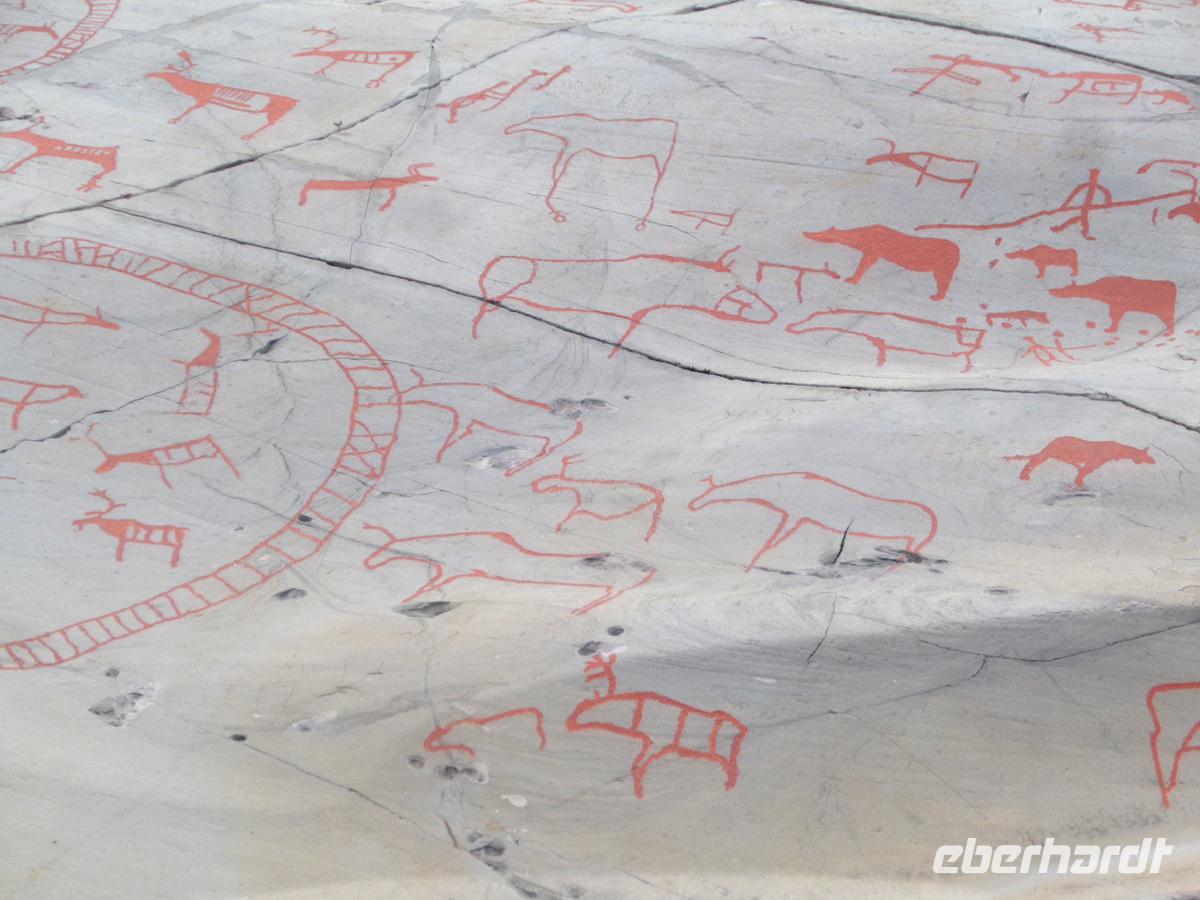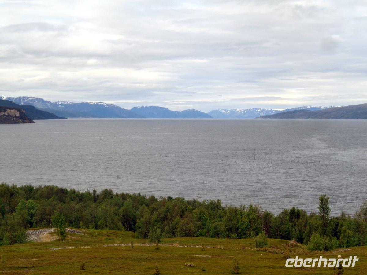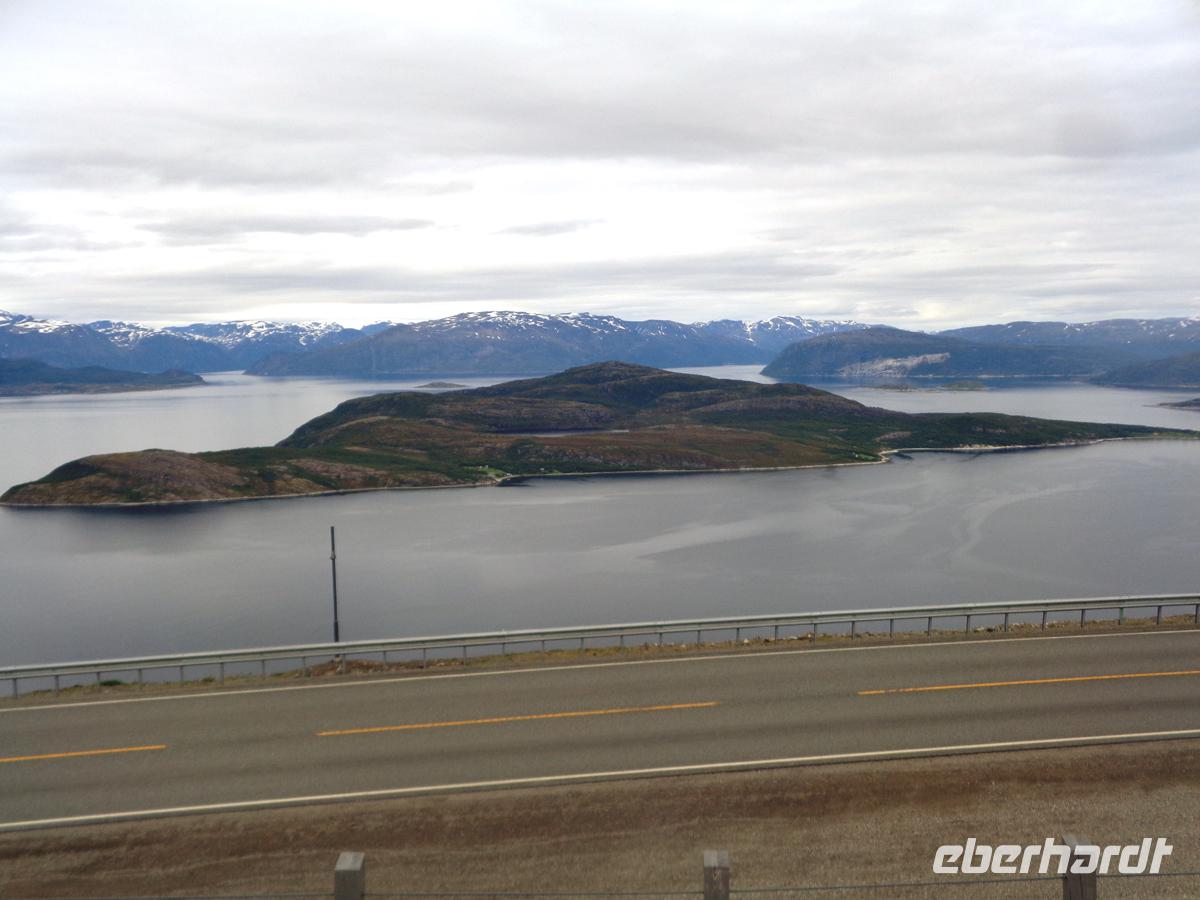 Am Olderfjord vorbei und durchs Sennalandet begeben wir uns heute nach einer sehr kurzen Nacht in die Landschaft Hjemmeluft ins Alta Museum am gleichnamigen Fjord. Hier sind uralte Felsritzungen zu bestaunen. Sie haben ein Alter von etwa 2000 bis 6500 Jahren. Jüngere Ritzungen sind nicht bekannt. Die Zeichnungen befinden sich etwa 8,5 m bis 26,5 m über dem Meeresspiegel und wurden in jene Felsen geritzt, die der damaligen Wasserlinie am nächsten lagen. Seit dem Ende der Eiszeit, als das Inlandeis verschwand, hob sich die Landmasse Norwegens stetig. Entsprechend sind die ältesten Ritzungen diejenigen, die am weitesten vom Meer entfernt liegen. Wegen der großen Bedeutung dieser Fundstätte steht sie seit 1985 auf der Welterbeliste. Nach einem langen Weg am Langfjord vorbei erreichen wir den Kvänangenfjord und befahren mit 402 m den höchsten Pass Nordnorwegens. Hier befindet sich der Aussichtspunkt und die Raststätte Gildetun. Hier liegen noch Schneefelder, und die Aussicht auf die Insel Skodra mitten im Fjord ist klar und schön. So lassen wir uns leckeren Kuchen in der hiesigen Gaststätte schmecken. Unser Abendessen nehmen wir im gemütlichen, familiengeführten Hotel in Oteren ein. Auch hier in Oteren sind die Nächte durchgehend taghell.