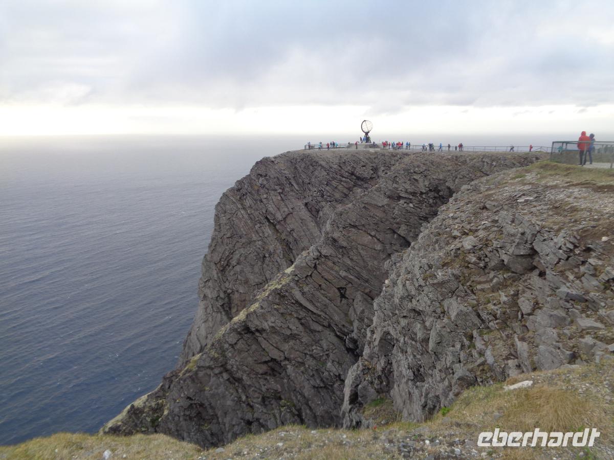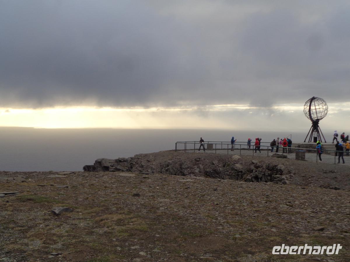 Kurz nach unserer Abfahrt vom Hotel erreichen wir den Inarisee, den größten See Finnlands. Mit seinen mehr als 3000 Inseln wirkt er mitunter weniger wie ein See, denn als ein Flußlabyrinth. Über seinem Ufer liegt die Bärenhöhle, ein Monolith, der durch Wasser der Eiszeitgletscher ausgehöhlt worden und umgedreht wurde ist. Mächtige Findlinge liegen in dem Wald um ihn herum verstreut. Hinter der Stadt Inari erreichen geht die Landschaft langsam in die Birkenwaldzone über. Dieser Baum, die Birke ist hier mitunter bis zum Horizont die einzige Pflanze. Dieser Vegetationsgürtel überzieht ganz Nordskandinavien bis nach Russland hinein. Aber die Birken haben hier Krüppelformen ausgebildet, was am kalten Klima liegt und sind selten höher als 3 m. Der Inarijoki bildet die Grenze zwischen Norwegen und Finnland. Wir gehen zu Fuß hinüber. Nun stellen wir die Uhr wieder zurück und tauschen in Karasjok am Samenzentrum zunächst noch norwegische Kronen ein. Über die Hochebene Finnmarksvidda und entlang des Porsangerfjords, wo wir bei einem Photostop die leckere Moltebeermarmelade verkosten erreichen wir späten Nachmittag die Insel Mageröy. Hier liegt unser Hotel mitten in der tundraartigen Landschaft. Eisig pfeift der starke Wind über die karge Landschaft, in der Moose und Flechten die höchsten Gewächse darstellen, und kleine Schneefelder immer noch nicht weggetaut sind.Nachdem wir unser Abendessen eingenommen haben, geht es gegen 21 Uhr auf zum Kap. Um Mitternacht ist es auf dem Schieferfelsen am Nordmeer noch taghell. Im der Nordkaphalle werden Filme gezeigt und viel zur Geschichte des Kaps ist überdies zu erfahren. Als wir gegen 0.15 Uhr unsere Nordkapdiplome erhalten, steht die Mitternachtssonne hell am Himmel. Welch ein Anblick! Erst gegen ein Uhr sind wir wieder im Hotel.