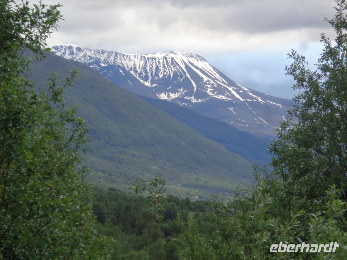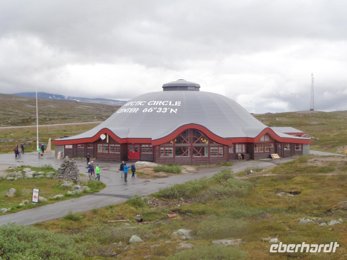 Auf der Reise zu unserer Fähre stoppen wir zunächst an der 1780 erbauten alten Holzkirche von Flagstad. Der Zufall will es, dass gerade die Küsterin dort ist und so können wir sie auch von innen besichtigen. Kurz darauf sehen wir noch zehntausende von Stockfischen an den Holzgerüsten, den so genannten Hjellern neben der Straße hängen. Auch das muss natürlich als typisch für die Lofoten festgehalten werden. Nach einem letzten Photostop oberhalb von Reine besteigen wir in Moskenes die Fähre und nehmen Abschied von der Inselgruppe, die so wild gebirgig ist und ein unwahrscheinlich klares Licht mit kräftigen Farben hat, aber auch mal Starkregen und Orkan. Wir legen in Bodö an und begeben uns auf den langen Weg nach Süden. Durch das Saltdalen, das Lönsdalen und das Dunderlandsdalen geht die Reise. Rechts und links befinden sich die Höhen des Saltfjells, auf dem sich zusammen mit dem Svartisengebirge einer der großen Nationalparks Norwegens befindet. Das Saltdalen führt uns auch über eine geraume Strecke auf das Fjell, wo zunächst mit zunehmender Höhe die Birken zwergwüchsiger werden, dann ganz verschwinden und ausgedehnten Schneefeldern weichen. Hier queren wir auch wieder den Polarkreis und statten dem norwegischen Polarkreiszentrum einen Besuch ab. Am Abend erreichen wir die Industrie- und Eisenstadt Mo i Rana, die seit über 100 Jahren weitestgehend von der Schwerindustrie lebt.