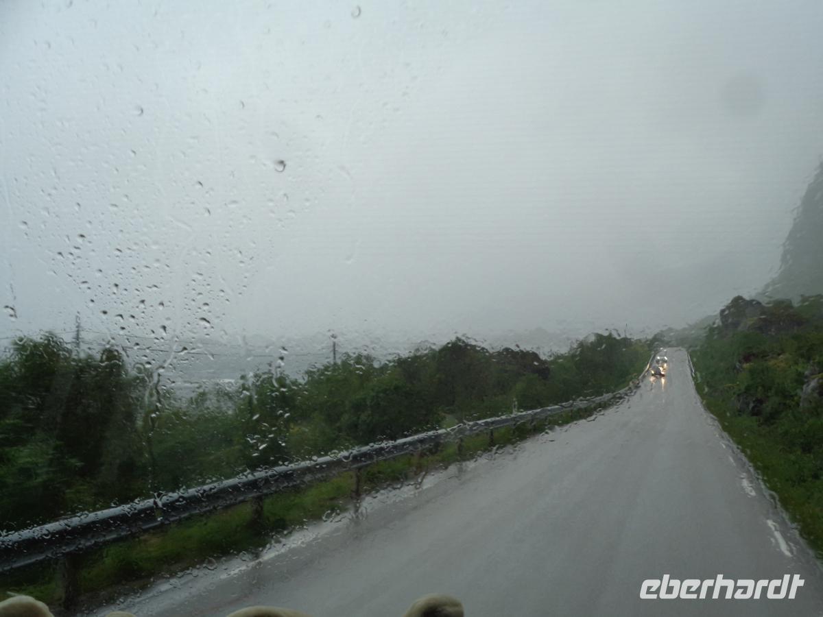 Unsere Reise führt uns heute zunächst am Balsfjord und dem Lyfjell vorbei bis nach Narvik. Vorher unternahmen wir einen Photostop oberhalb des Gratangenfjords. Zu Mittag erreichen wir die Tjellsundbrücke, welche seit 1968 mit 1100 m Länge das Festland mit den Vesteralen verbindet. Die Vesterålen sind eine Inselgruppe etwa 300 km nördlich des Polarkreises vor der Küste Norwegens. Sie schließen nordöstlich an die bekannteren Lofoten an. An der Tjellsundbrücke erreicht uns die Nachricht, dass wegen des heutigen Orkans mit Windspitzen von 117 kmh, die Hurtigrutenlinie weder in den Trollfjord fährt, noch den Hafen in Svolvaer anlaufen wird. Es ist einfach zu gefährlich zum Manövrieren. Ein klassischer Fall von höherer Gewalt. Auch an Land ist es mittlerweile gefährlich. Wir sehen, wie auf der Tjellsundbrücke Motorradfahrer umgeweht werden und LKW´s mit nur 10 kmh gegenseitig in ihrem Windschatten fahren, um sich Schutz zu geben. Als wir die Brücke überqueren, hat unser Chauffeur Mühe, den Bus in der Spur zu halten, selbst bei Schrittempo. Auch danach wird es nicht viel besser. Unser Chauffeur Steffen von Satra hat sich heute mehrmals zusätzlichen Beifall verdient. Und um das Pech perfekt zu machen, geraten wir auch noch in eine Kontrolle des „Statens Vegvesen", das in Norwegen auch für die Überprüfung von Fahrzeugen und deren Fahrern zuständig ist. Aber es ist alles in Ordnung, erfahren wir nach einer guten halben Stunde. Am Nachmittag erreichen wir unser Hotel in Mortsund. Es handelt sich um ein Ensemble von Fischerhütten, sog. Rorbur, die jedoch größtenteils neu errichtet, heutigen Ansprüchen gut genügen. Die meisten von uns wohnen sogar im neuesten und modernsten Trakt. Der Tag war heute wirklich leicht abenteuerlich und wir sind froh, bei dem Orkan und Regen heile angekommen zu sein. Da schmeckt das Abendmenü nochmal so gut, vor allem, weil die Sonne herauskommt und die tollen Lichtverhältnisse sichtbar werden lässt, für welche die Lofoten so berühmt sind.