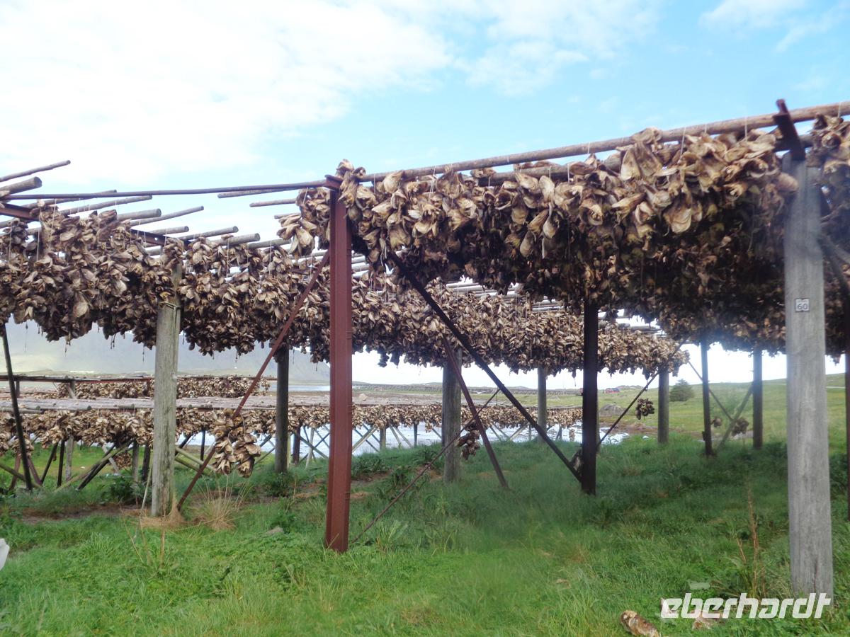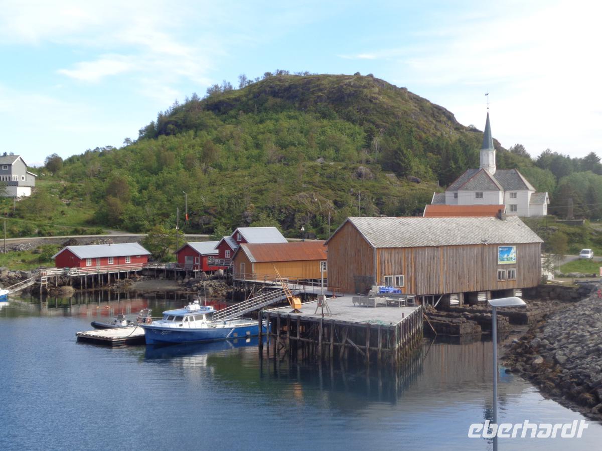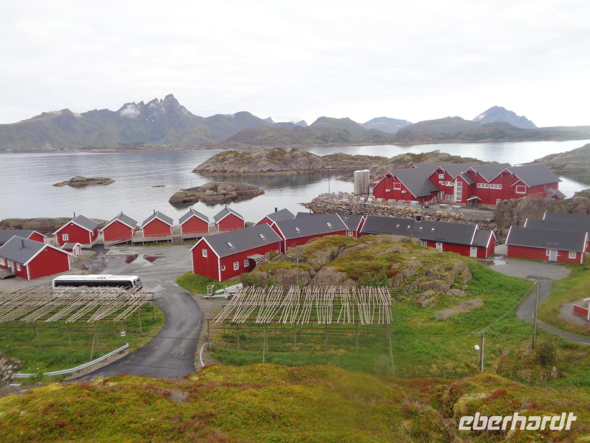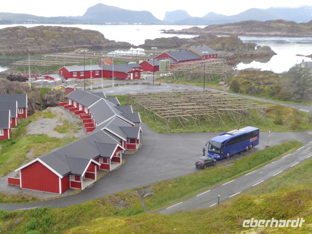 Unsere Rundfahrt über die Lofoten beginnt mit einem authentischen Fischerdorf, welches der ursprüngliche Ort Nusfjord abgibt. Oft liest man, daß Nusfjord auf der Welterbeliste der Unesco steht. Das stimmt jedoch nicht. Trotzdem lohnt ein Besuch dieses kleinen Fischerdorfes, das sich auf der Inselgruppe als eines der ursprünglichsten erhaltenen präsentiert. Ein Höhepunkt ist das Wikingermuseum in Borg. Hier hat man ein nach Originalbefunden ausgegrabenes Häuptlings- und Versammlungshaus aus der Wikingerzeit nachgebaut. Es gibt für uns eine Führung mit einer Suppe, wie sie sicher auch die Nordmänner oft gegessen haben. Ausstellungsräume und ein Film runden den Besuch hervorragend ab. Kurz vor Svolvaer besuchen wir die so genannte Lofotenkathedrale in Kabelvag. Eine Kathedrale ist es nicht. Sie wird nur wegen ihrer Größe so genannt. 1200 Sitzplötze hat sie. Am Nachmittag erreichen wir Svolvaer. Die kleine Stadt ist schnell erkundet. Auf dem zentralen Platz ist Markt und auch eine stattliche Anzahl von Geschäften gibt es im Hauptort der Lofoten zu begucken. Am frühen Abend erhalten wir einen Vortrag über Stockfisch und Lebertran mit Verkostung. Dieser Fisch hat die Lofoten berühmt und reich gemacht. Es gab gar nicht so viele Fischer hier, sodass diese auch für die Fangsaison aus fremden Ländern angeworben wurden. Bis zu 30000 Fischer waren es in den 40er Jahren und prägte den Begriff der Lofotenfischerei.