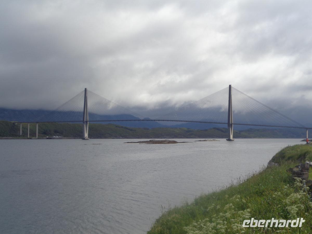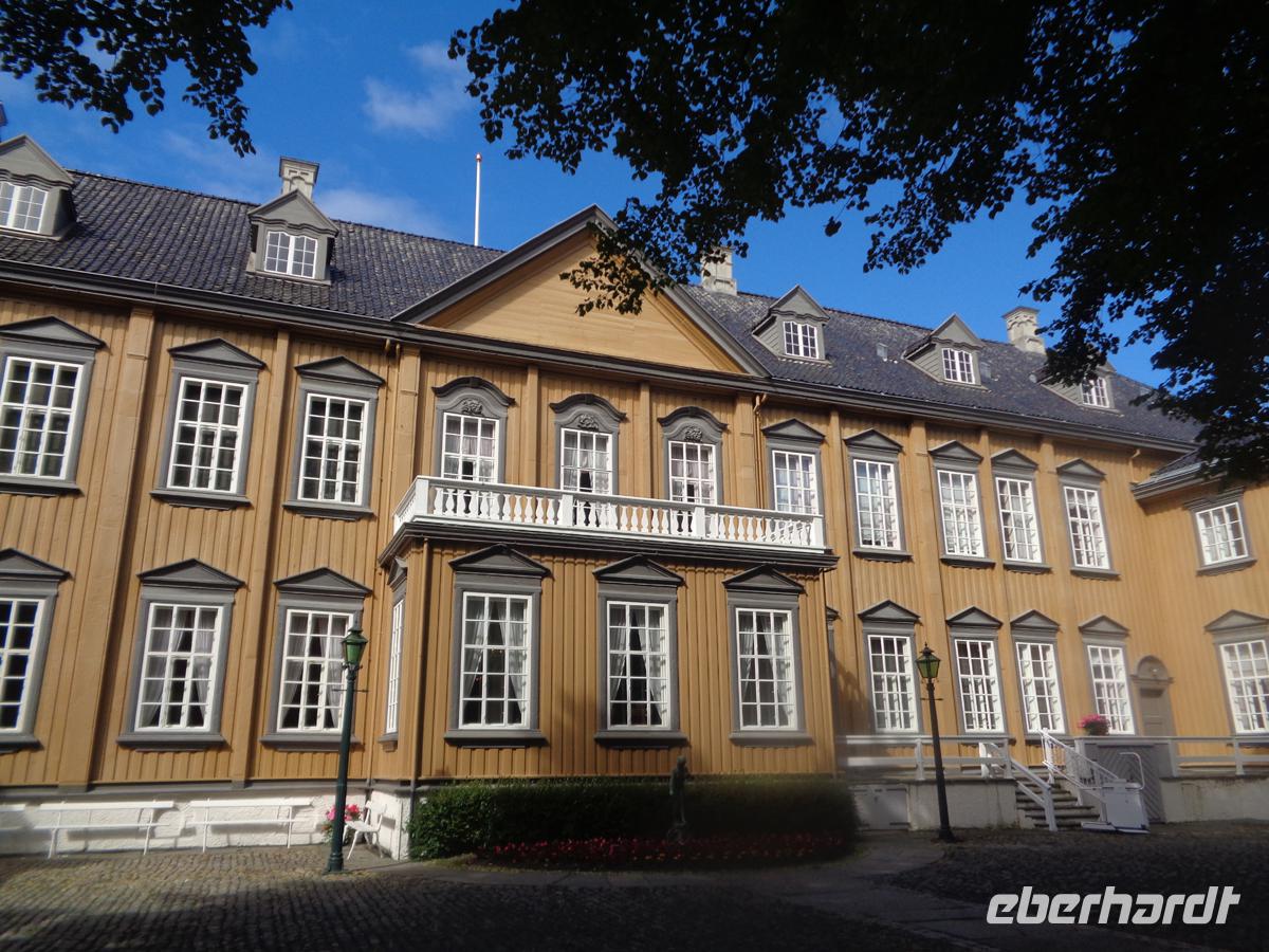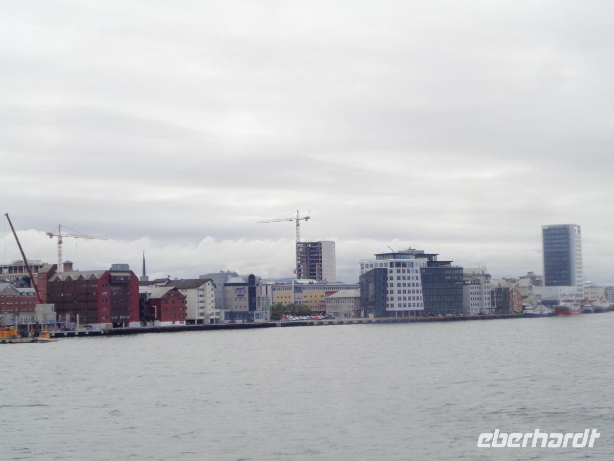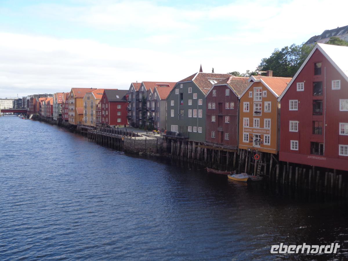 Wir reisen heute durch die historische Landschaft Helgeland, die im Mittelalter sogar einmal ein eigenständiges Königreich war. Zunächst gönnen wir uns einen Aufenthalt an der riesigen Helgelandsbrücke. Danach ist heute richtiges Fjordhüpfen angesagt. Drei Fähren müssen wir benutzen um an unser Ziel zu gelangen. Von Tjötta nach Farvik hat man einen Blick auf die 7 Schwestern, der Sage nach versteinerte Riesenjungfrauen. Diese hüllen sich jedoch heute in dichte Regenwolken. Auch den Torghätten, einen Berg mit einem Loch in der Mitte bekommen wir Gesicht. Leider ist der Winkel von der Straße so ungünstig, dass wir durch das Loch nicht hindurch schauen können. Jedoch halten wir in Sichtweite auf einem schönen Rastplatz und verkosten Klippfisch. Der ist sehr stark gesalzen und nicht jedermanns Sache. Am besten man wässert ihn und macht eine leckerere Fischsuppe daraus. Das wir weiter nach Süden kommen und mit dem Erreichen des Trondelags nun schon in Mittelnorwegen sind, das sieht man auch an den häufiger werdenden Getreidefeldern neben der Straße. Hauptsächlich Roggen wird in diesen kalten Breitengraden angebaut. Unser Hotel befindet sich für die heutige Nacht in Steinkjer am nördlichen Ende eines Nebenfjords des Trondheimfjordes. Es liegt gleich neben dem Rathaus mitten in der Stadt.