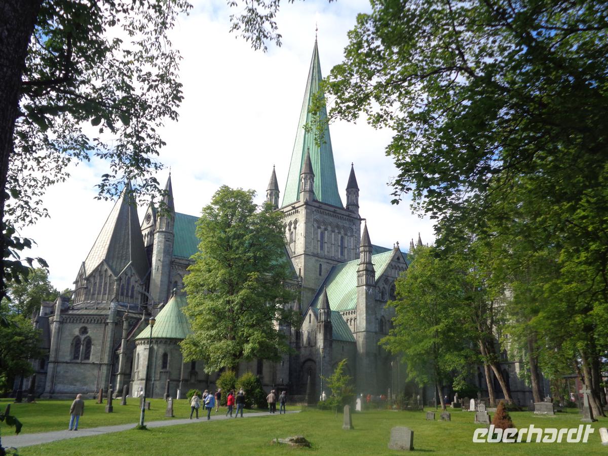 Wir reisen zunächst in die alte Königsstadt Trondheim. Natürlich kann der Nidarosdom besichtigt werden, in dem der heilige Olav 1030 nach seinem Tod in der Schlacht von Stiklestad beerdigt worden ist. Danach ist Zeit für einen Gang an den alten Hafen mit den schön restaurierten Speicherhäusern, sowie auf den Markt, wo die Stadt dem Gründervater König Olav Tryggvasson ein Denkmal gesetzt hat. Durchs Drivatal reisen wir zum Dovrefjell. Noch einmal wird die Landschaft karg und unbewohnt. Weite Flächen sind von der Rentierflechte überwachsen. Der höchste Berg, der Snöhättan zeigt sich uns in voller klarer Pracht. Er ist ein schneebedeckter 2000er und nach den Gipfeln von Jötunheimen der höchste Norwegens. Im milden und recht lieblichen Gudbrandstal angekommen reisen wir weiter dem Süden entgegen. Überfällig ist auch ein Besuch einer Stabkirche. Diese steht in Ringeby. Sie hat zwar geschlossen, aber in frisch saniertem Zustand macht sie auch von außen einen wunderschönen Eindruck. Von den ehemals ca. 750 Stabkirchen sind nur noch 28 gut erhalten. Sie gehören in die Zeit der Christianisierung des Landes im 12. und 13. Jh. Nach dem Besuch der Olympiaschanzen in Lillehammer erreichen wir Hamar, am Mjösasee gelegen, und beenden mit einem reichhaltigen Büffet den letzten kompletten Tag in Norwegen.